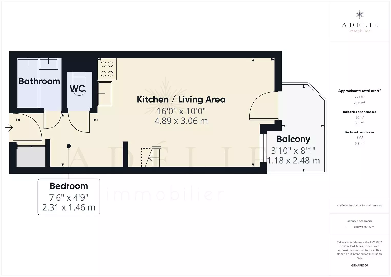 BQA321: MEZZANINE STUDIO FOR 4 PEOPLE, classified 2*, 26 m2, located on the 3rd floor.