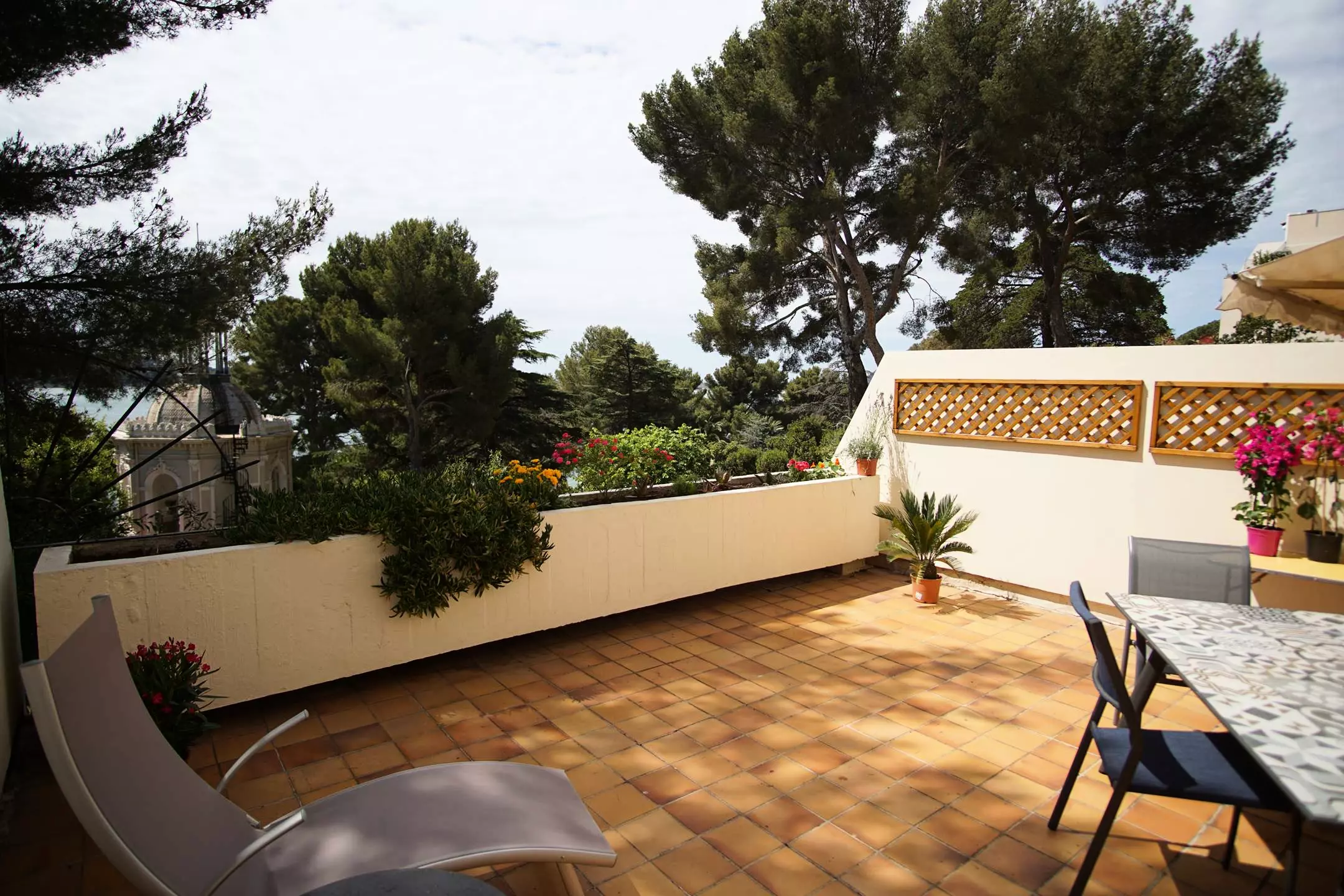 Large terrace with garden furniture, deckchairs