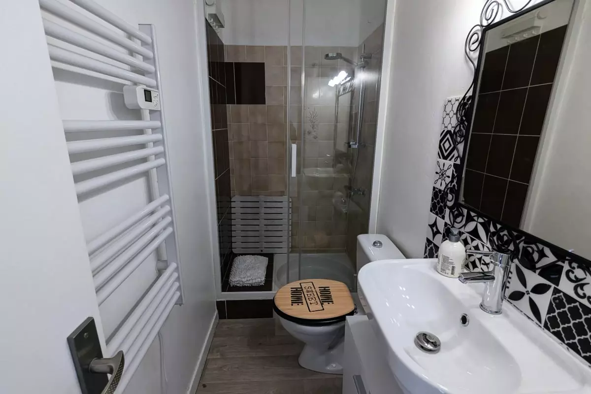 - a bathroom with shower;