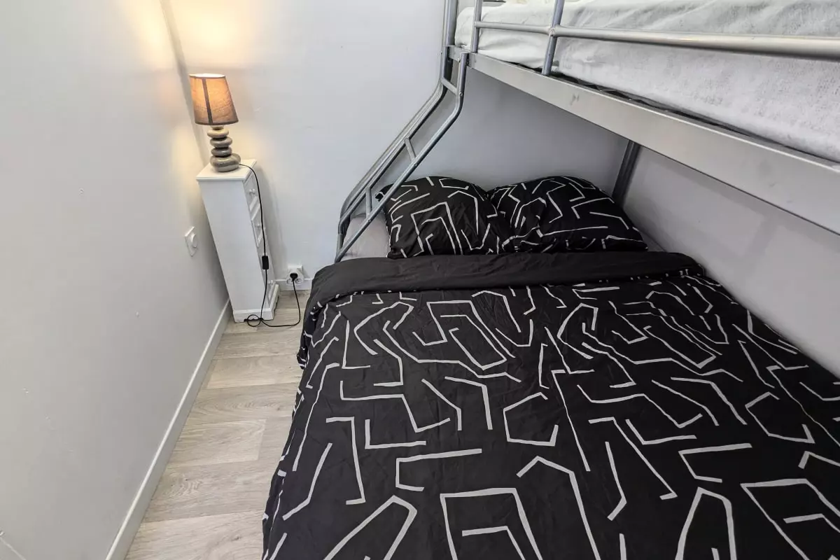 - a sleeping area with a bunk bed (2 places at the bottom and one place at the top);