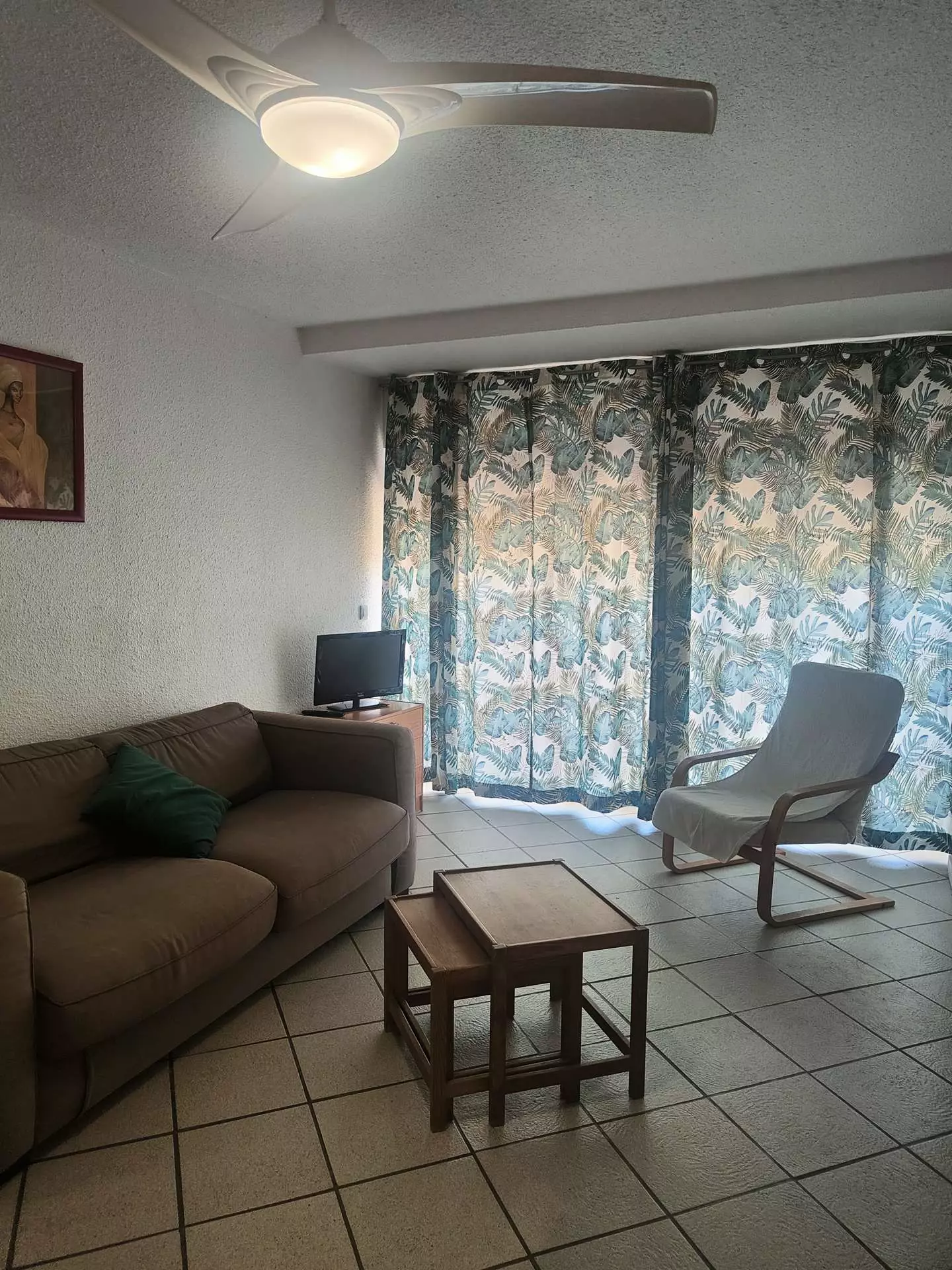 The apartment is functional, with a fitted kitchen opening onto the living room, a bedroom with a closet, and a bathroom with a toilet.