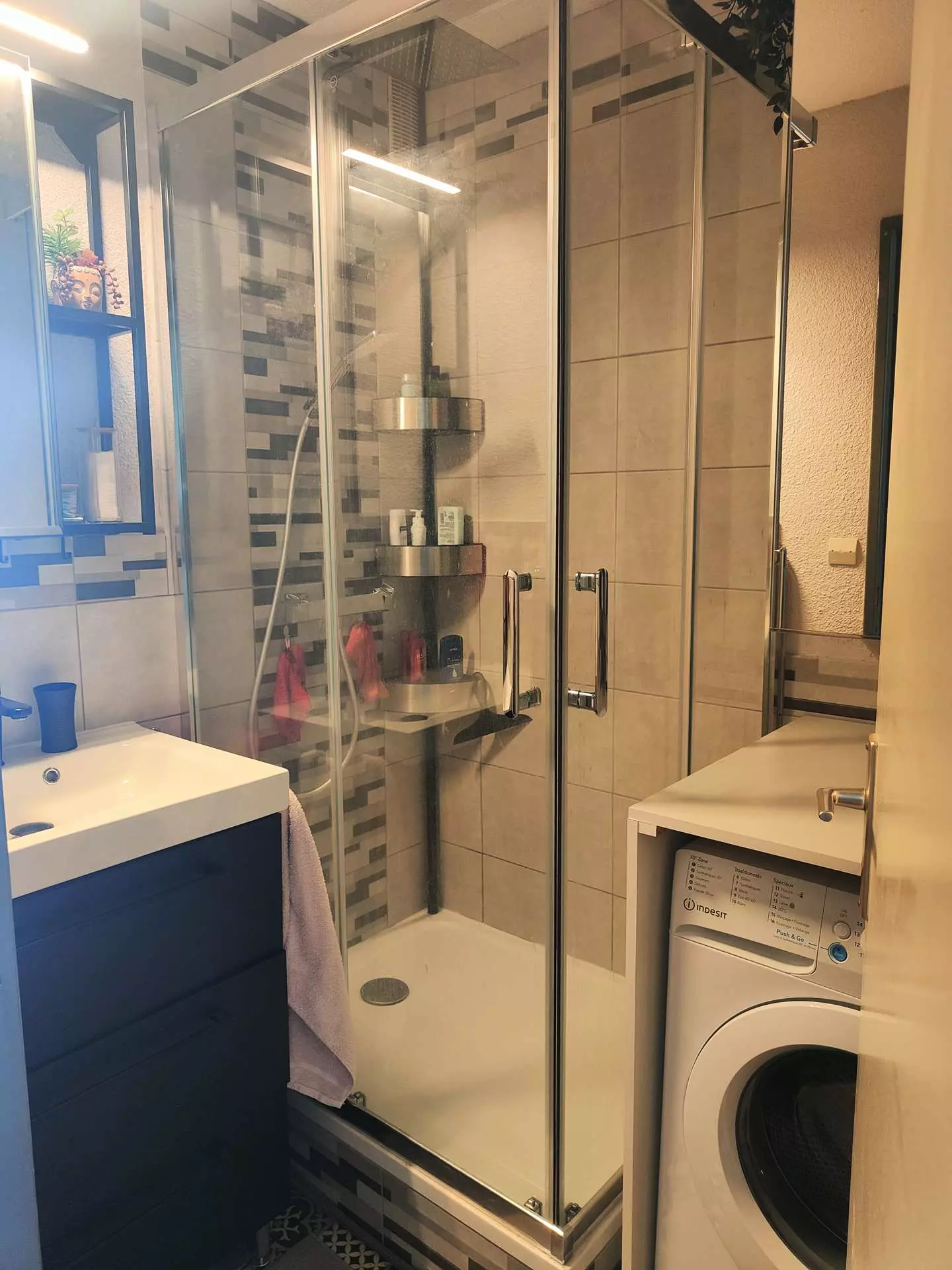 The bathroom has been renovated and is very practical.