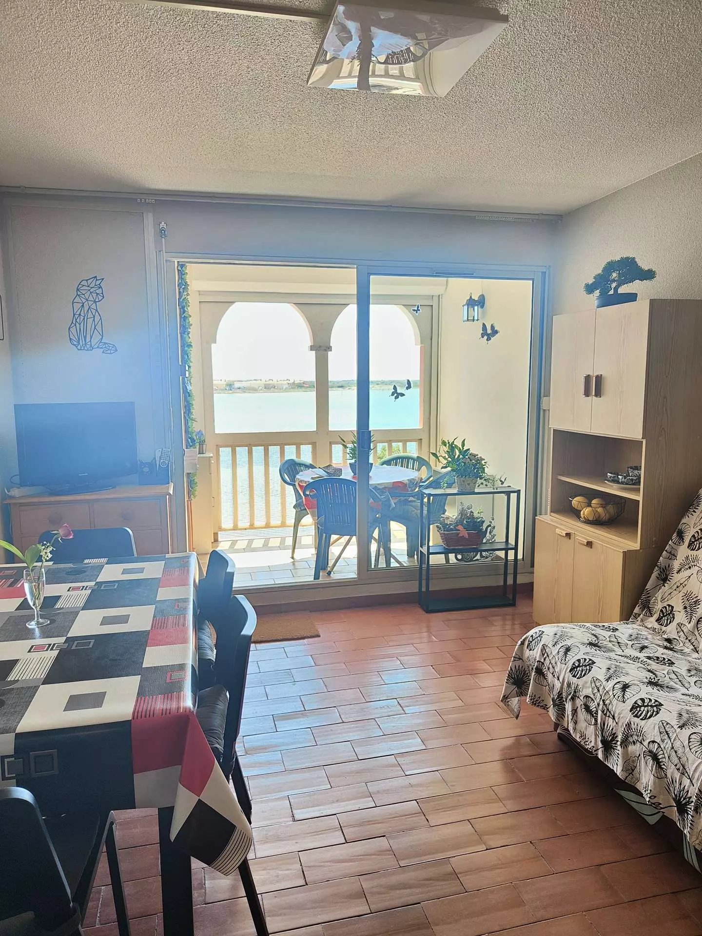 A well-equipped kitchen opens onto the living room and then onto a pretty covered terrace, facing south. The view is superb: you will eat or have your snacks facing the Salses-Leucate pond, and you will also enjoy the view of Mont-Canigou, dear to the Catalans.