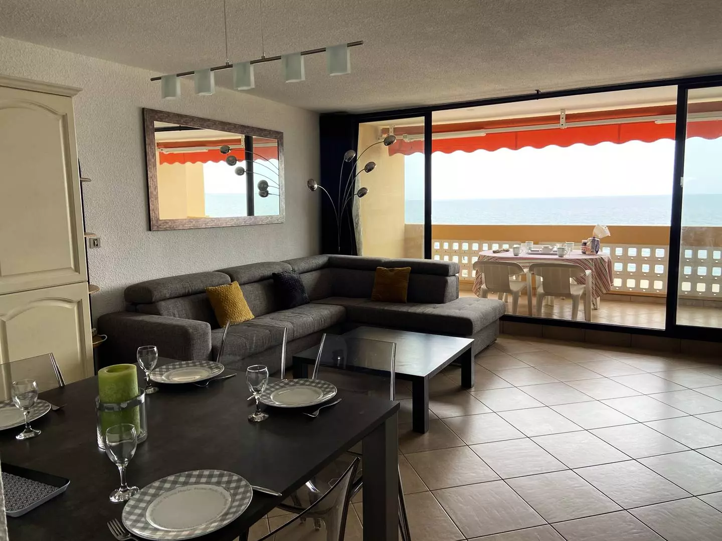 A fully equipped kitchen, oven, electric hob, large refrigerator, freezer compartment, dishwasher, beautiful opening onto a terrace with sea view.