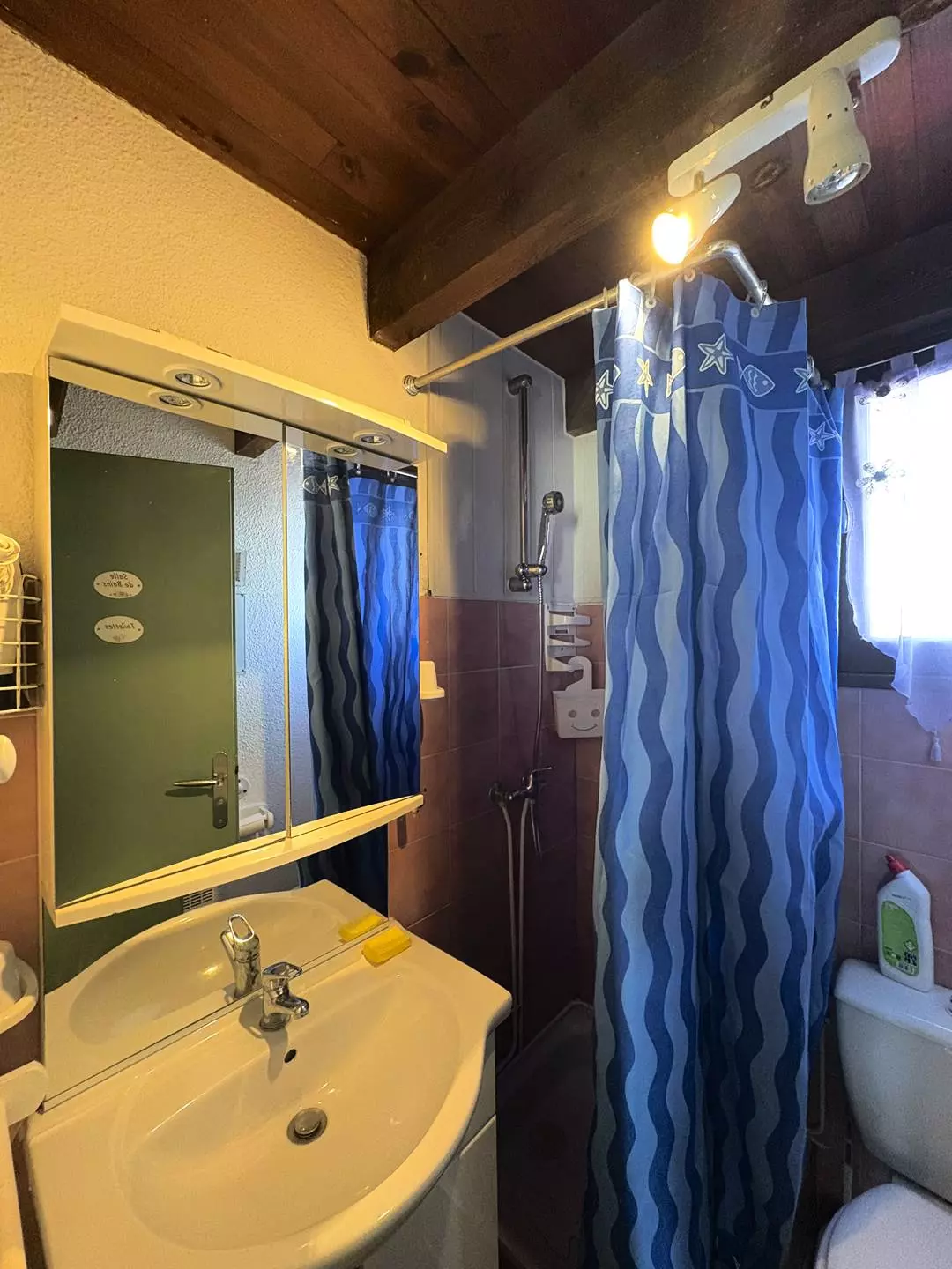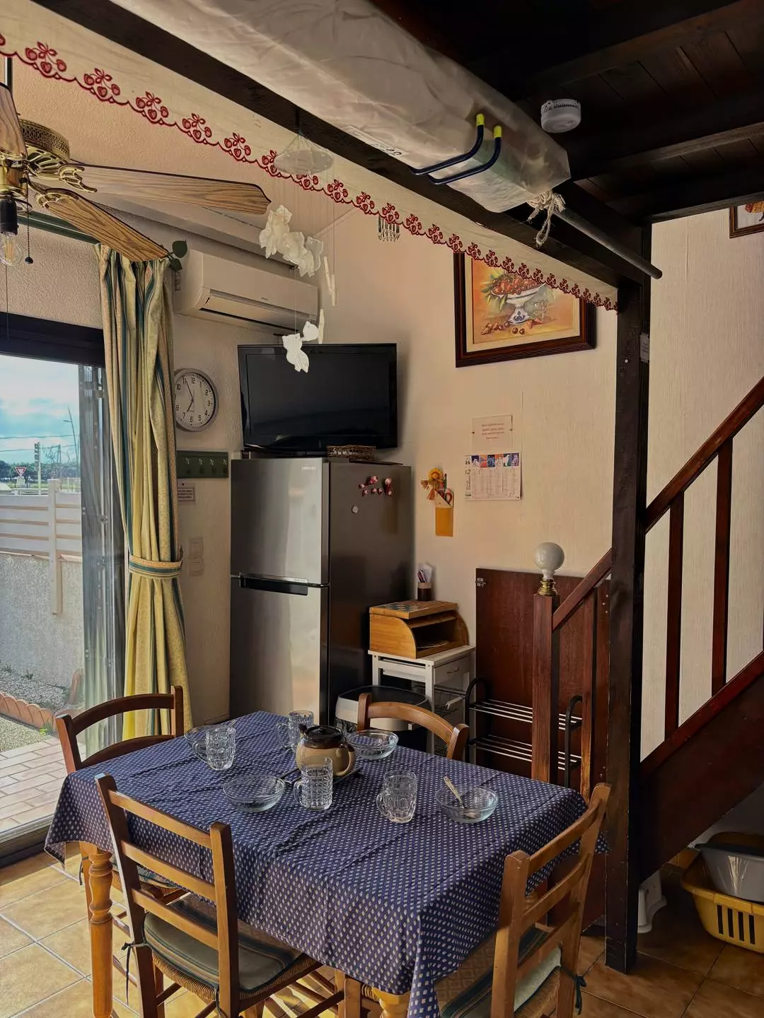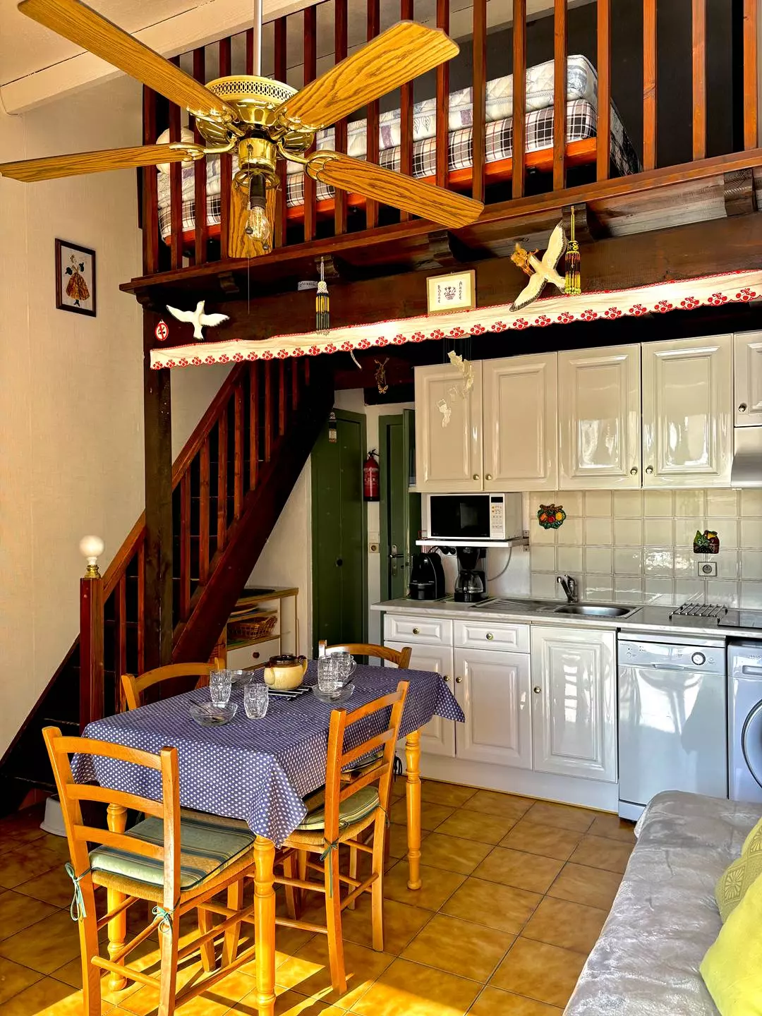 This house consists of a main living room / equipped kitchen, ceramic hob, microwave, fridge / freezer, dishwasher, washing machine. A bedroom on the ground floor with a 140 cm bed, and in the mezzanine a 140 cm bed