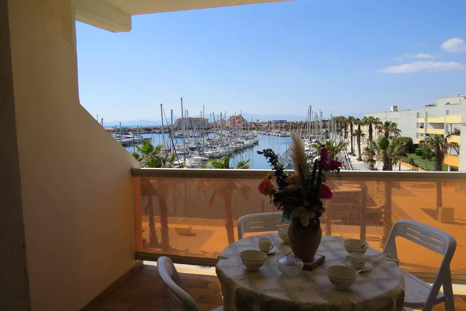 Terrace with garden furniture, sea and port view.
