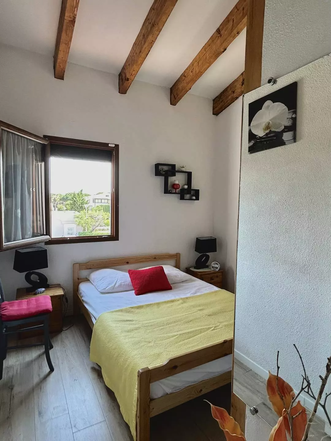 A bedroom with a 140 cm bed and two 90 cm beds on the mezzanine.