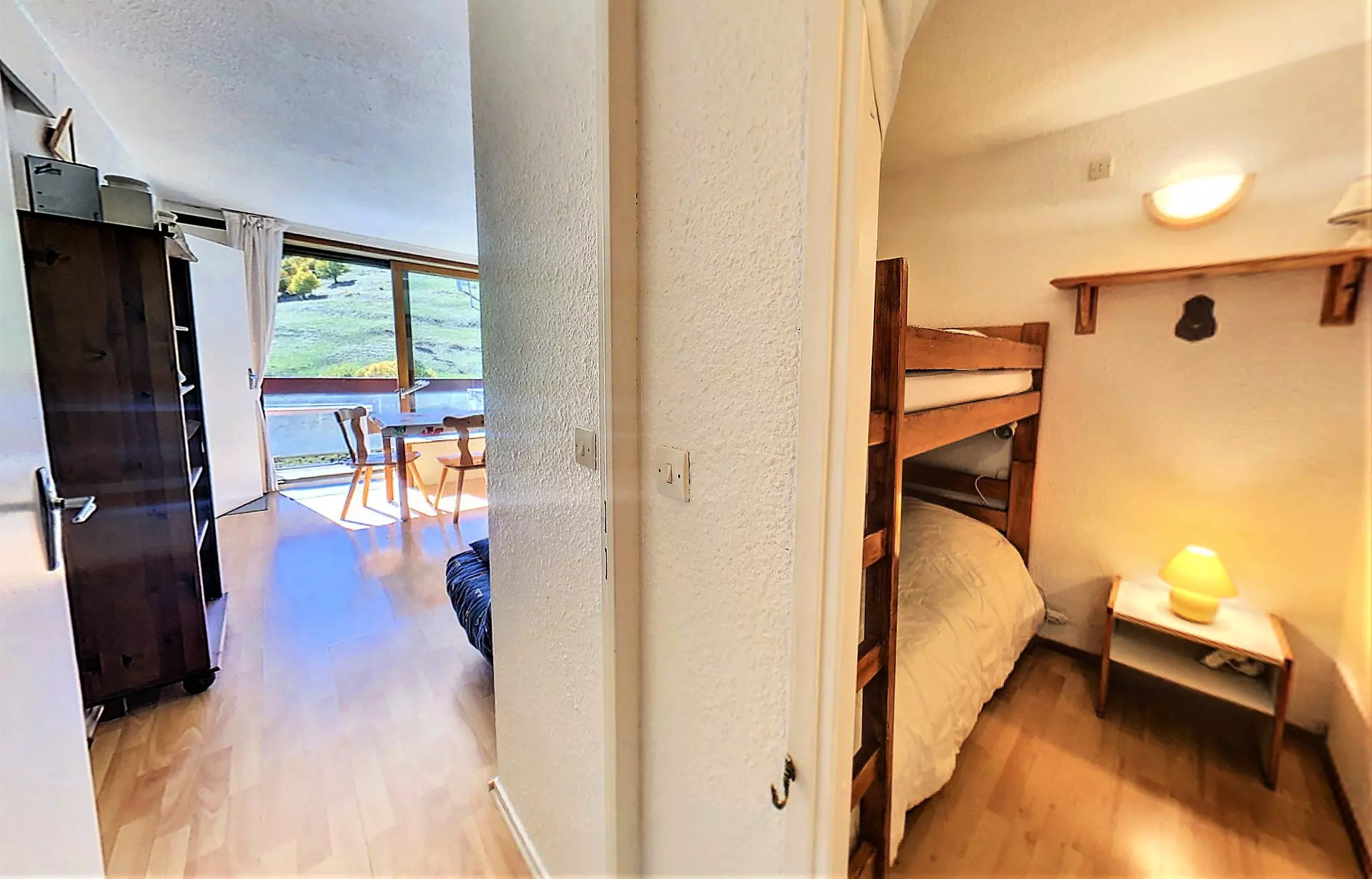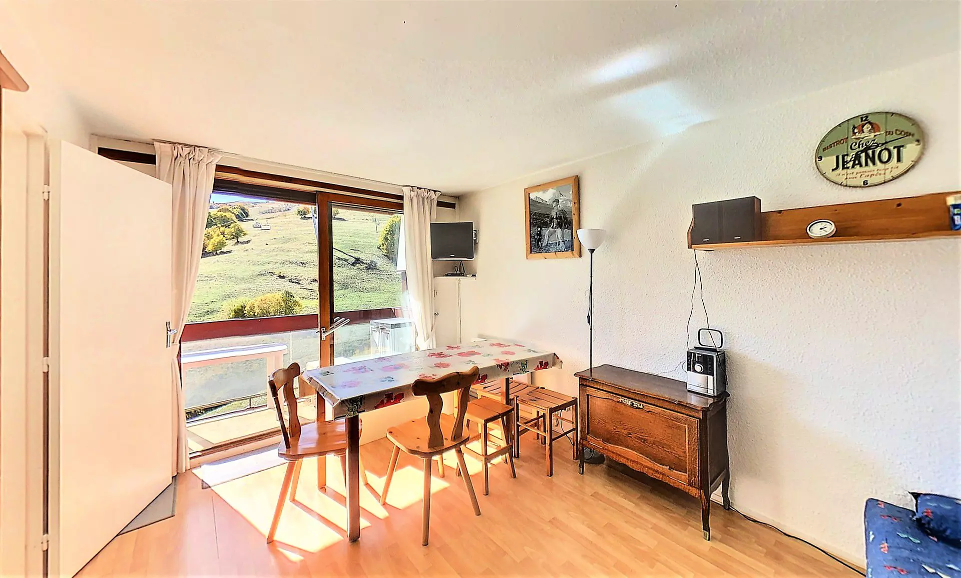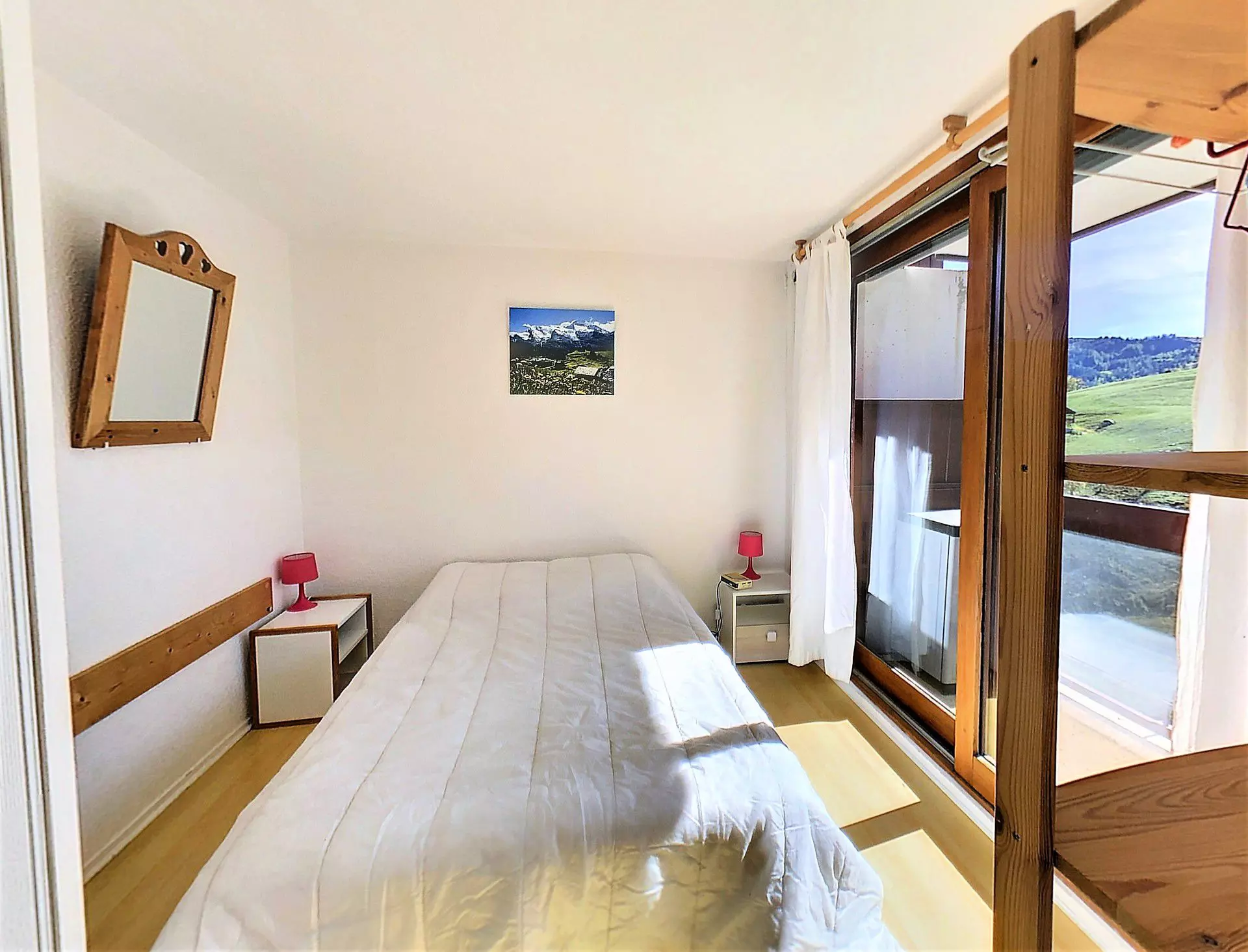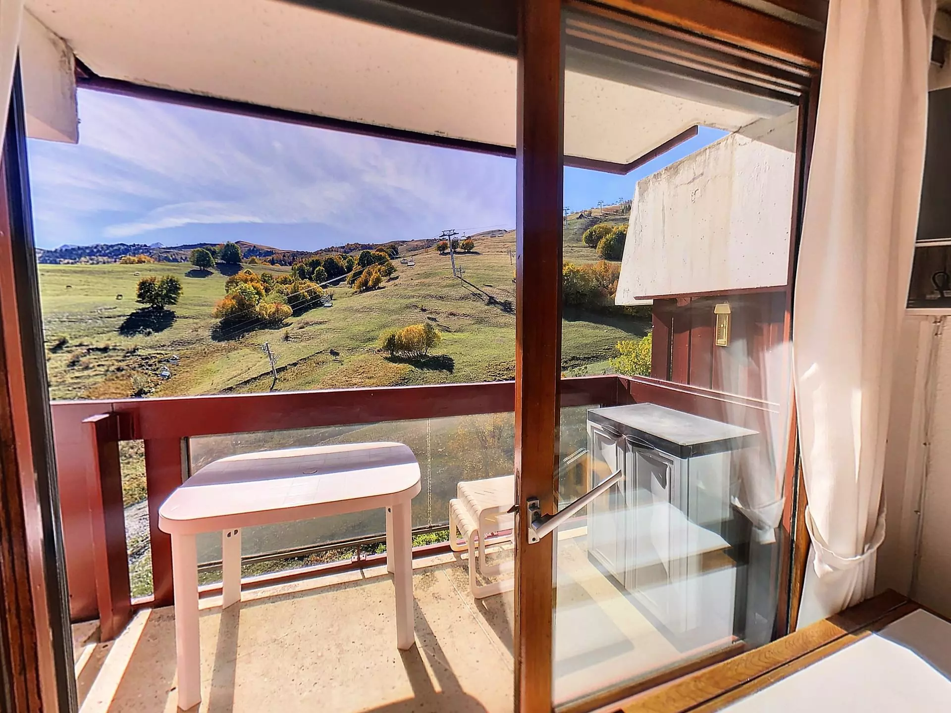 Living room and bedroom open onto a large balcony overlooking the slopes.