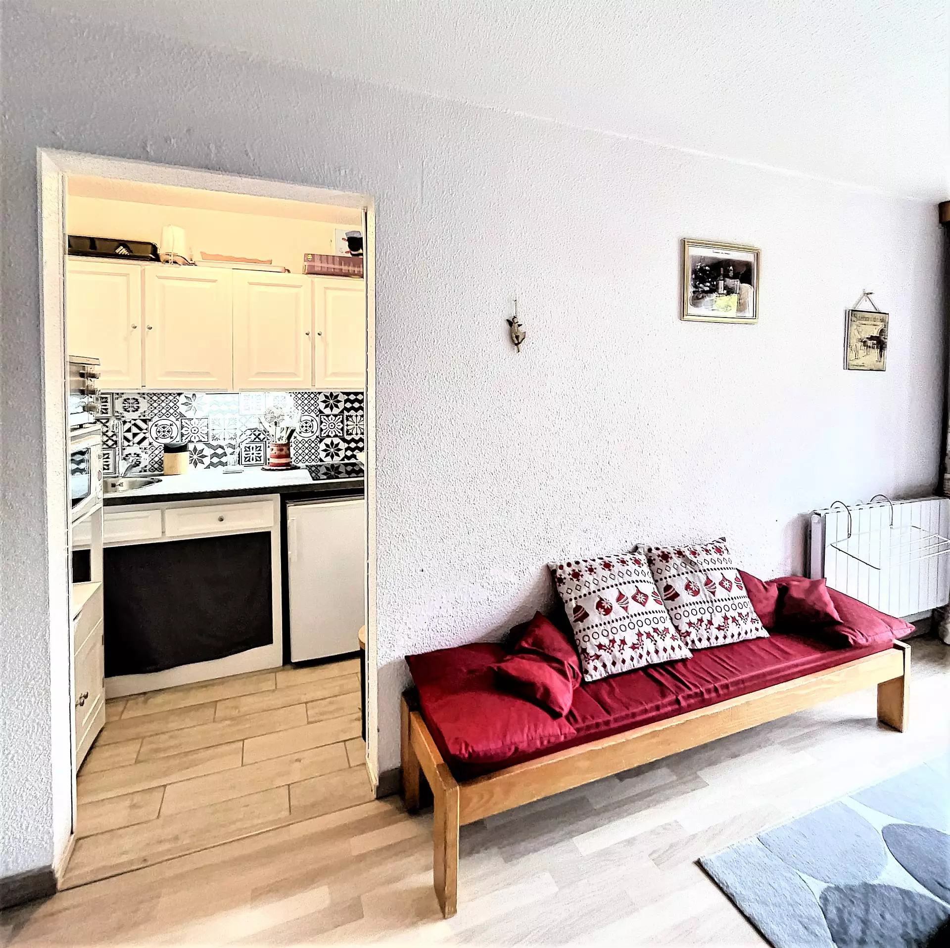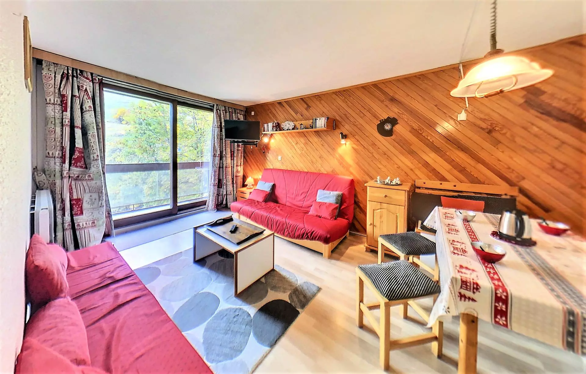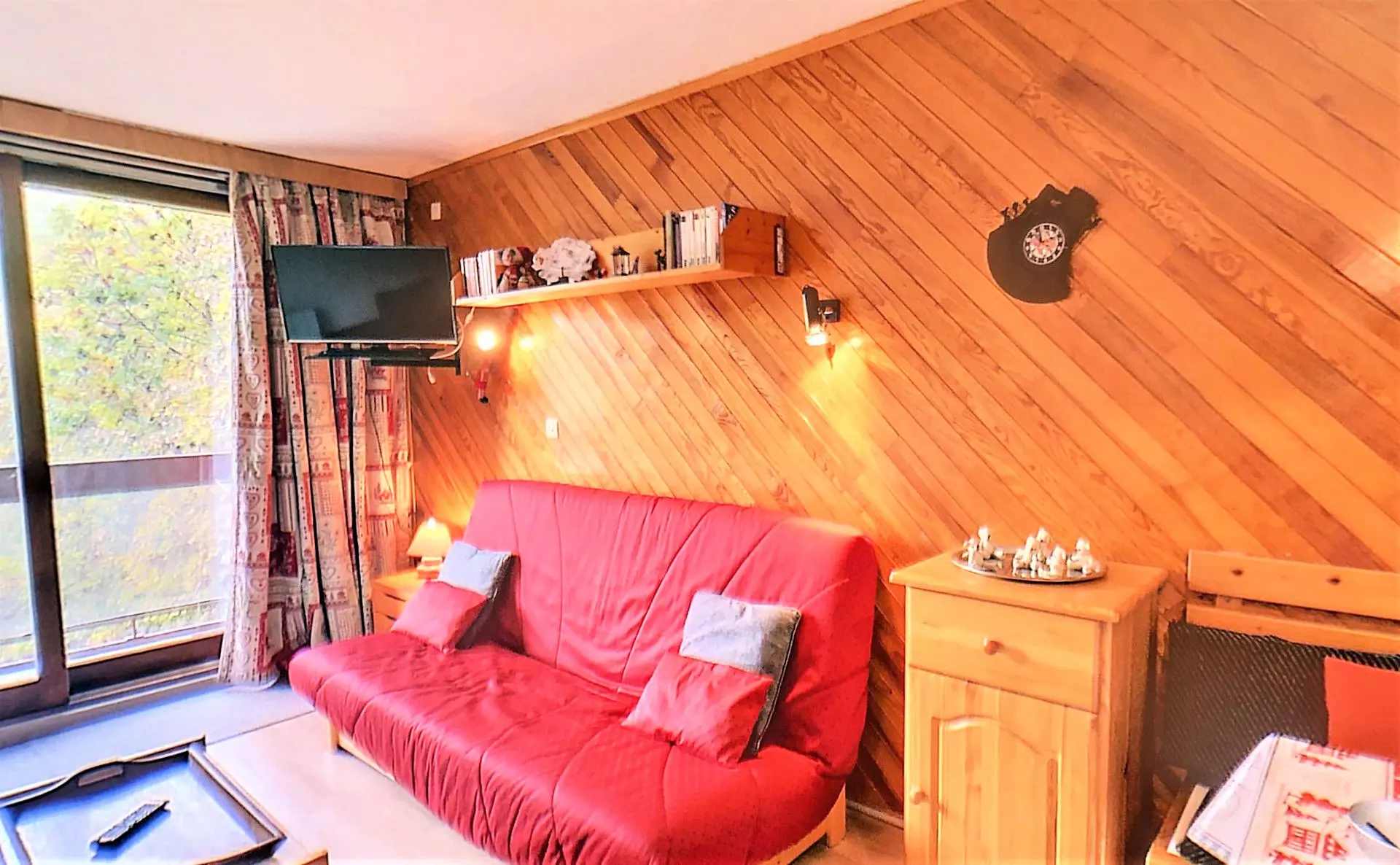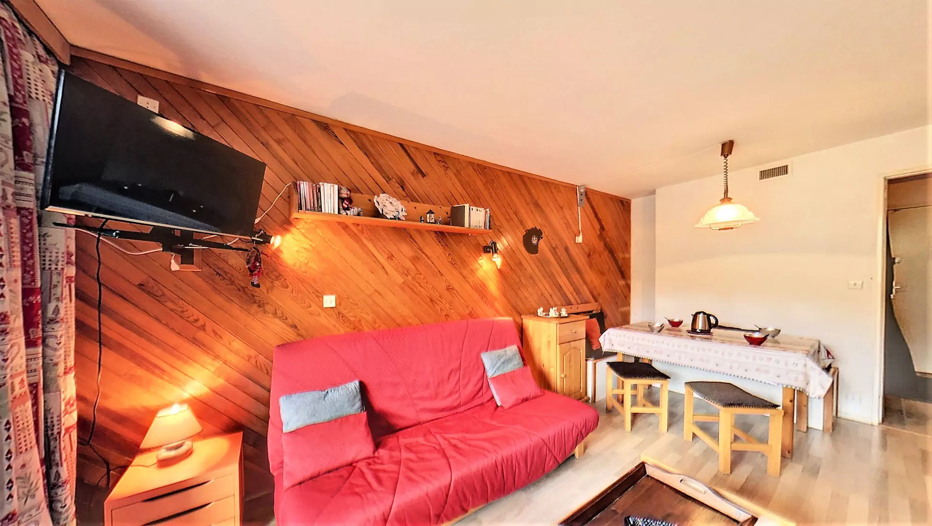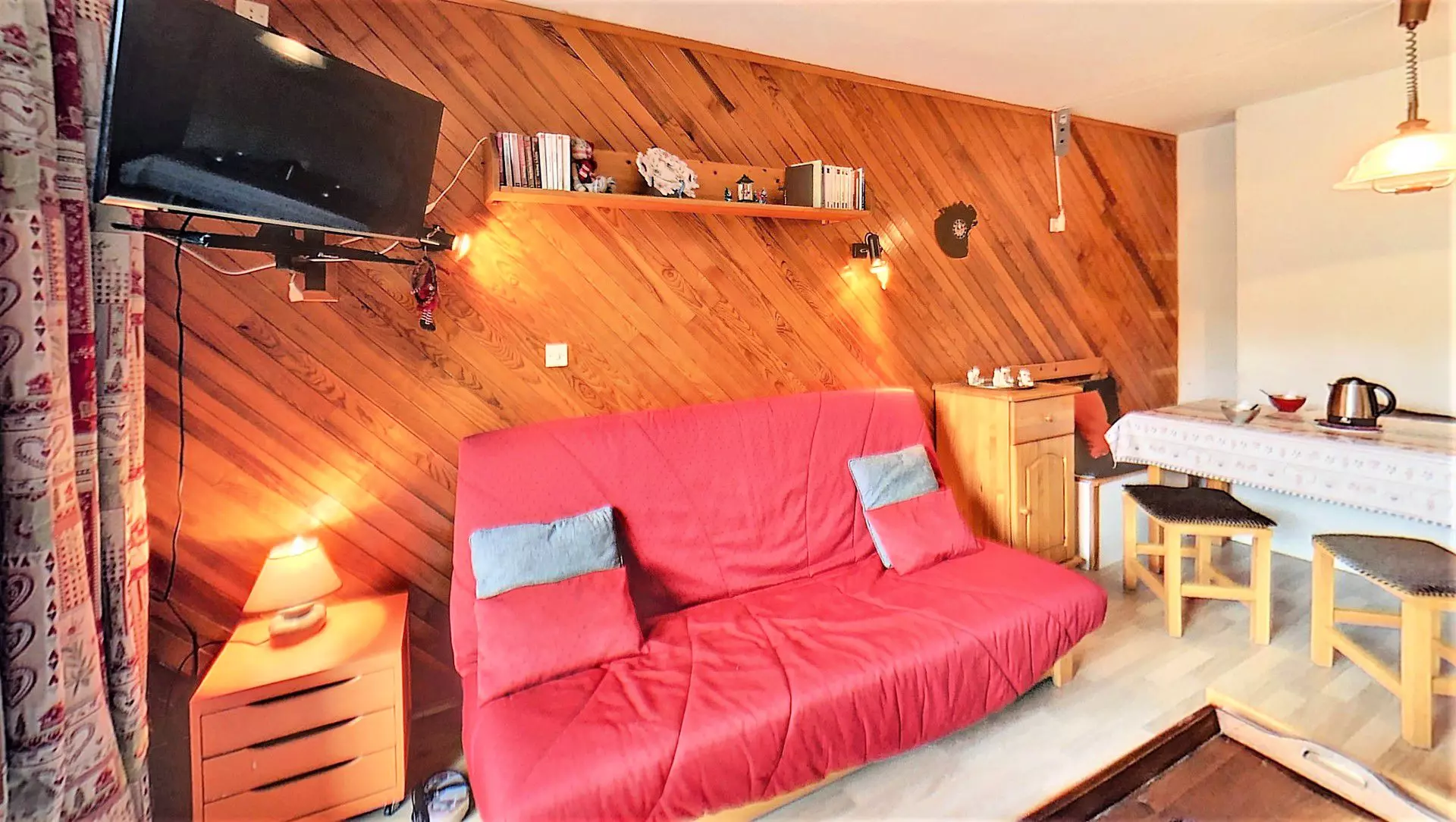 A pleasant living room with warm furnishings with 1 sofa bed for 2 people, a flat-screen TV, a separate kitchen area, equipped with 2 electric hotplates, a mini oven, a microwave, a raclette and fondue set and an electric coffee maker.