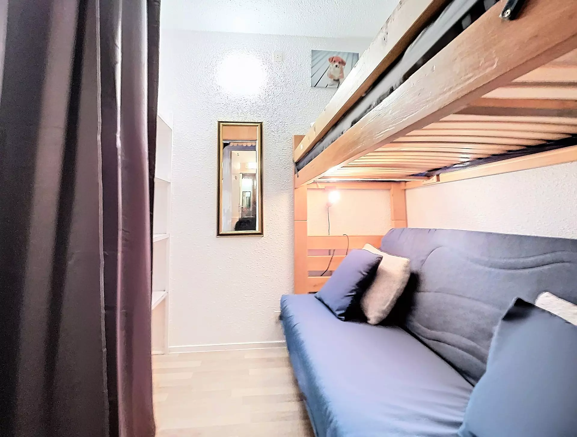 The cabin, separated by a curtain, has a large storage cupboard, a sofa bed for 2 people and a single mezzanine bed for a child.