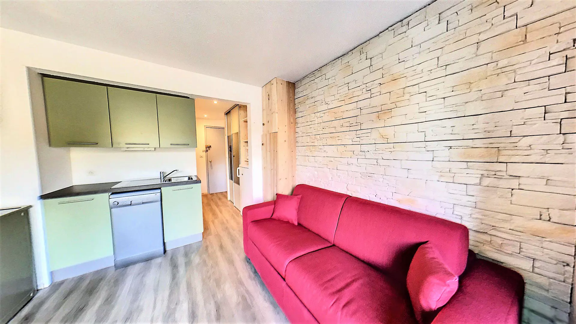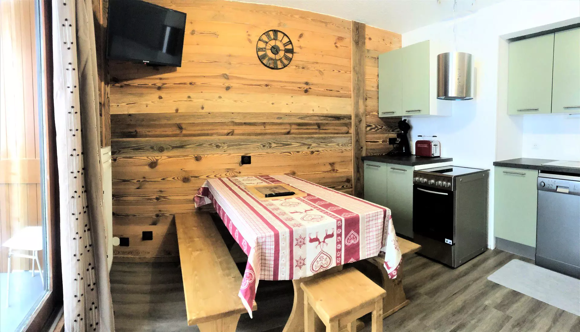 The apartment includes an entrance hall with a closet and a storage area and a kitchen area with a large refrigerator and a microwave. In the living room, there is a kitchenette equipped with 4 ceramic hobs, an oven, a dishwasher, a filter coffee maker, a kettle, a toaster, a blender, a raclette and fondue set.