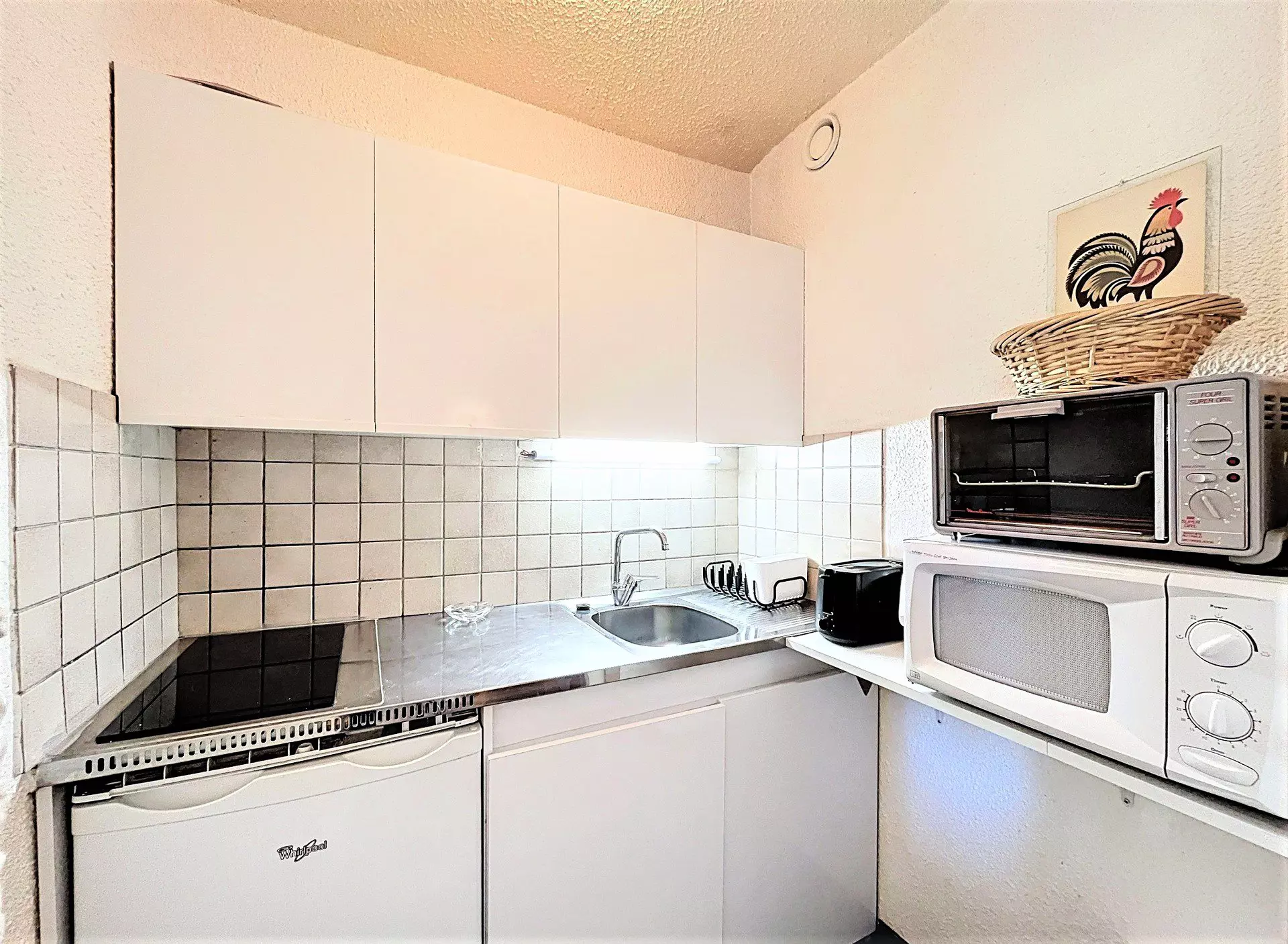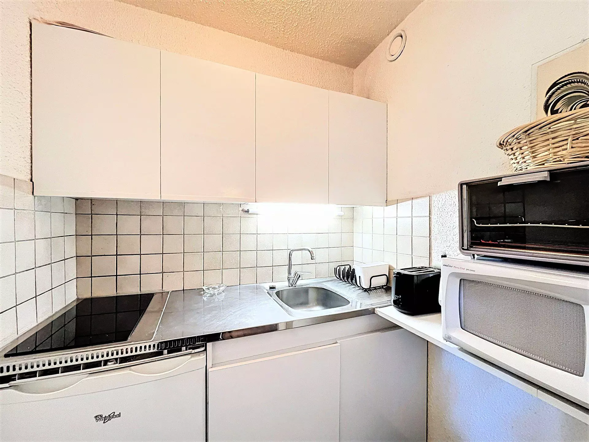 A kitchen area separated by a sliding door, including electric hob, microwave, electric coffee maker, toaster and kettle.