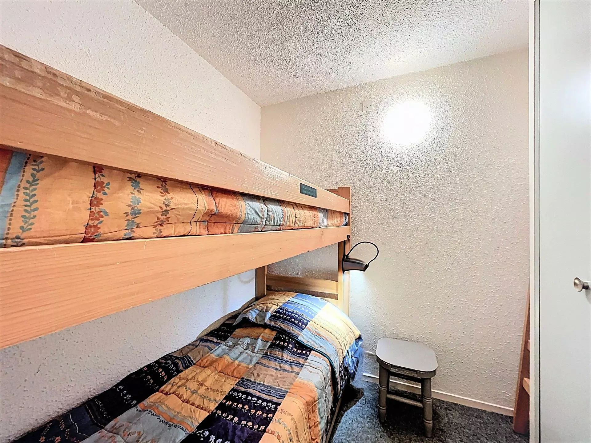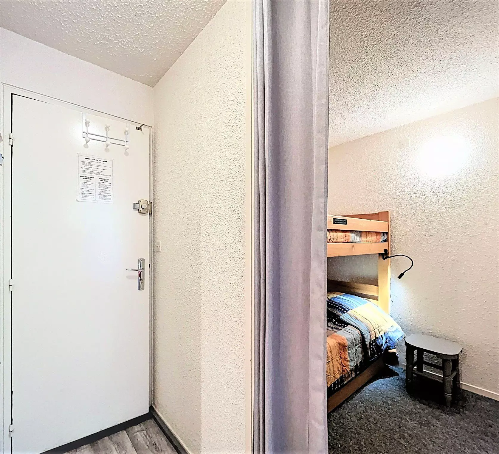 Studio comprising an entrance, a separate cabin with 2 bunk beds and 1 child's pull-out bed, and large storage closet.