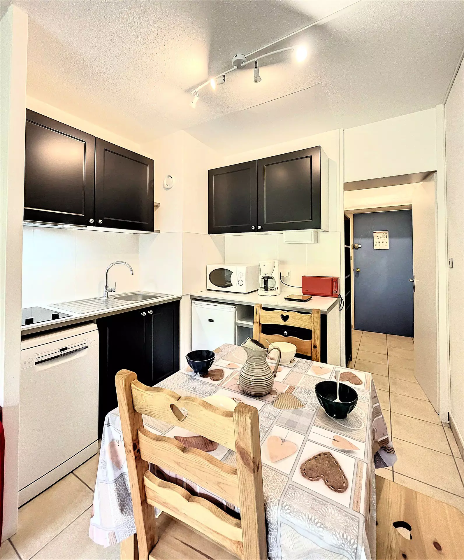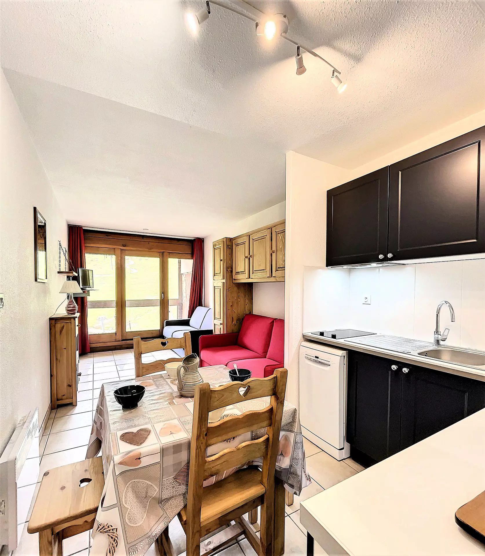 A living room with 2 double sofa beds (140 cm), a kitchen area equipped with two electric hotplates, dishwasher, microwave, coffee maker, toaster, raclette machine, refrigerator and flat screen television.