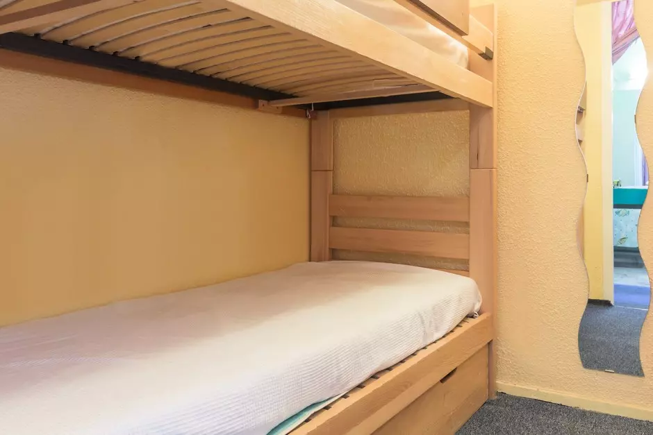 The mountain corner is separated by a curtain, it is equipped with 2 bunk beds, 1 child's pull-out bed, and a large storage cupboard.
