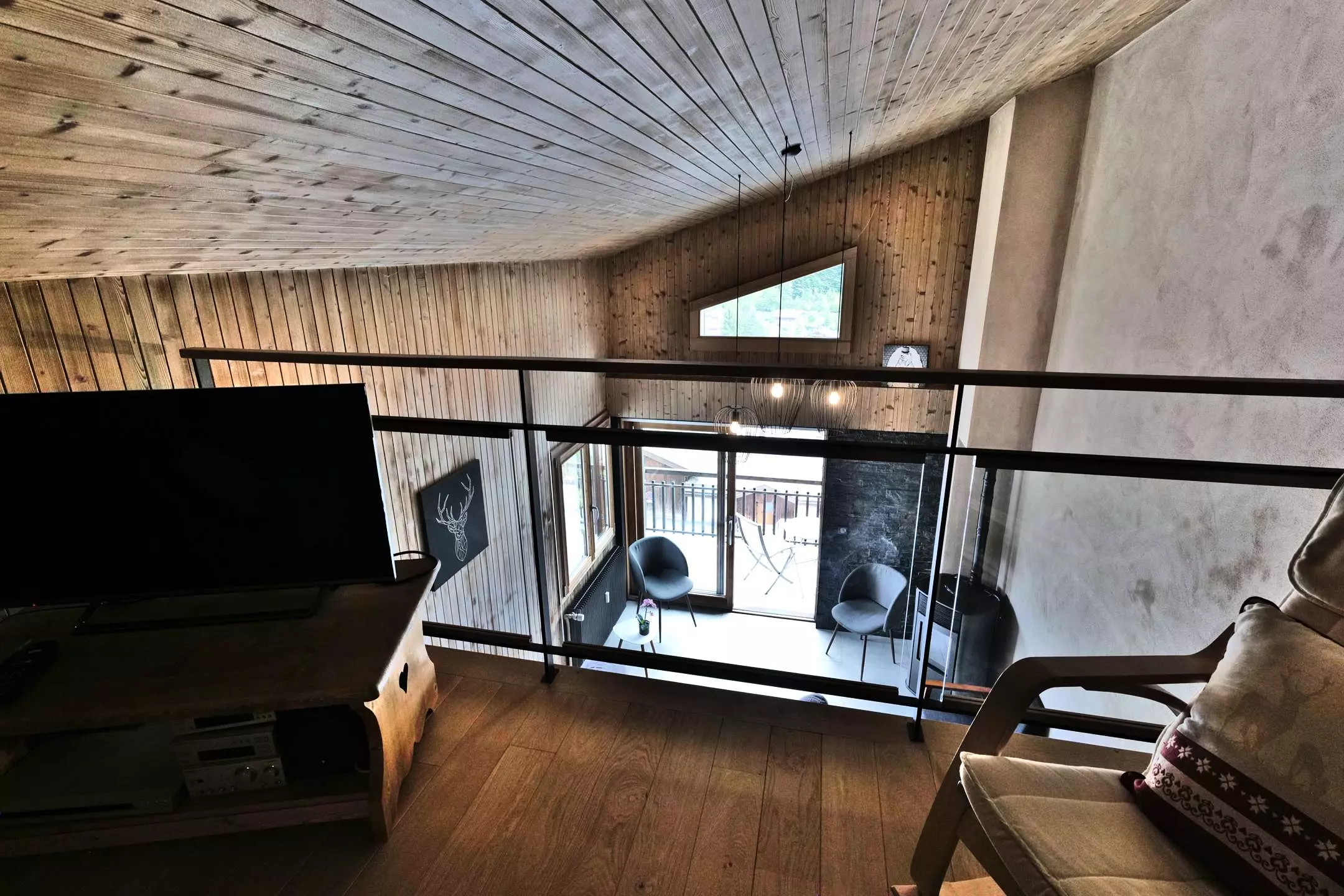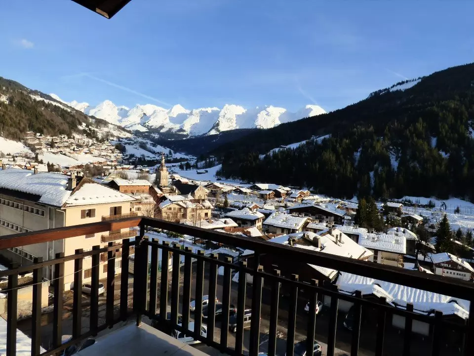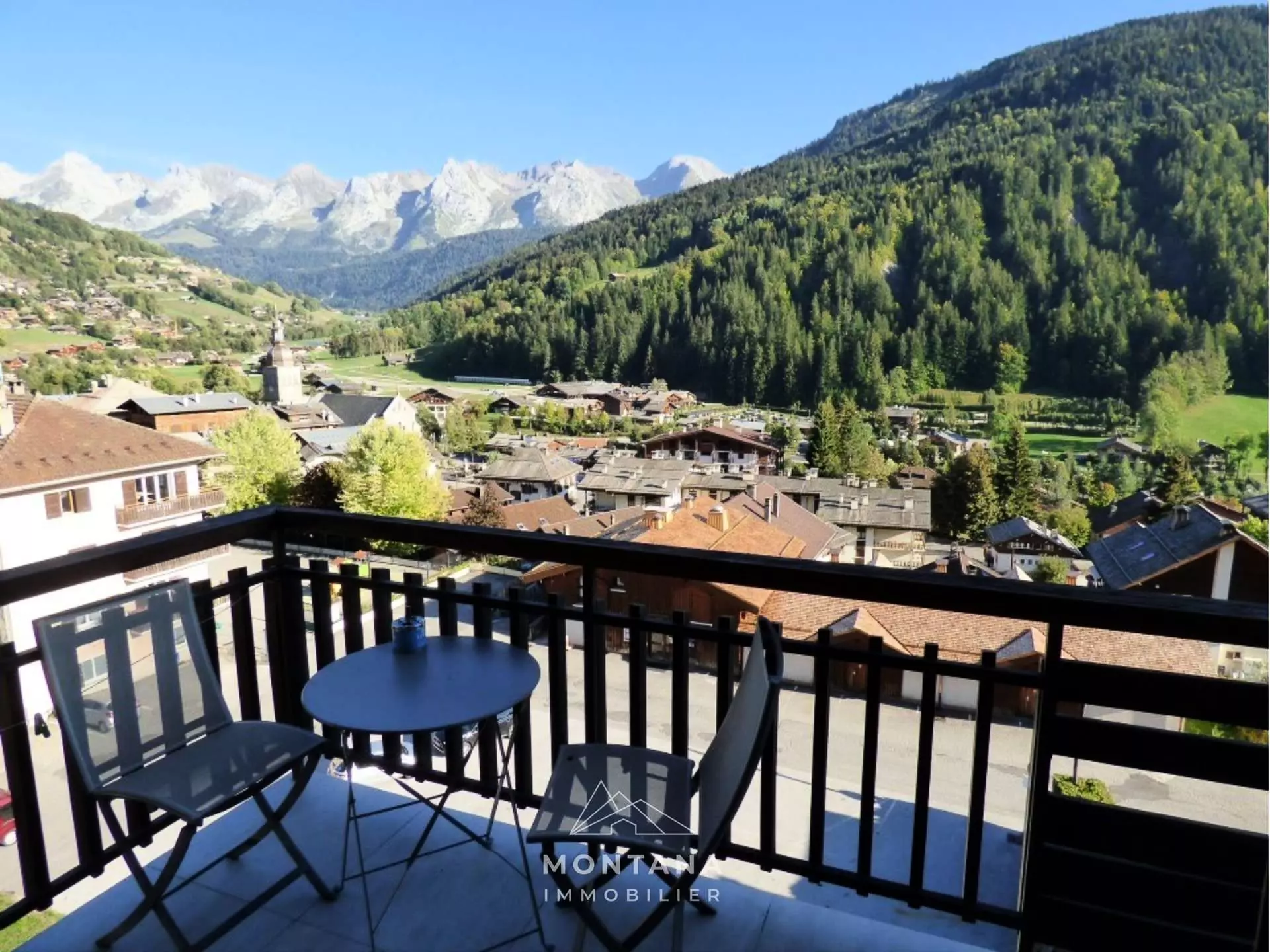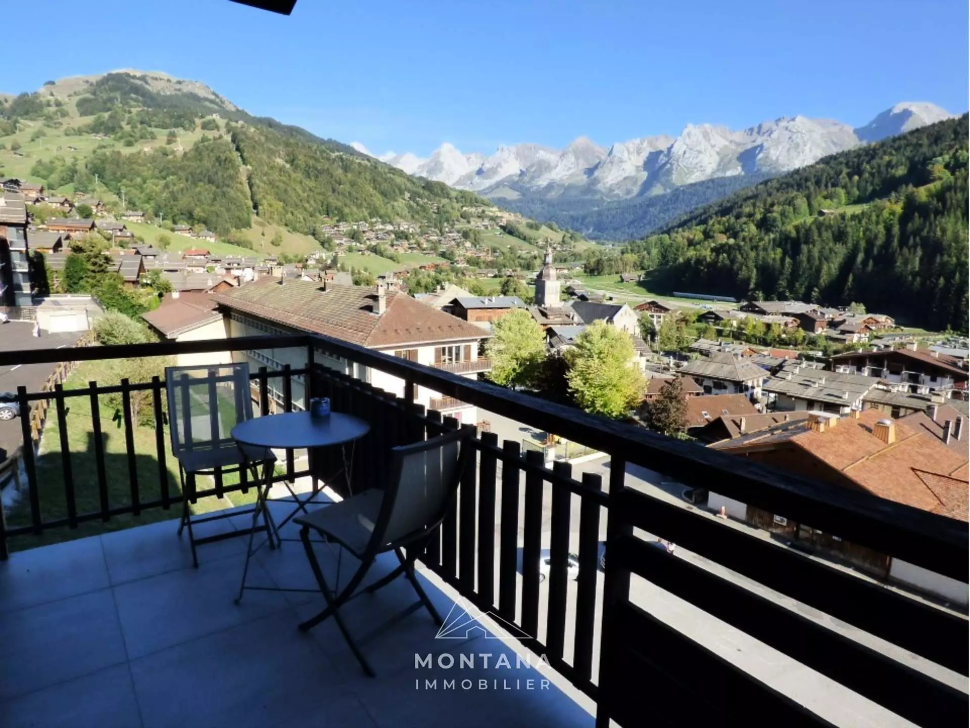 A south-facing balcony with a view of the village of Grand-Bornand and the Aravis mountain range