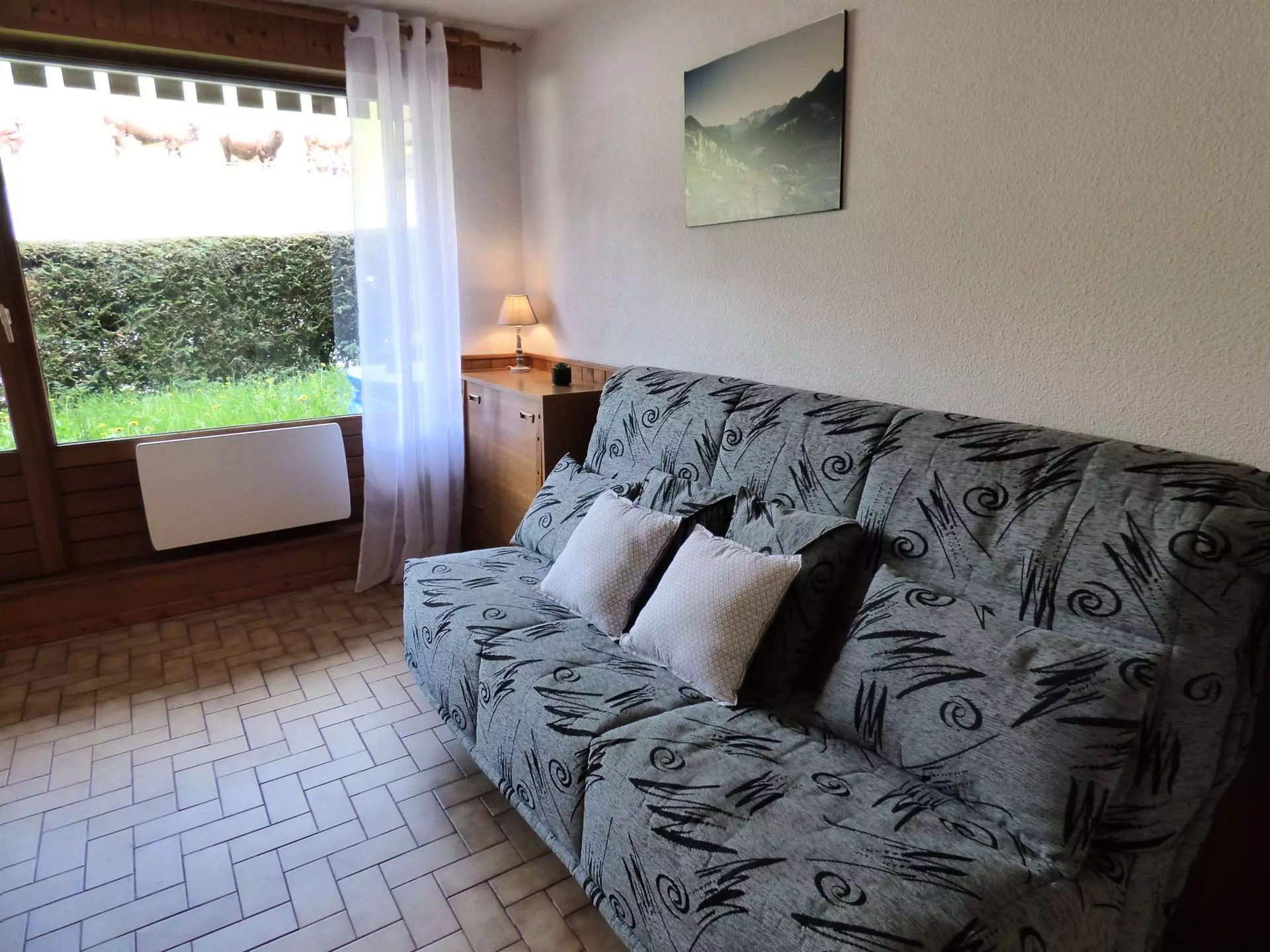 A living room with a 140cm sofa bed