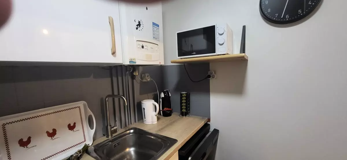 The kitchen is open to the living room, fully equipped (4-burner ceramic hob, oven, microwave, fridge, dishwasher, washing machine, Dolce Gusto coffee maker, toaster and kettle).
