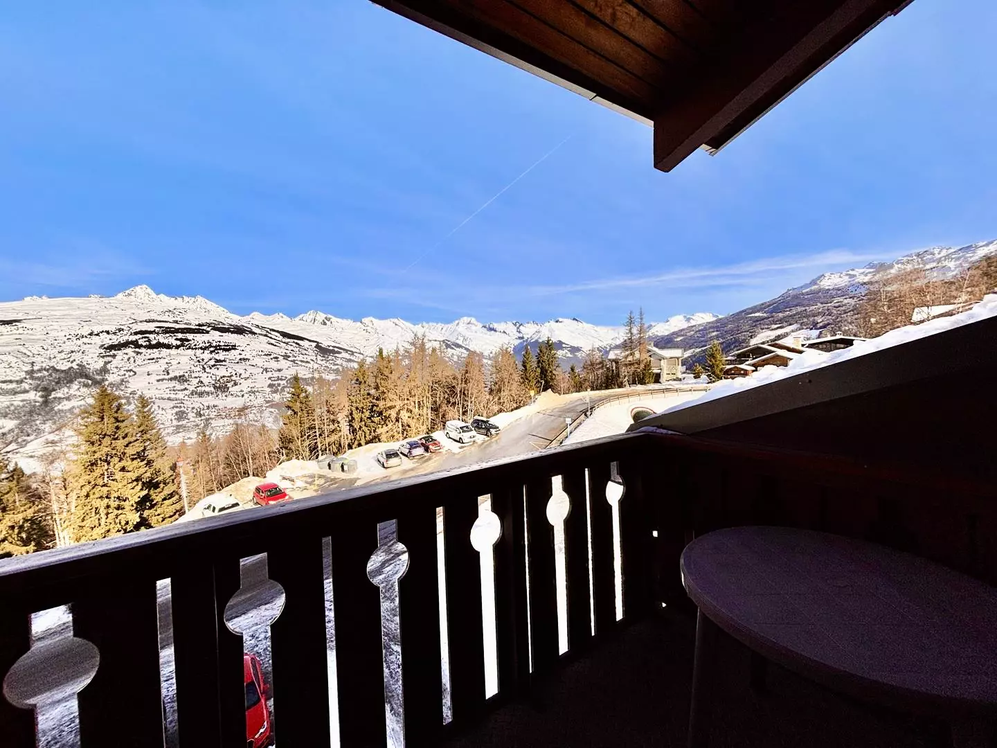 The balcony faces north, overlooking Mont Blanc. The ski locker is located in the building.