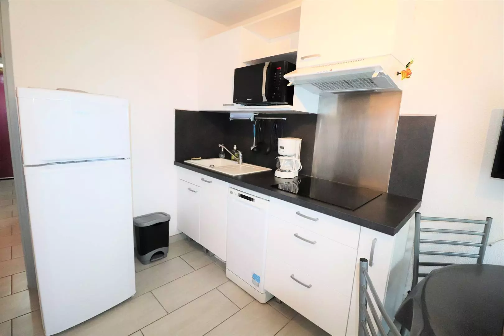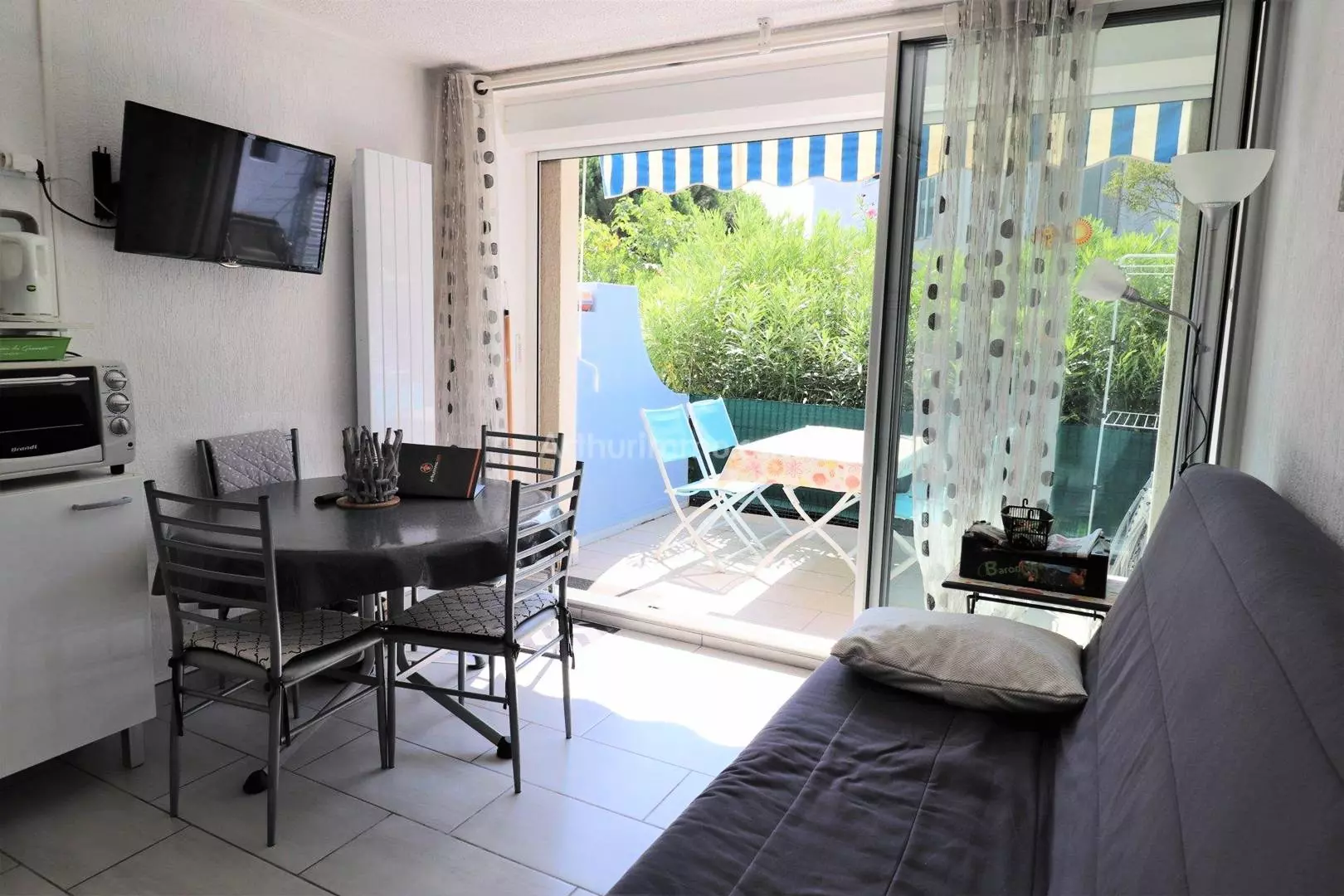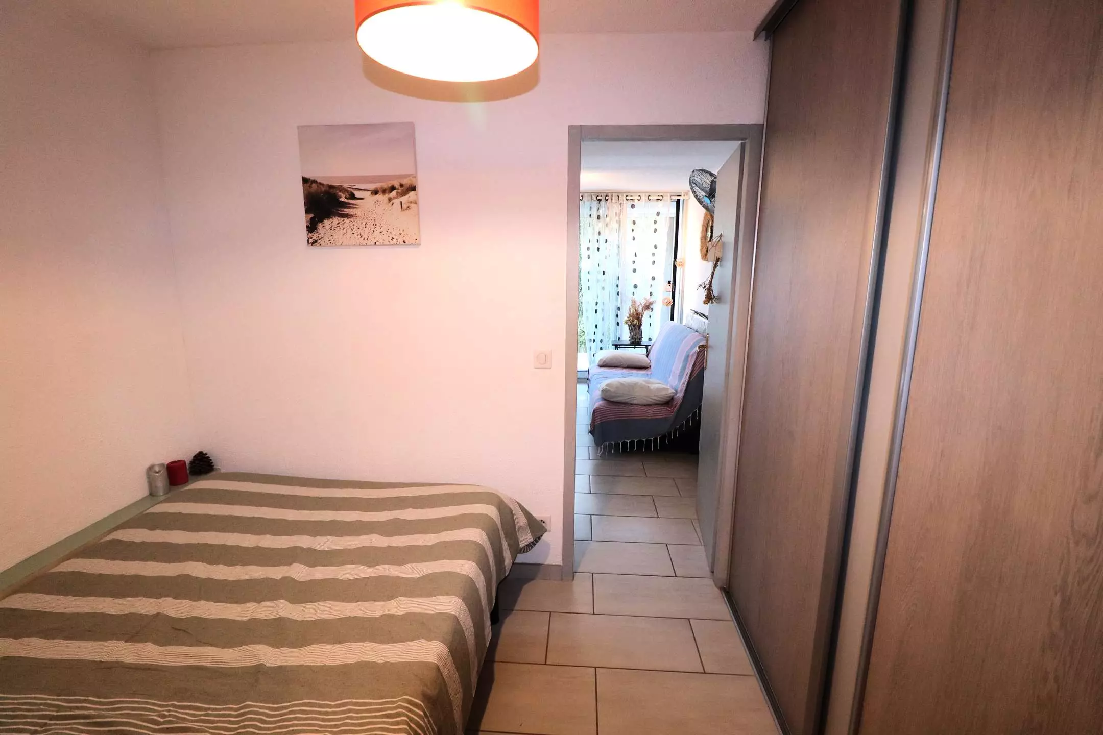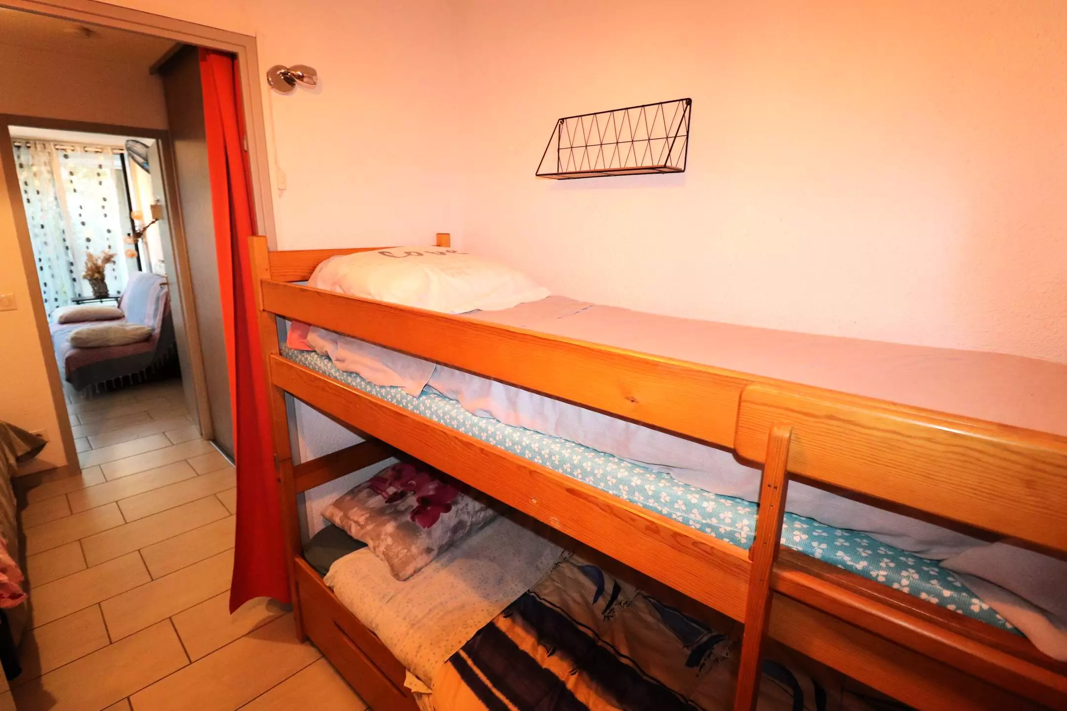 Residence FLORALIES 2 - Studio cabin for 4 people, all comfort 750m from the sea, located on the ground floor with a 7m2 terrace to enjoy family meals outdoors, in a residence with swimming pools, boules games and children's play area. It includes an entrance with bunk beds followed by a second cabin with 1 double bed, shower room with WC, equipped kitchen with dishwasher, living room opening onto the south-facing terrace.