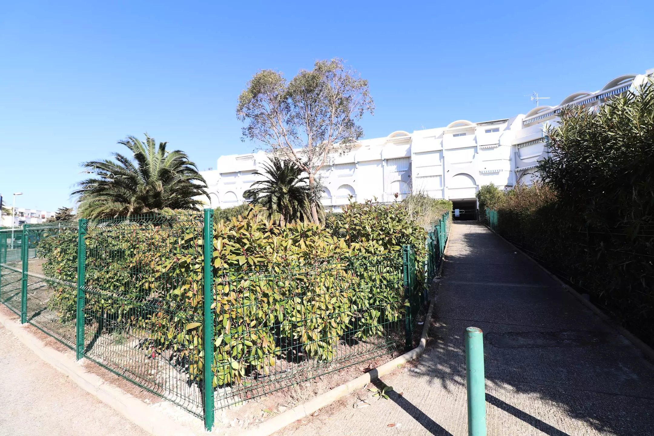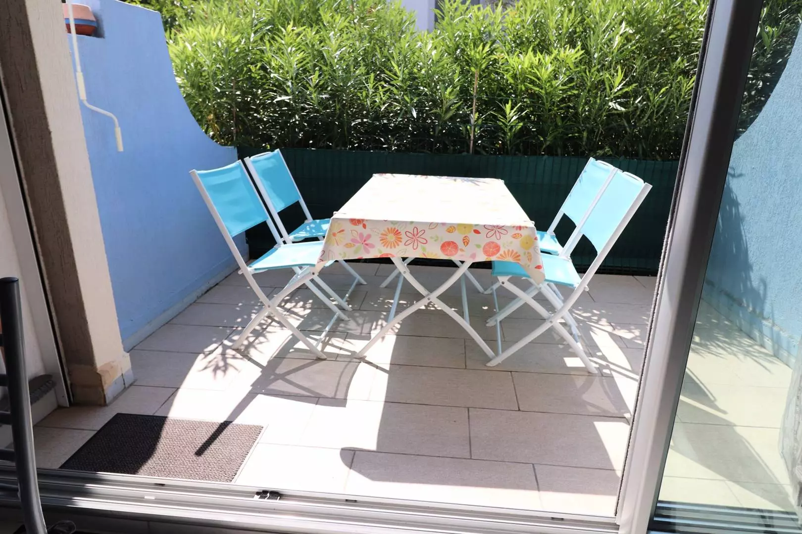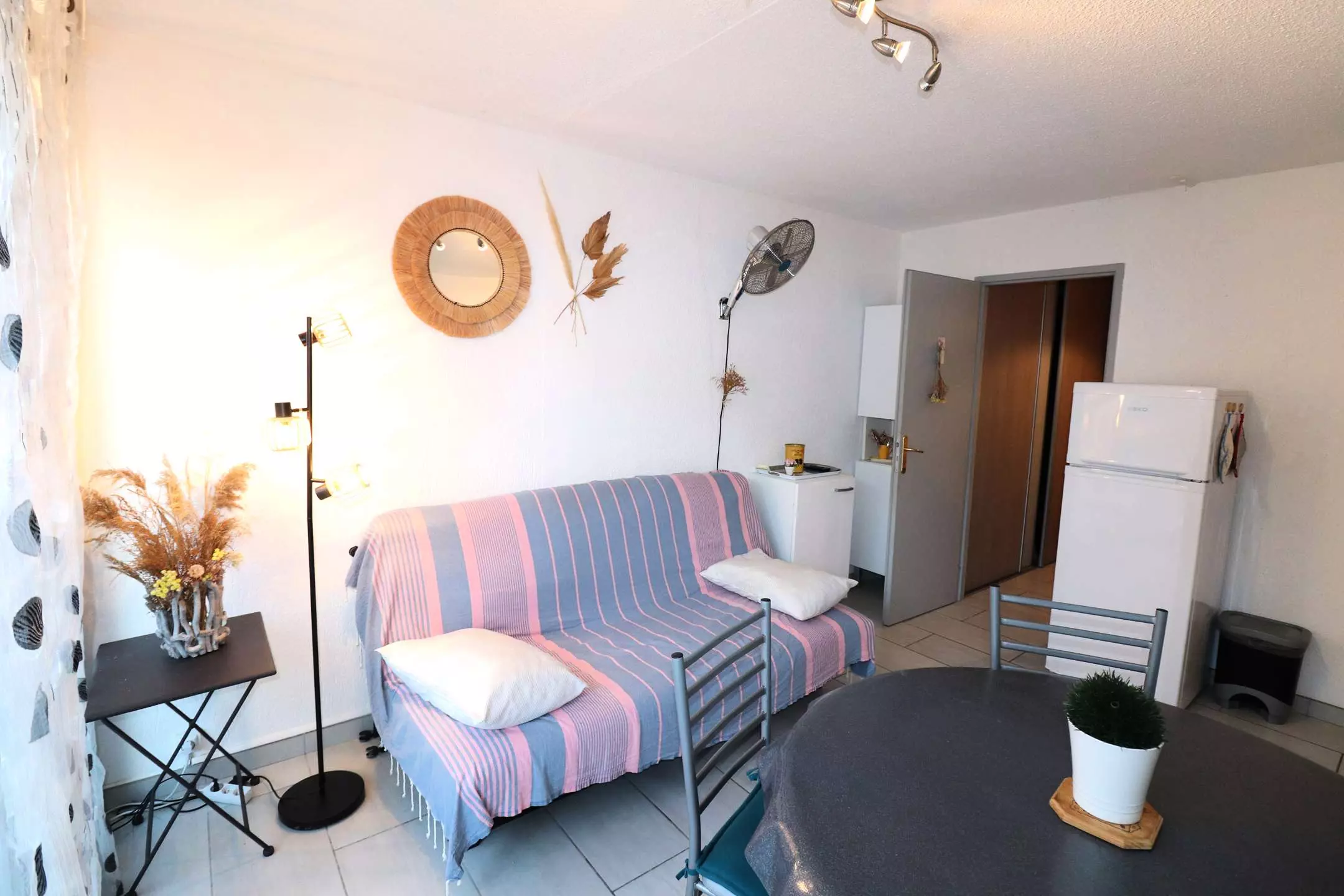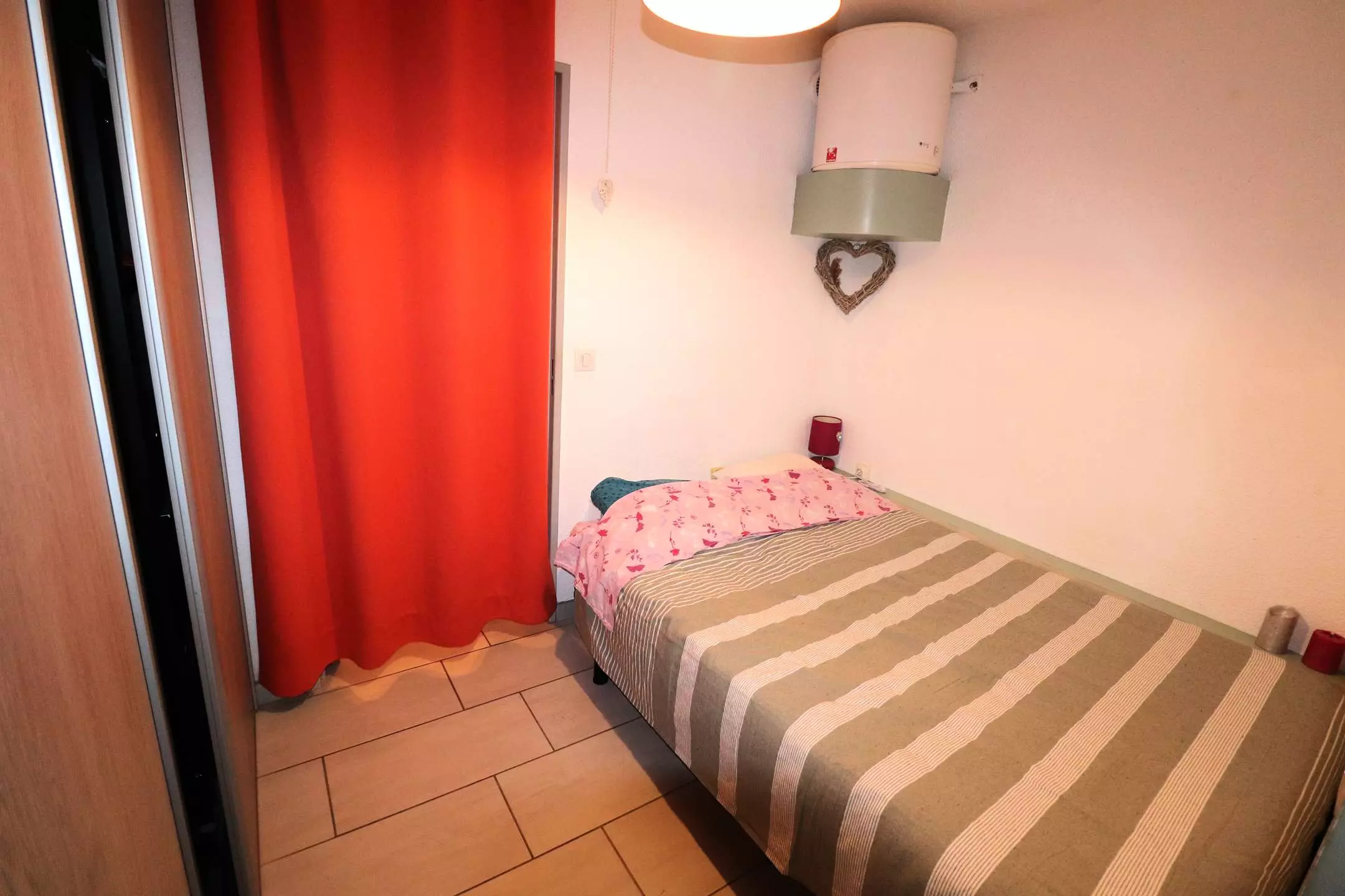 Residence FLORALIES 2 - Studio cabin for 4 people, all comfort 750m from the sea, located on the ground floor with a 7m2 terrace to enjoy family meals outdoors, in a residence with swimming pools, boules games and children's play area. It includes an entrance with bunk beds followed by a second cabin with 1 double bed, shower room with WC, equipped kitchen with dishwasher, living room opening onto the south-facing terrace.