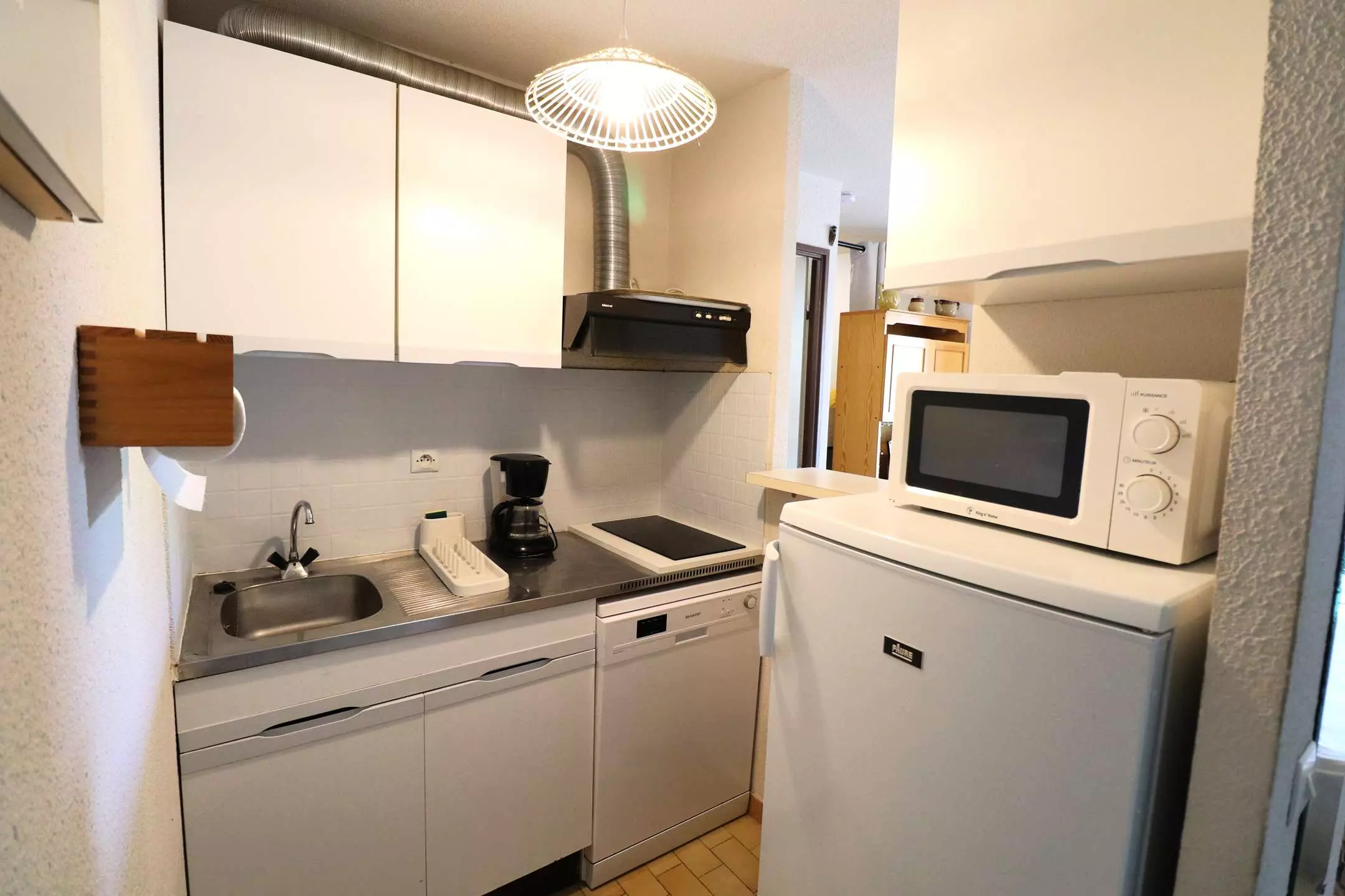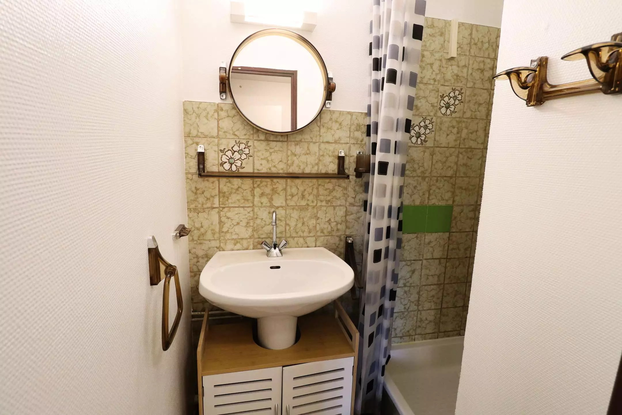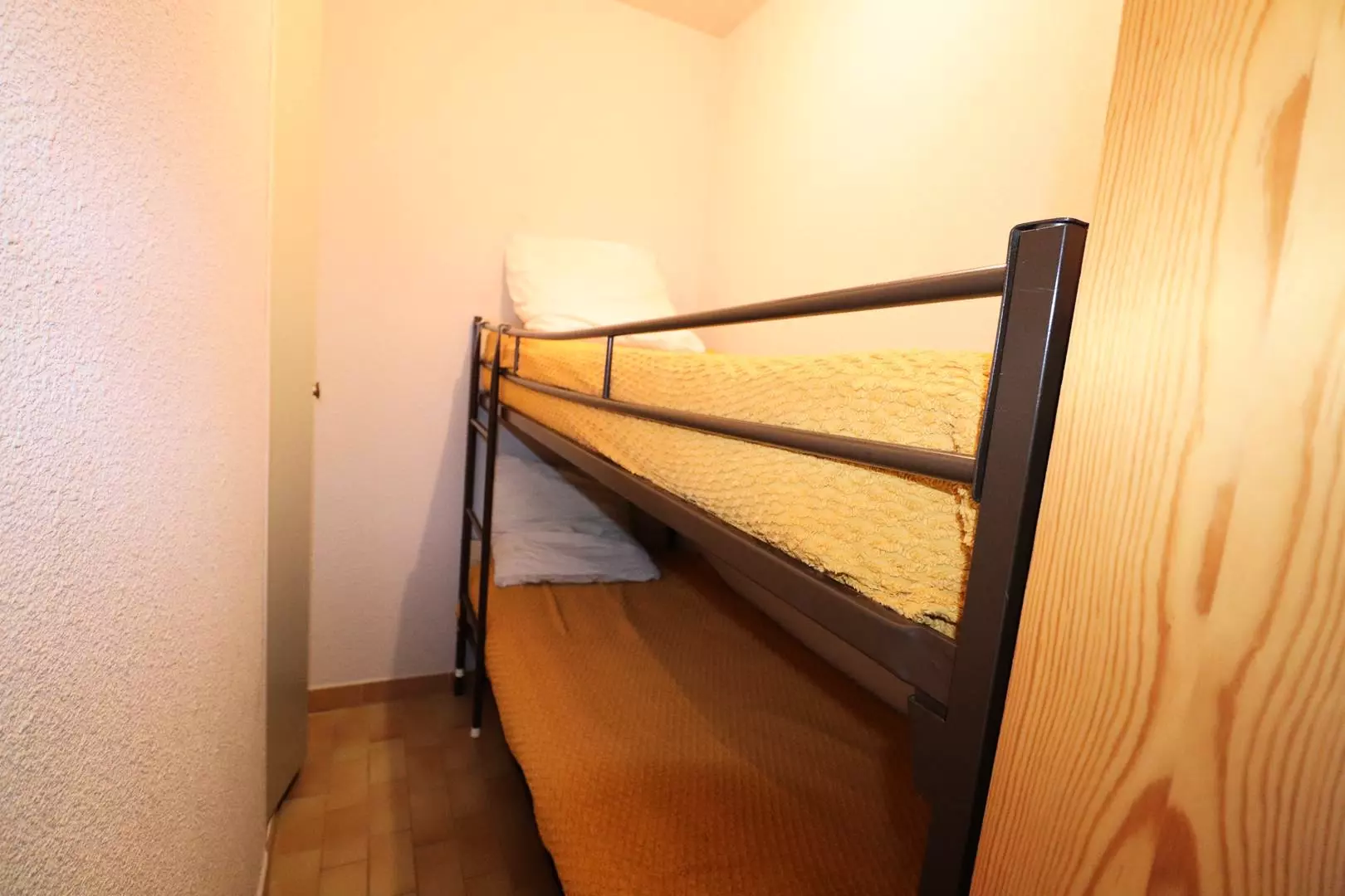 The apartment features an entrance hall, a fully equipped kitchenette with a serving hatch, a large, bright living room, a sleeping alcove with two bunk beds, and a bathroom. The toilet is separate. The bedroom, furnished with a double bed, has a window and a storage closet for maximum comfort.