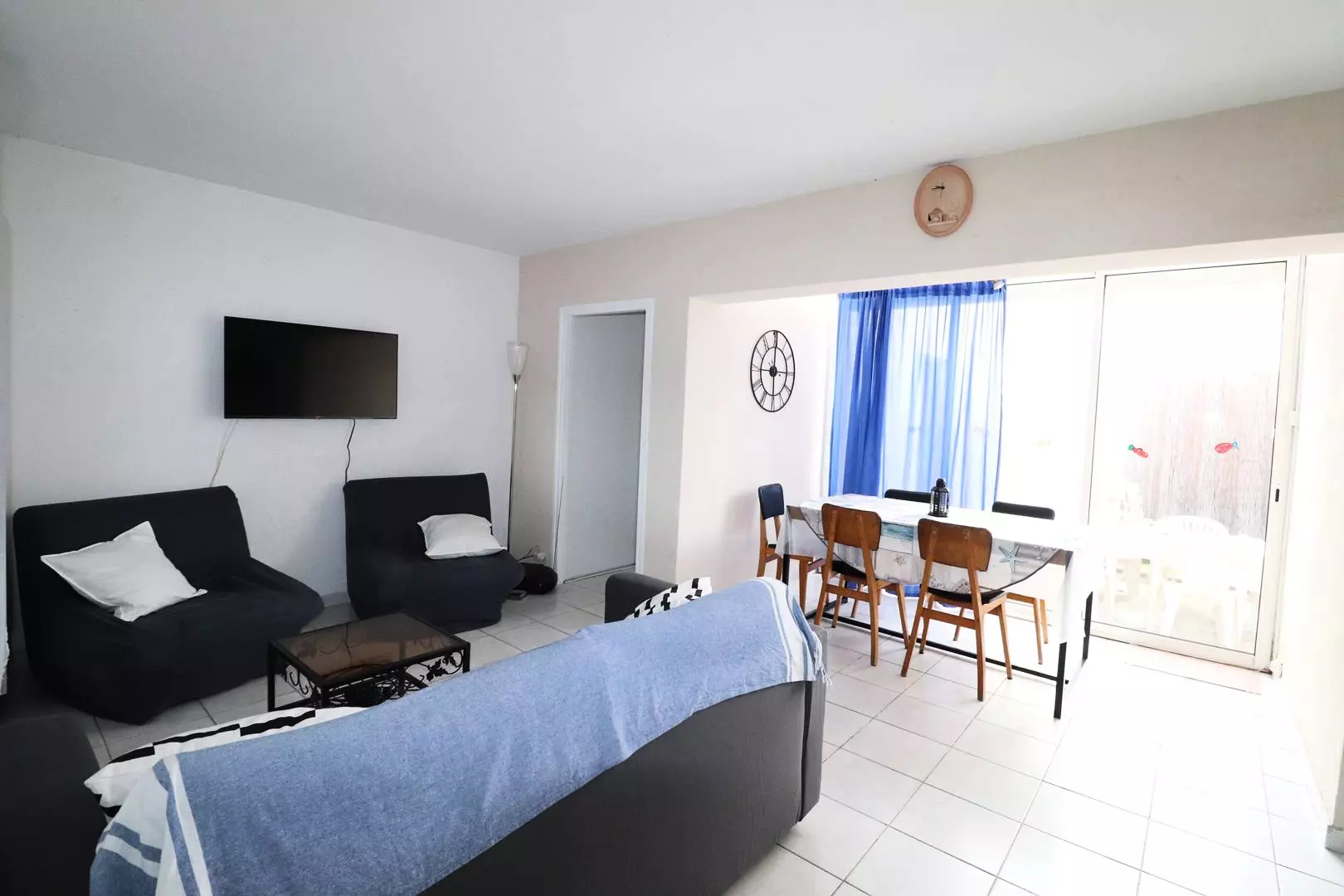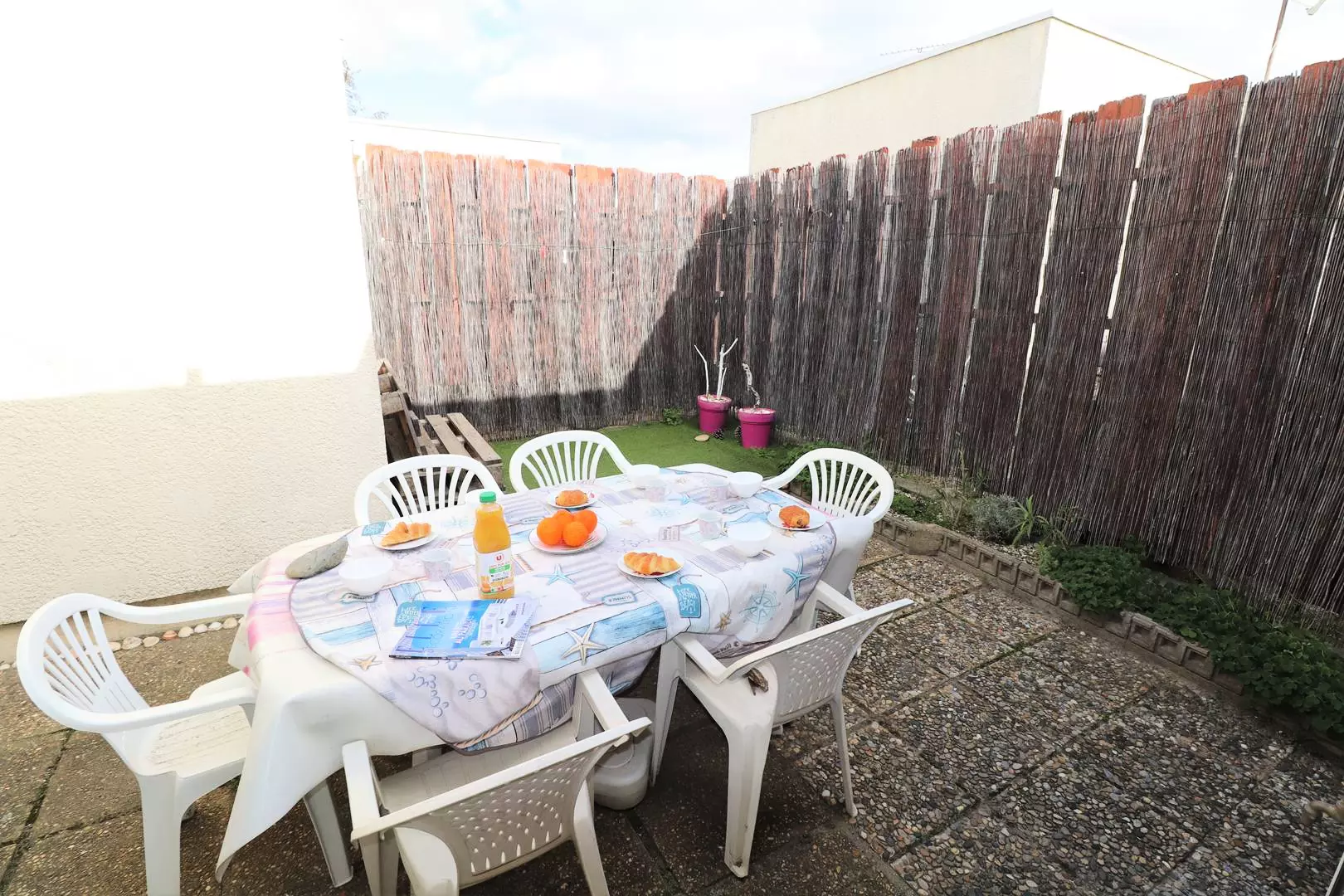 The kitchen includes a washing machine and a dishwasher. The living room has two single beds, and the dining area opens onto the patio through a large bay window, where it's pleasant to be around at any time of day. Private parking.