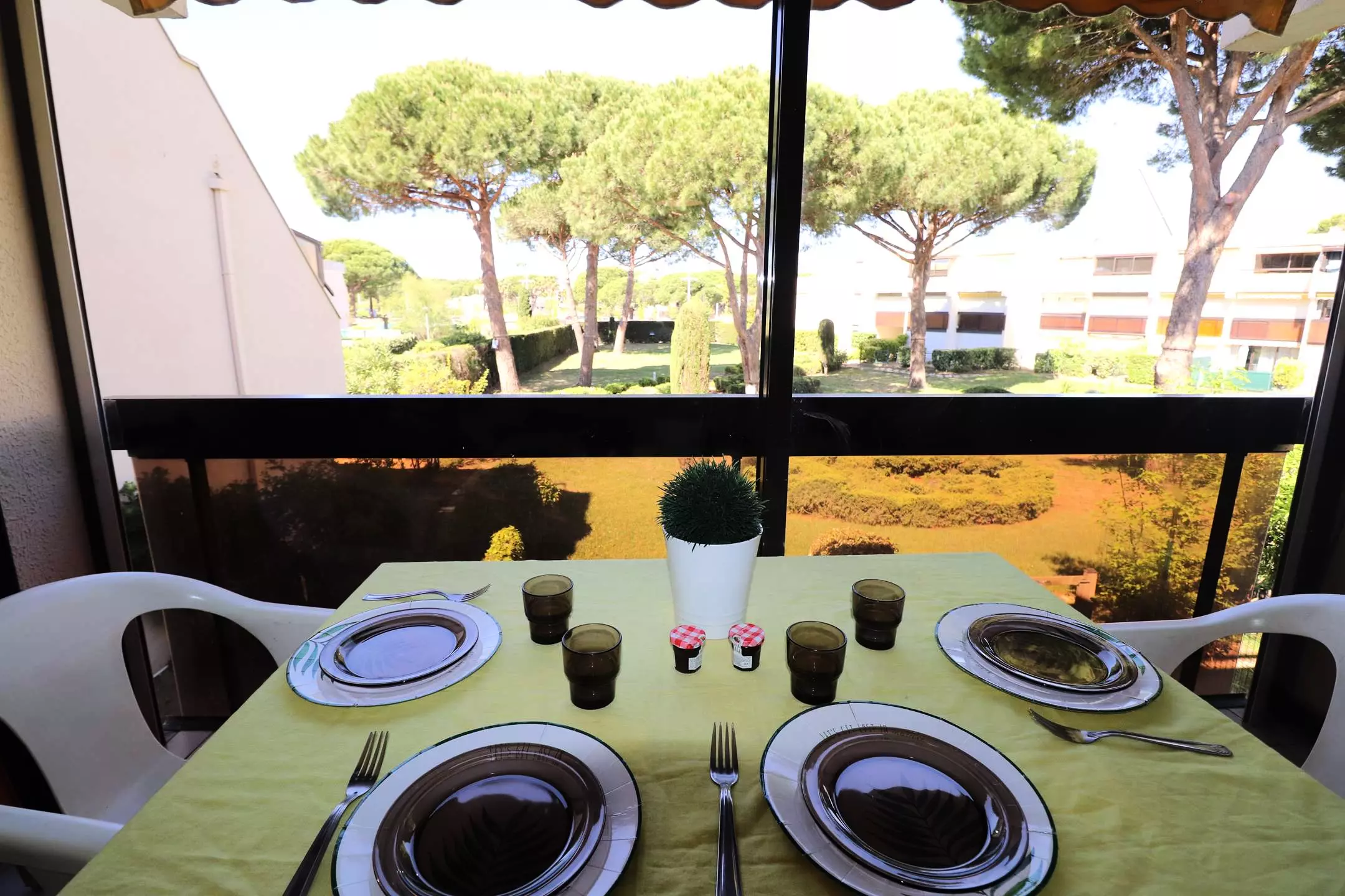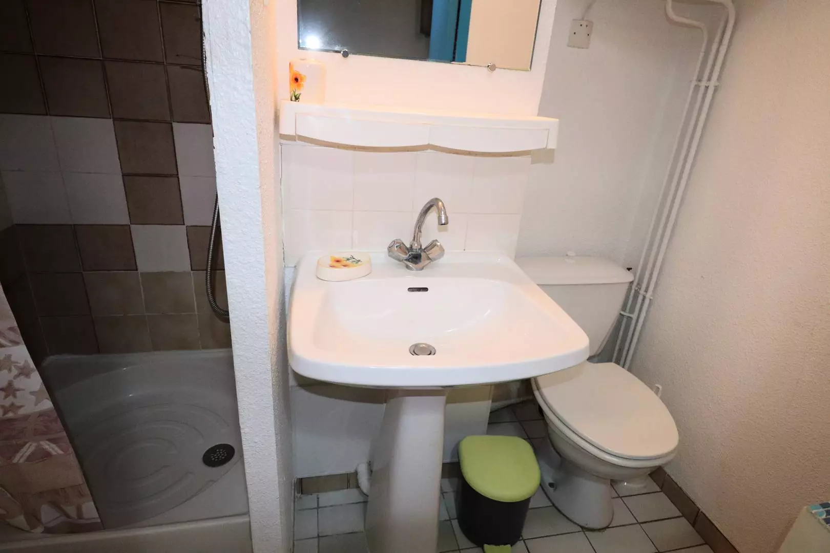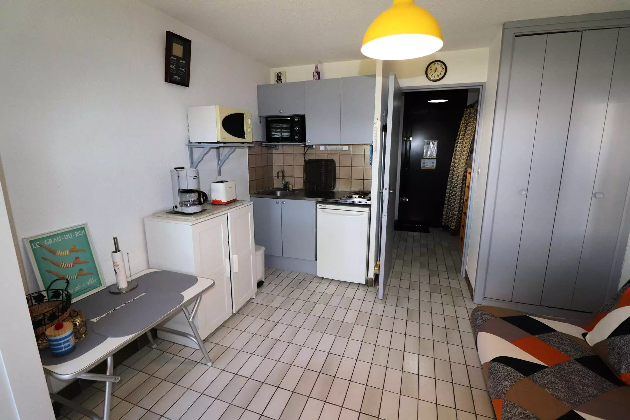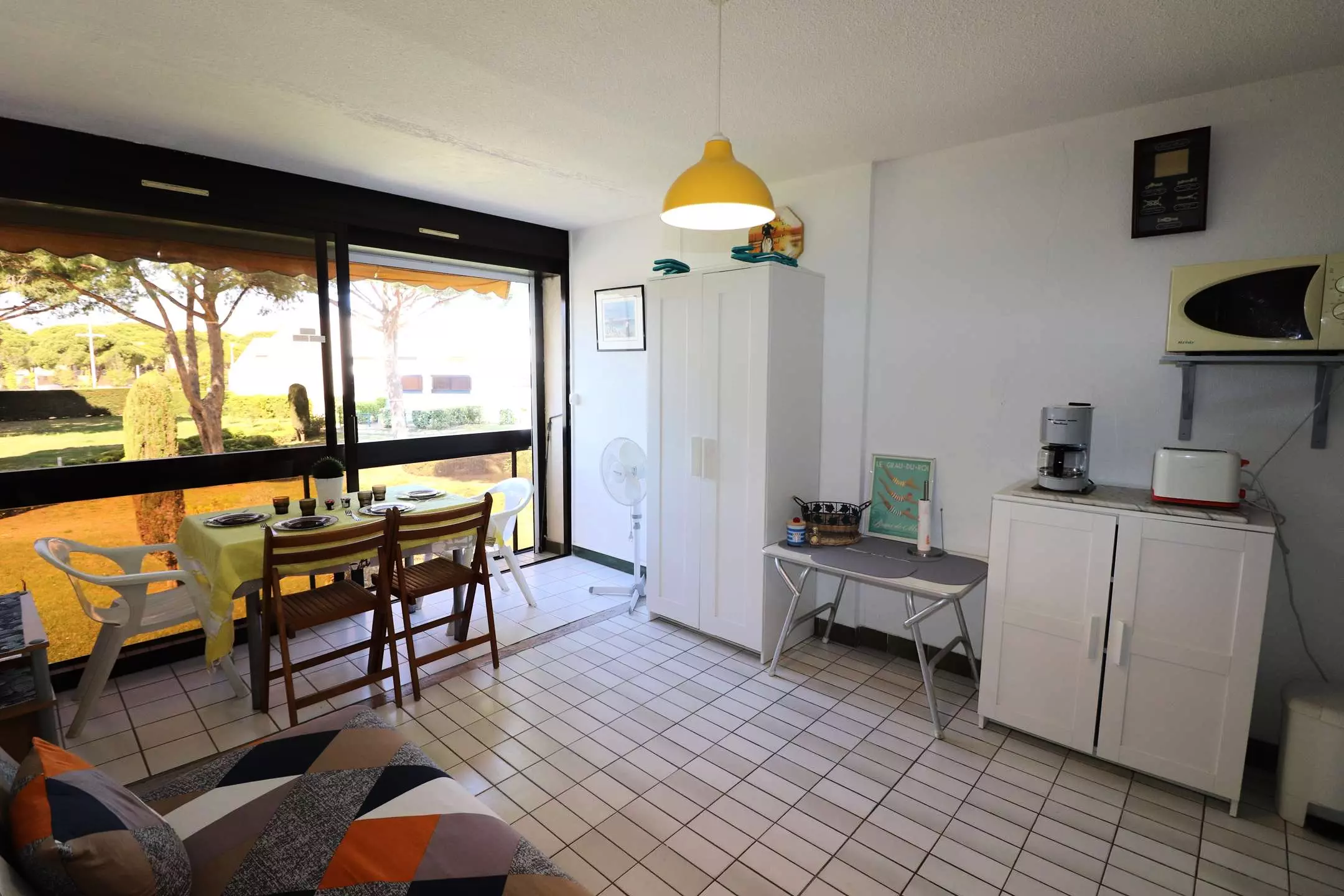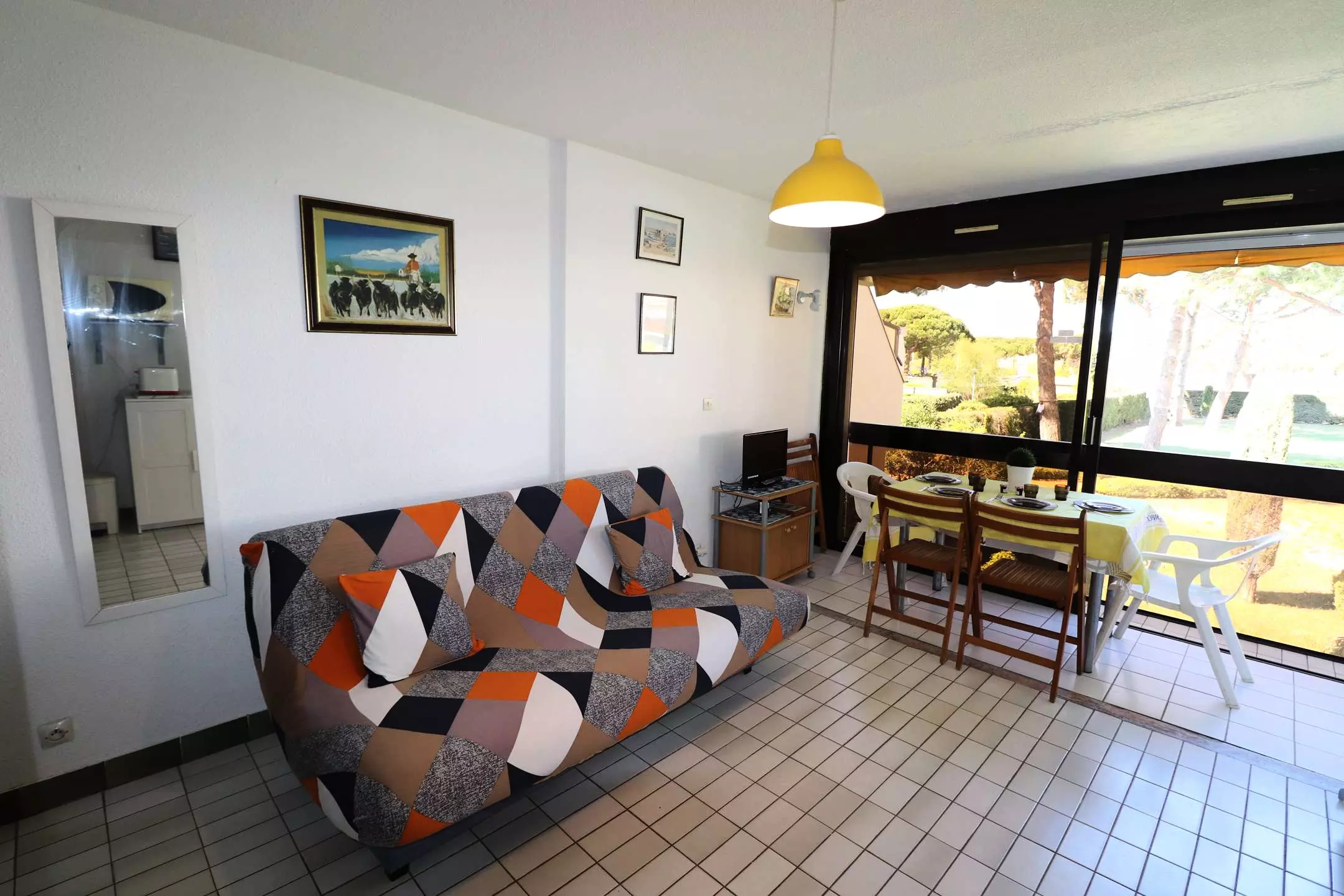 JARDINS DE LA BARONNIE Residence - Studio cabin on the floor, perfectly designed for 4 people. Entrance with cabin, bunk beds, shower room with WC. Equipped kitchenette, living room with double sofa bed, loggia area overlooking the residence's gardens. Private parking. Close to the beach and shops.