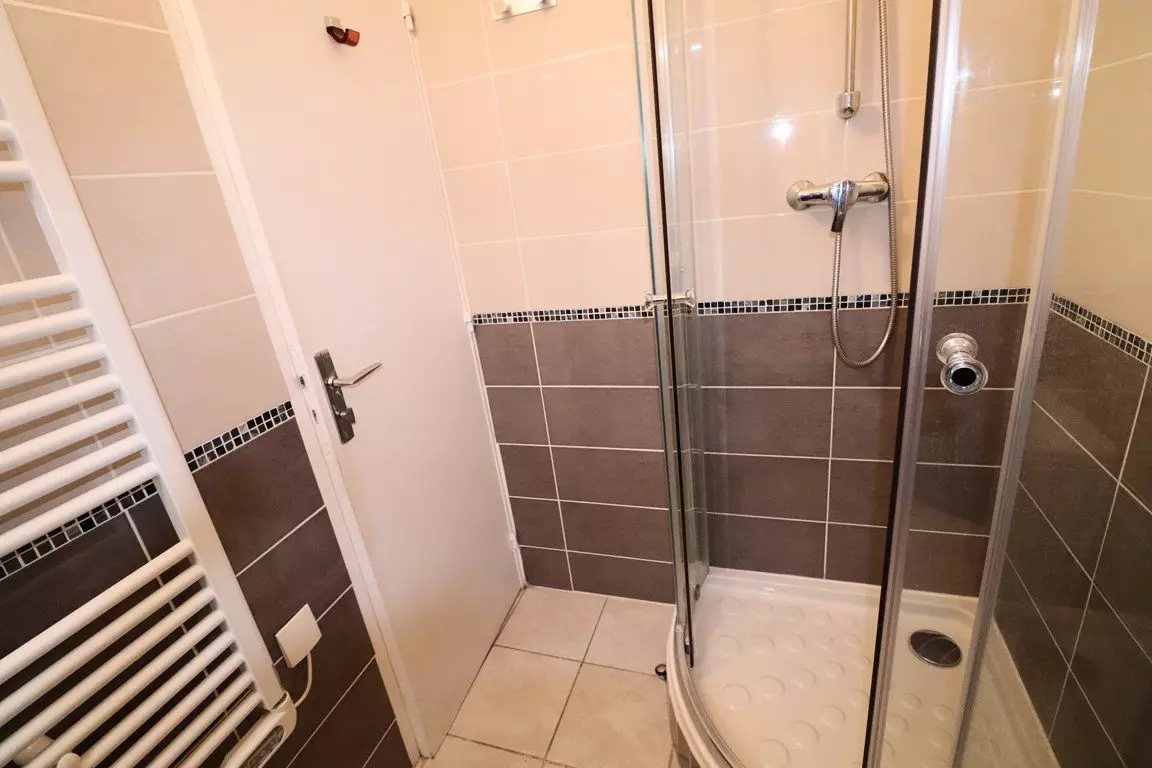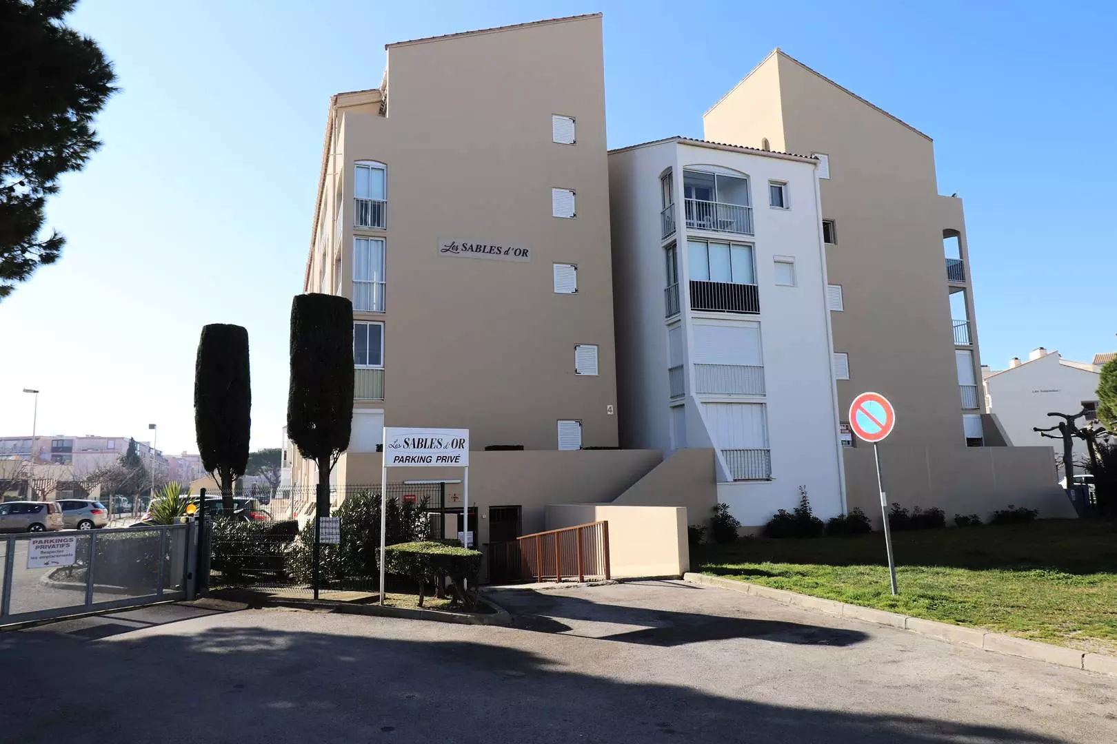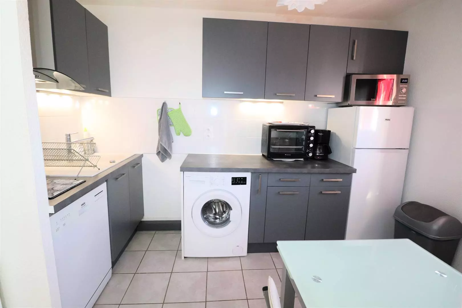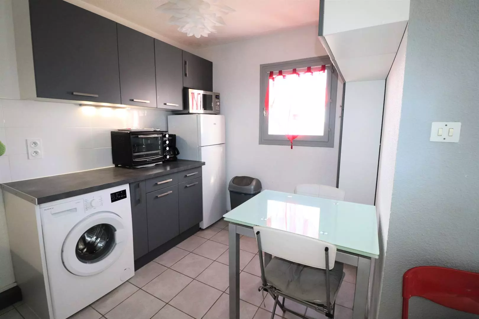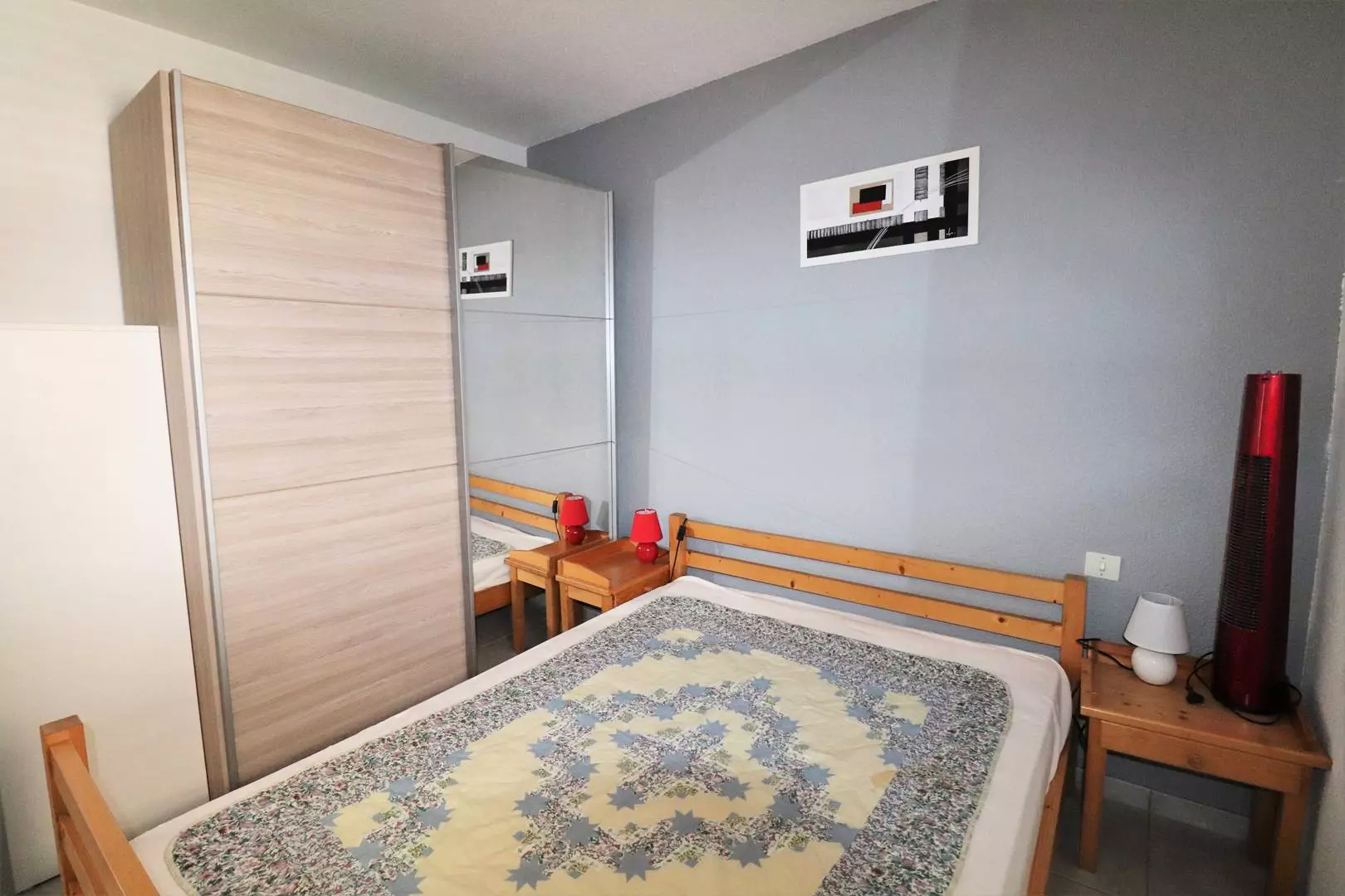 LES SABLES D'OR Residence – 2-room cabin apartment, very well-appointed, located on the 2nd floor with unobstructed views, close to the beach and shops, on the left bank of Grau-du-Roi. The apartment consists of an entrance hall, a cabin with 2 bunk beds, a bathroom with WC, and a bright kitchen area equipped with a washing machine, dishwasher, electric hob, oven, microwave and fridge-freezer. The living area, with a sofa bed for 2 people, opens onto a balcony with unobstructed views. The bedroom, also with a window, has a double bed and a storage wardrobe.