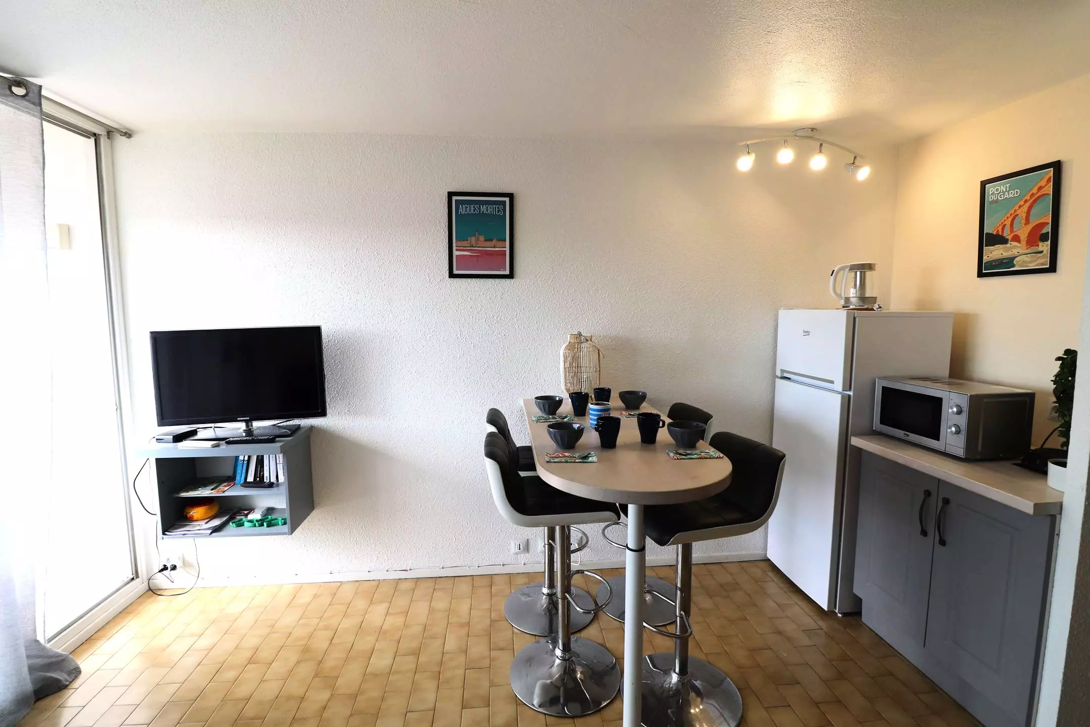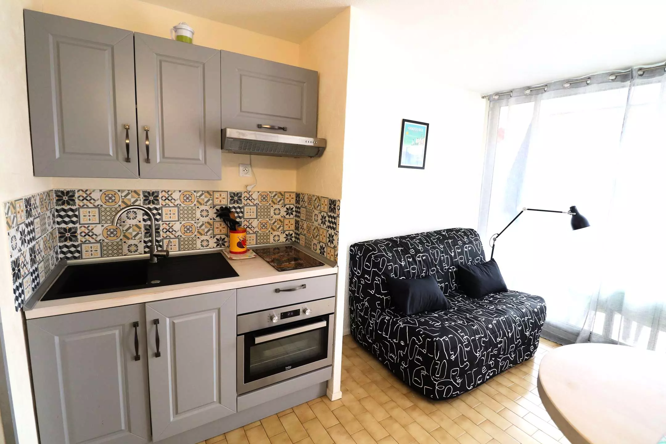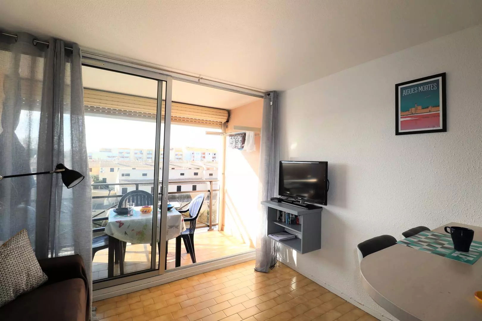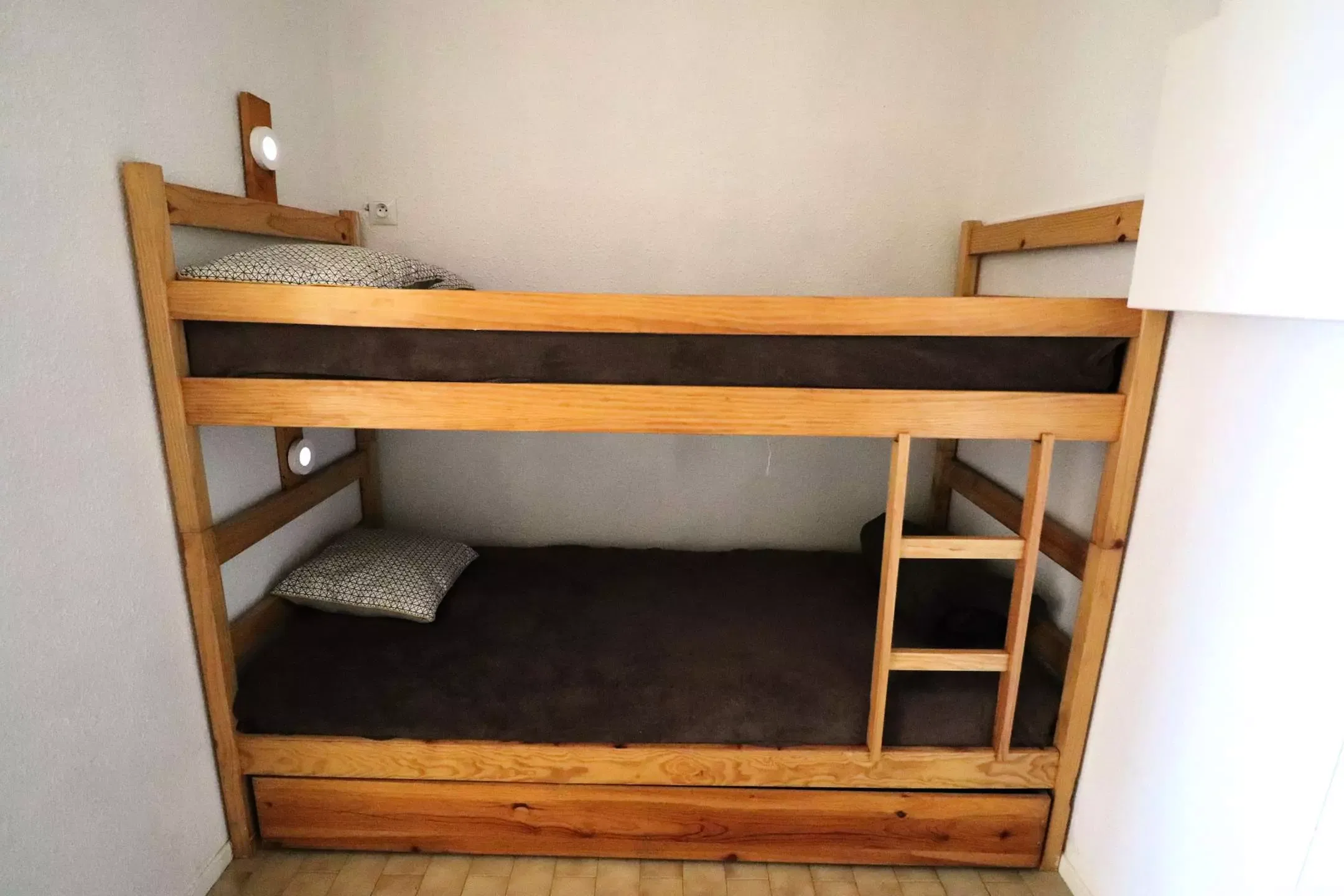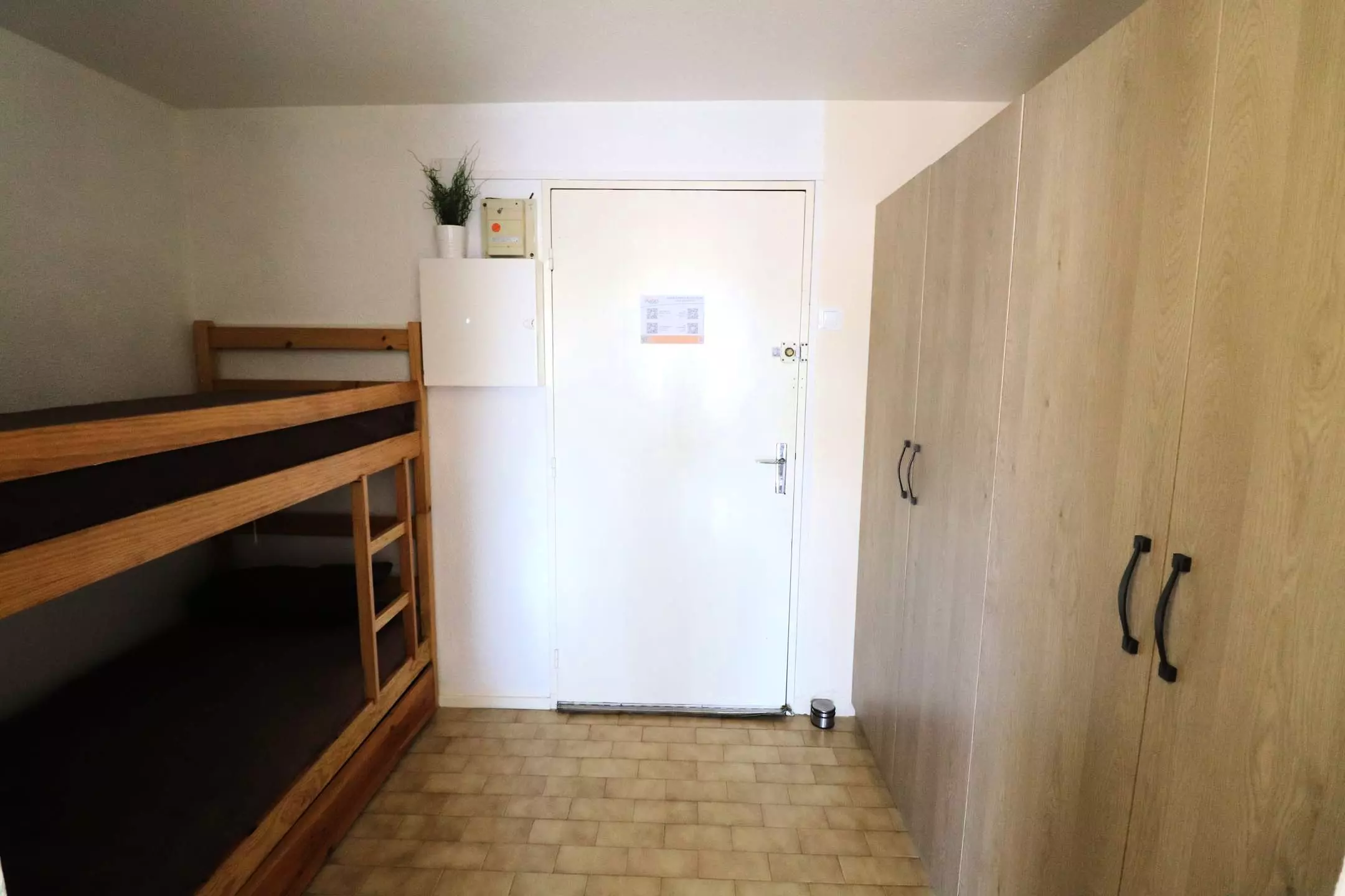 This air-conditioned Studio-Cabin apartment features a shower room, a separate toilet, a cabin with bunk beds, and a living room with a sofa, dining area, and fully equipped kitchenette. A storage closet is also provided at the entrance. The living room, bright thanks to a bay window, opens onto a loggia with a small garden furniture set and offers unobstructed views.