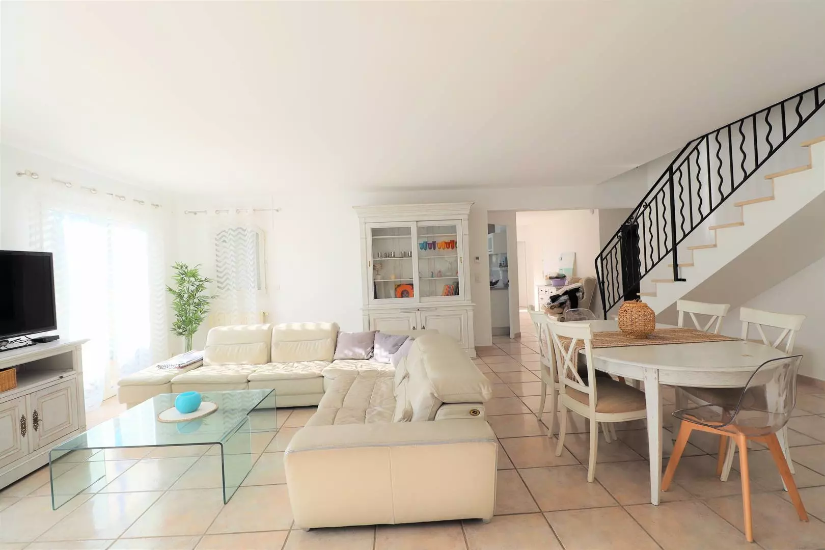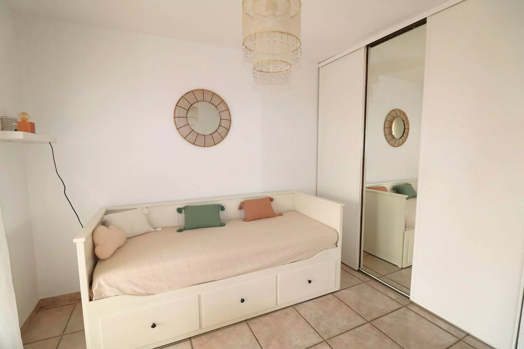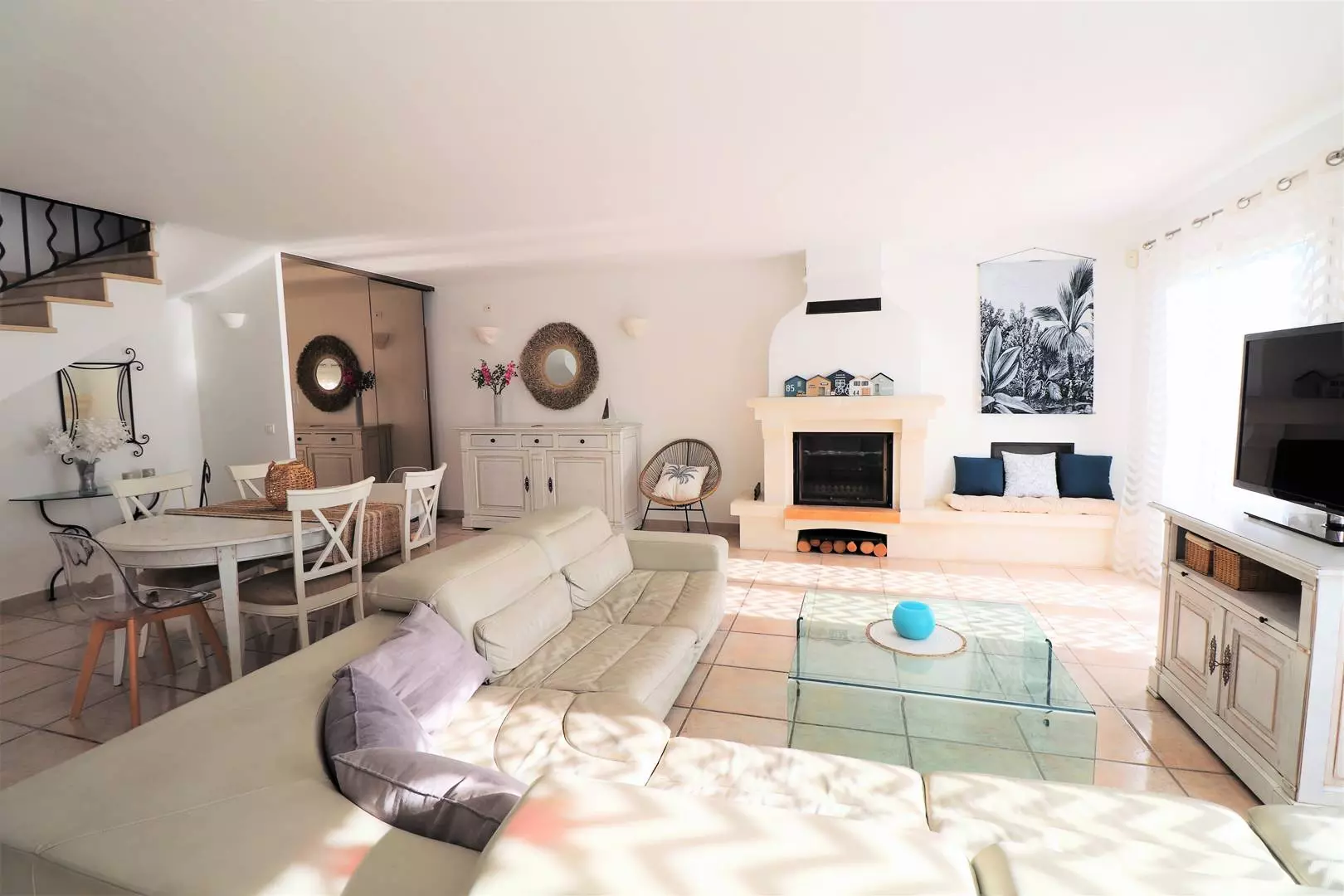 This villa is composed on the ground floor of an entrance hall, equipped kitchen (dishwasher, oven, microwave, vitro hob) opening onto a furnished terrace. Living room of 41m² opening onto the outdoor terrace and the swimming pool, a bedroom with 2 single beds and cupboards, a bedroom with 1 double bed and cupboards. Bathroom, separate toilet. Upstairs: shower room, separate toilet, a bedroom with a large cupboard and a double bed, another bedroom with 2 single beds and cupboards. The 2 bedrooms open onto a 10m² outdoor terrace. Air conditioning in each bedroom except one with fan. 2 indoor parking spaces and 1 outdoor parking space.