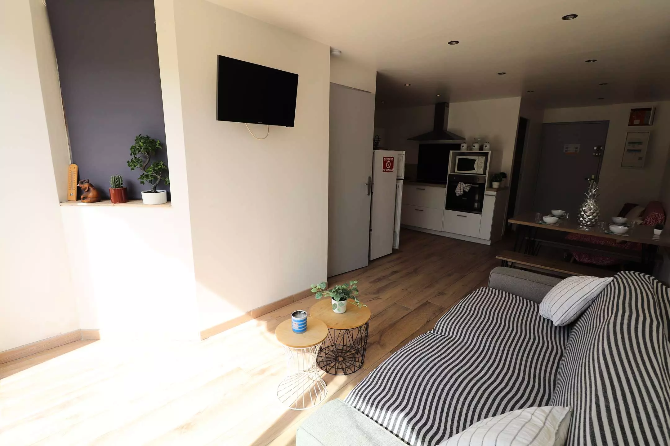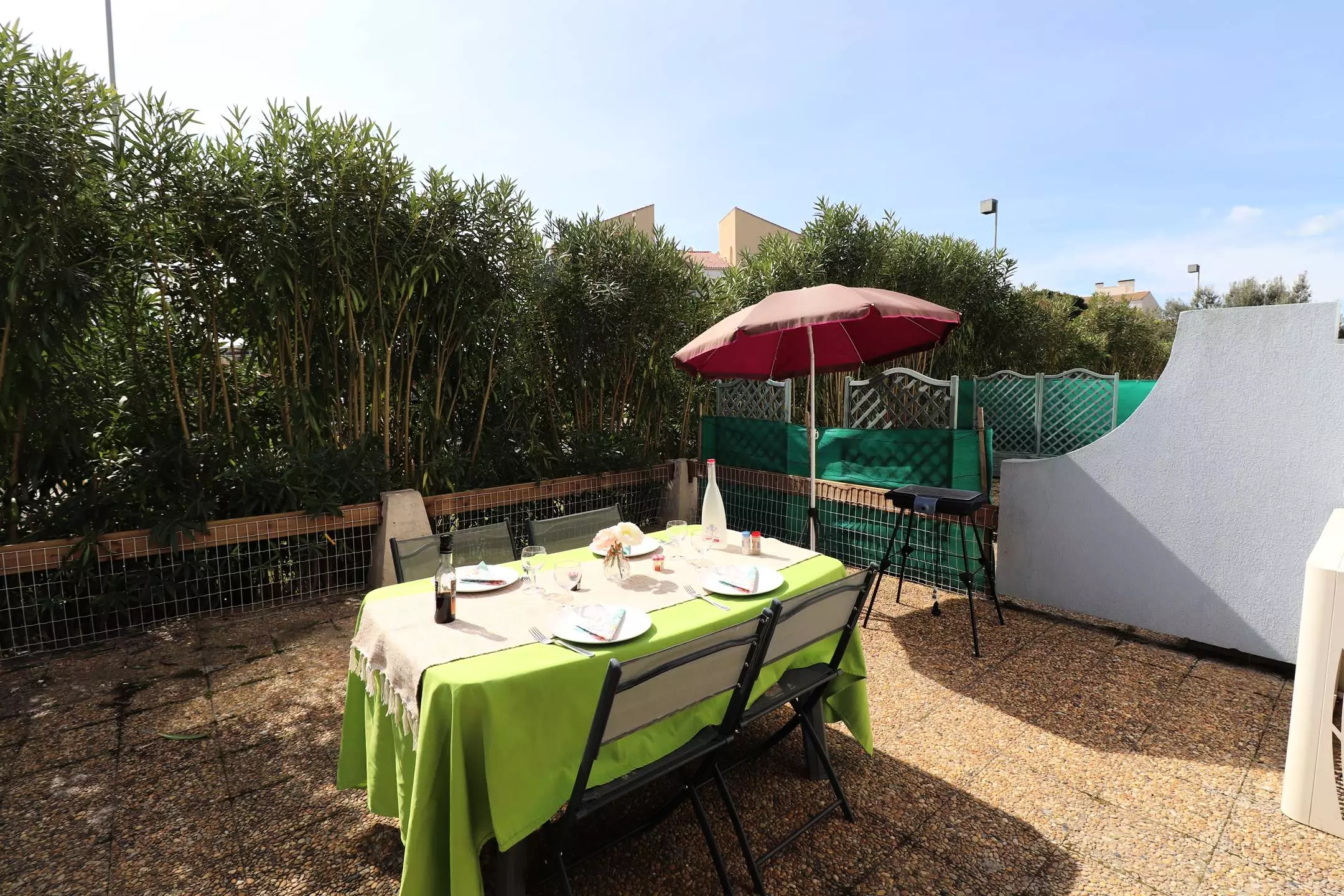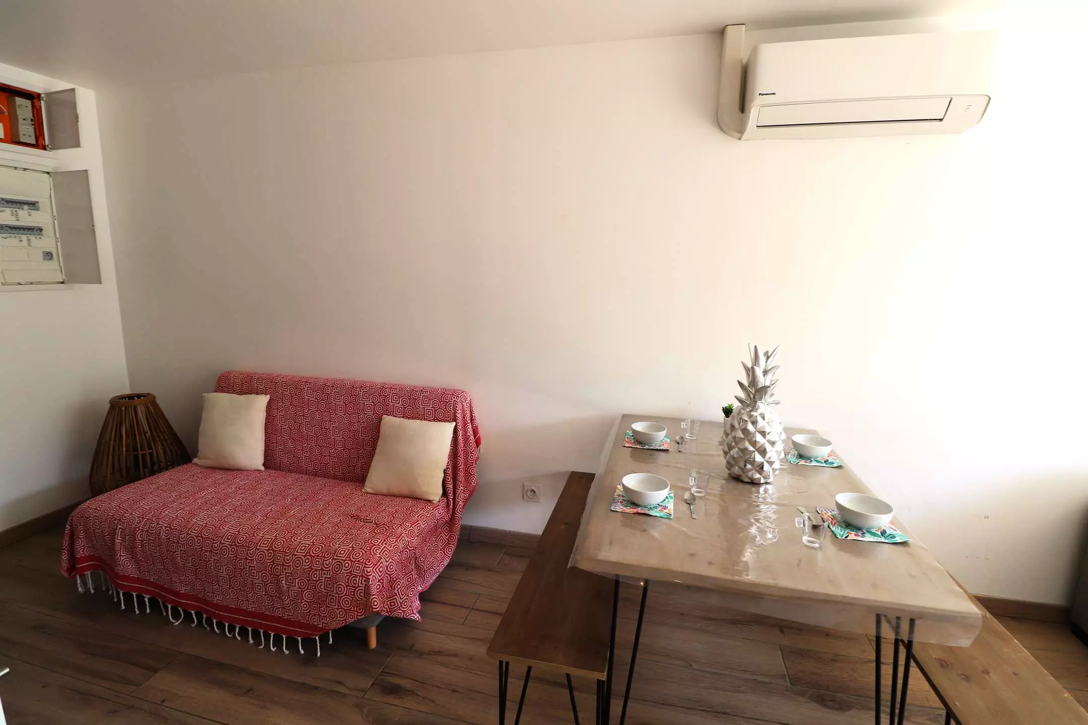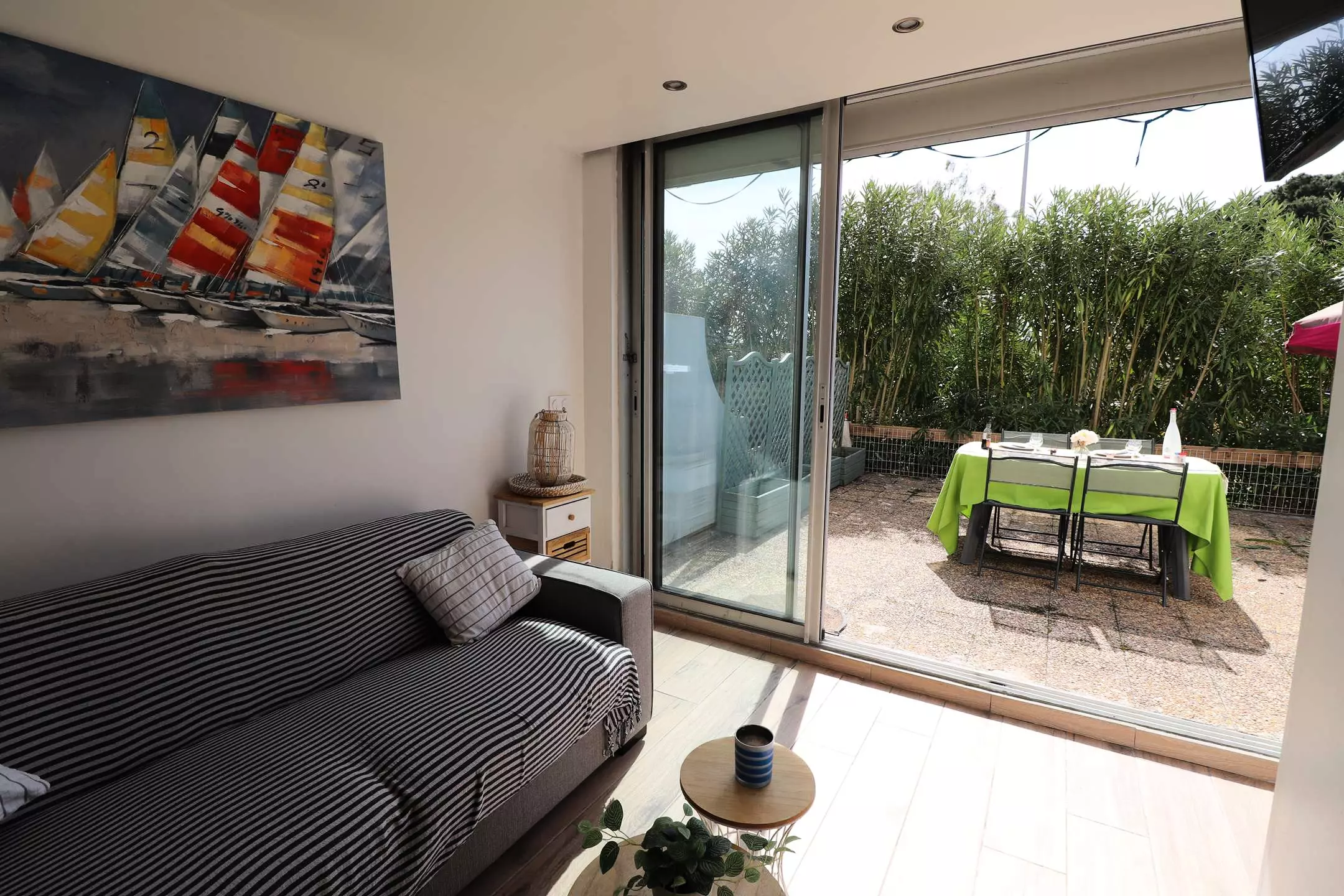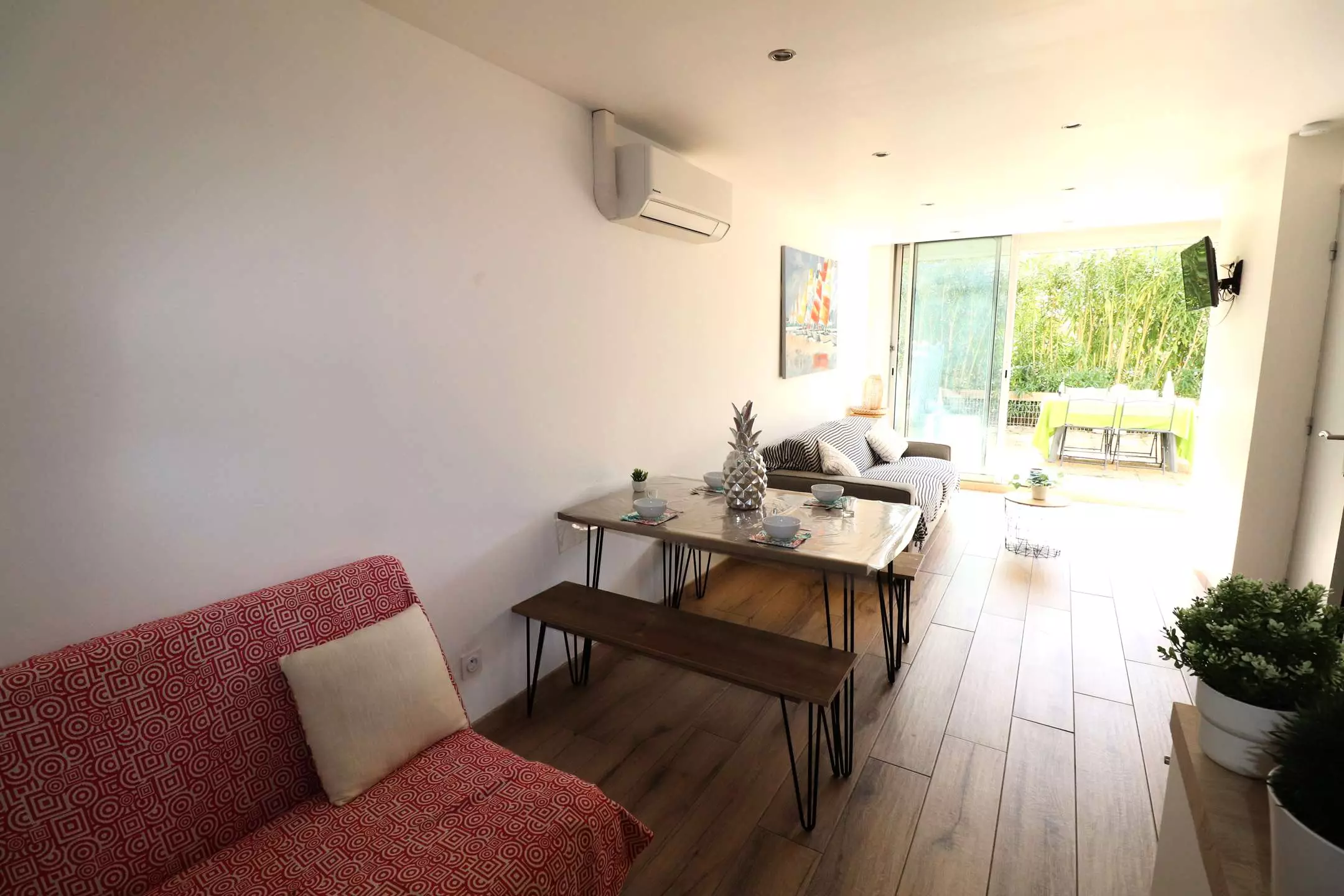 Residence LES FLORALIES 2 - In an environment prized for its vegetation, swimming pools, children's games, boules games in the residence, close to shops at 200m and sea at 700m. 2 rooms on the raised ground floor composed of a bathroom with toilet, a large living room with a multifunctional kitchen area, air conditioning, sofa bed for 2 people, a bedroom with window, a beautiful terrace facing south equipped with an awning to enjoy meals outside in the shade or in the sun.