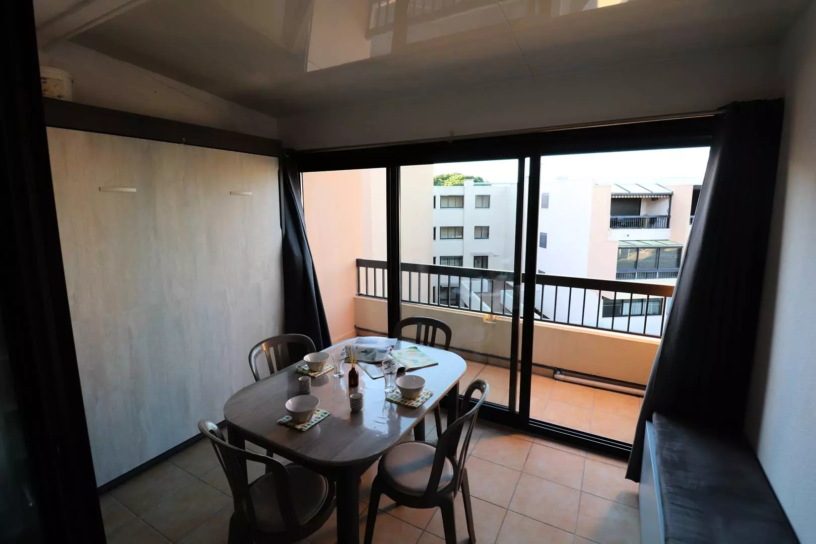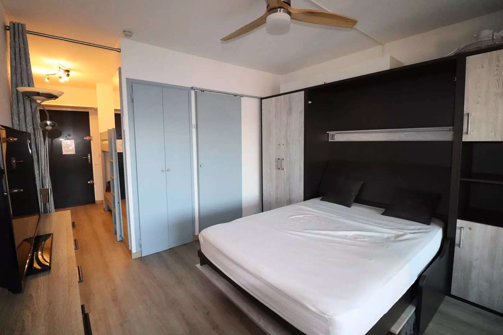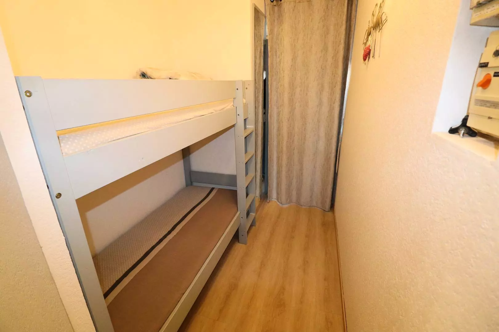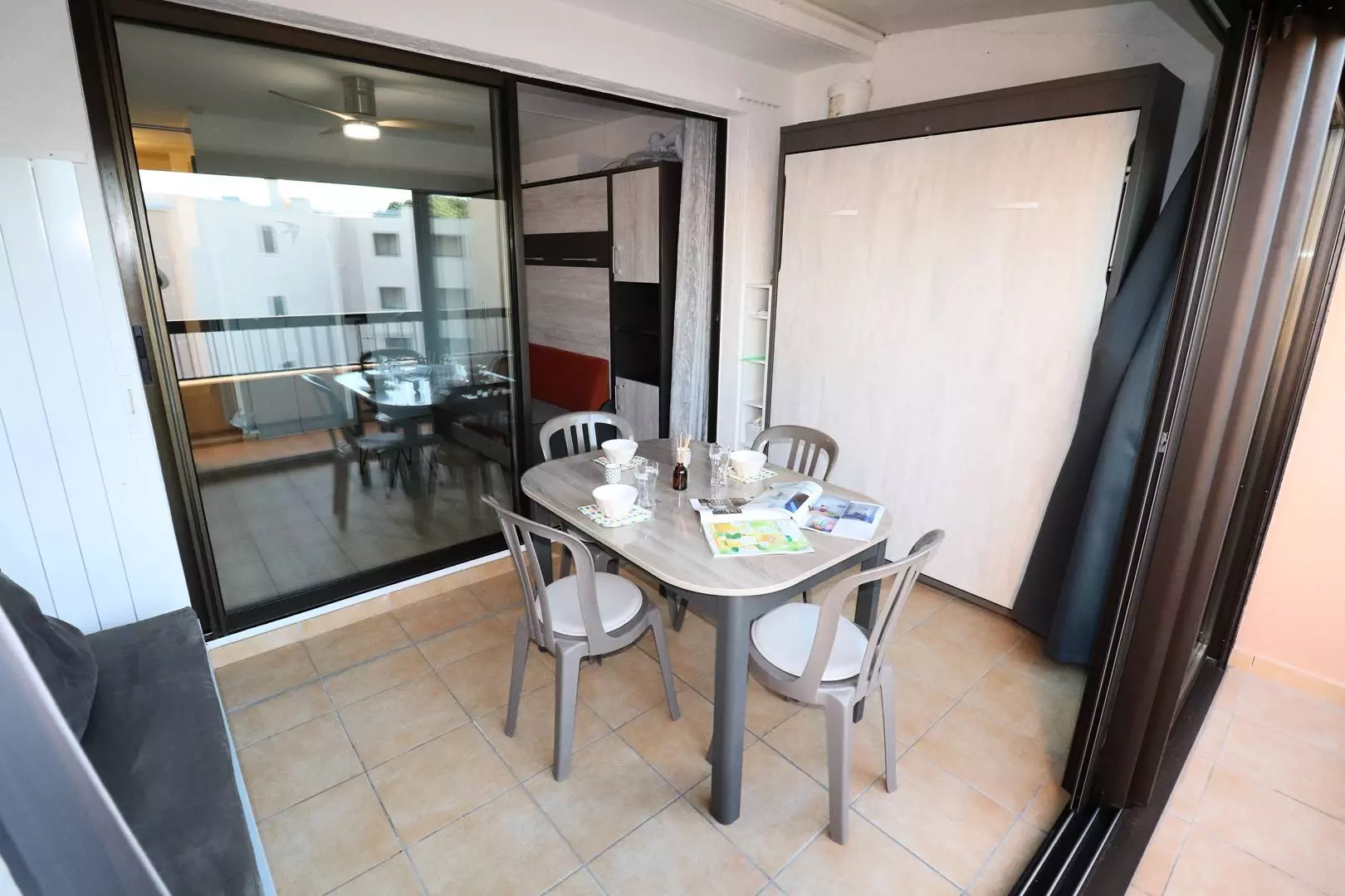 This fully equipped studio cabin is composed at the entrance of a shower room and its WC, 2 bunk beds in the cabin space, living room with fold-away bed, closed kitchen, glazed loggia where you will find peace and quiet to make your holiday meals.