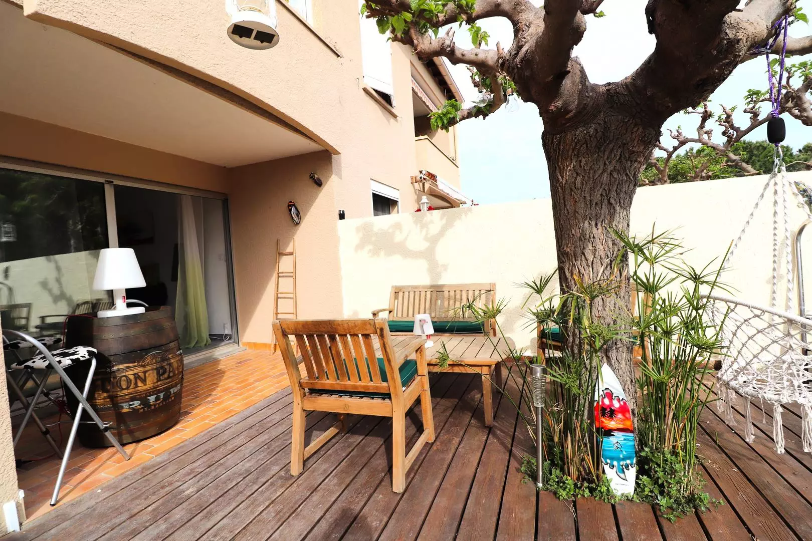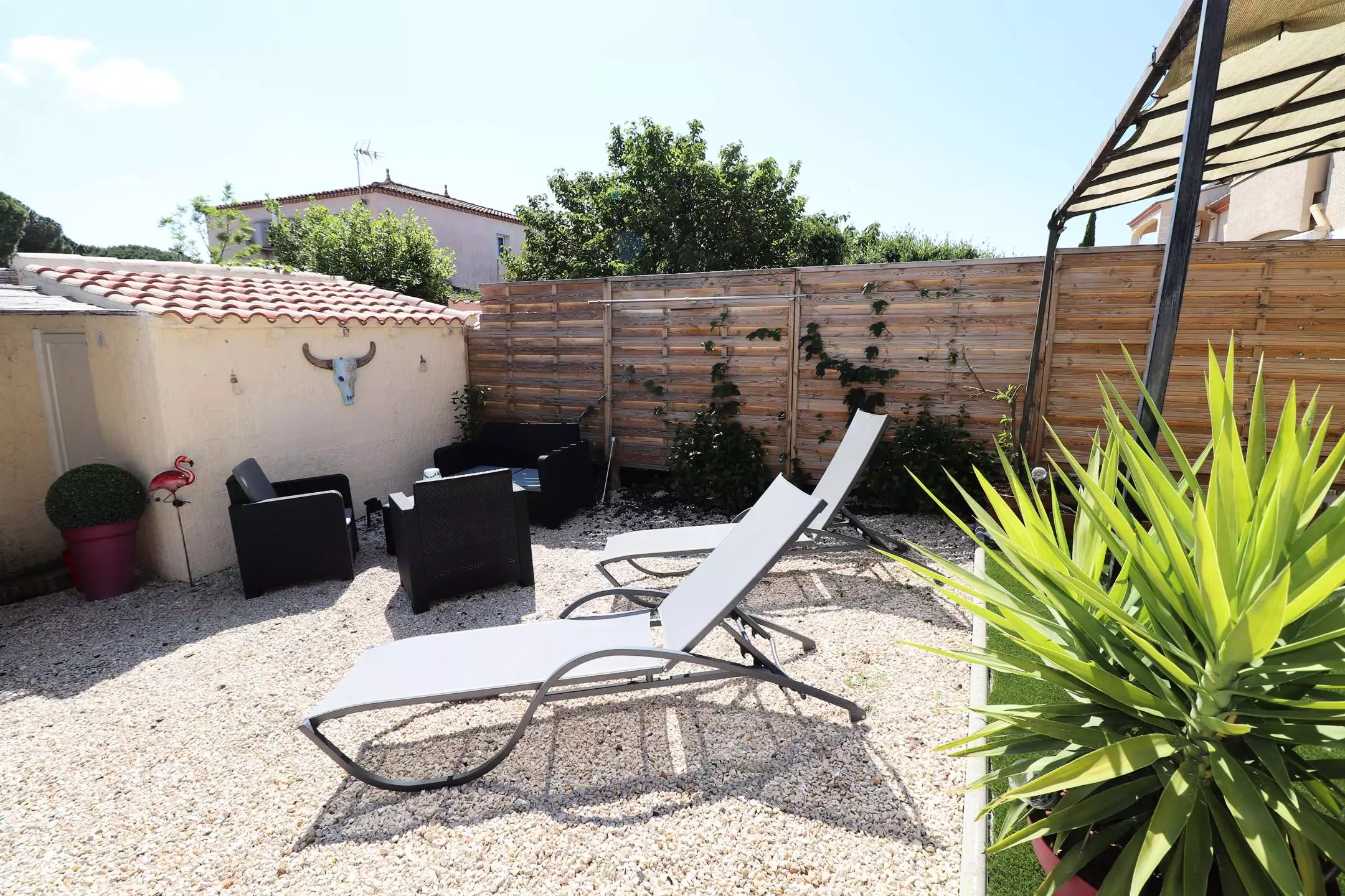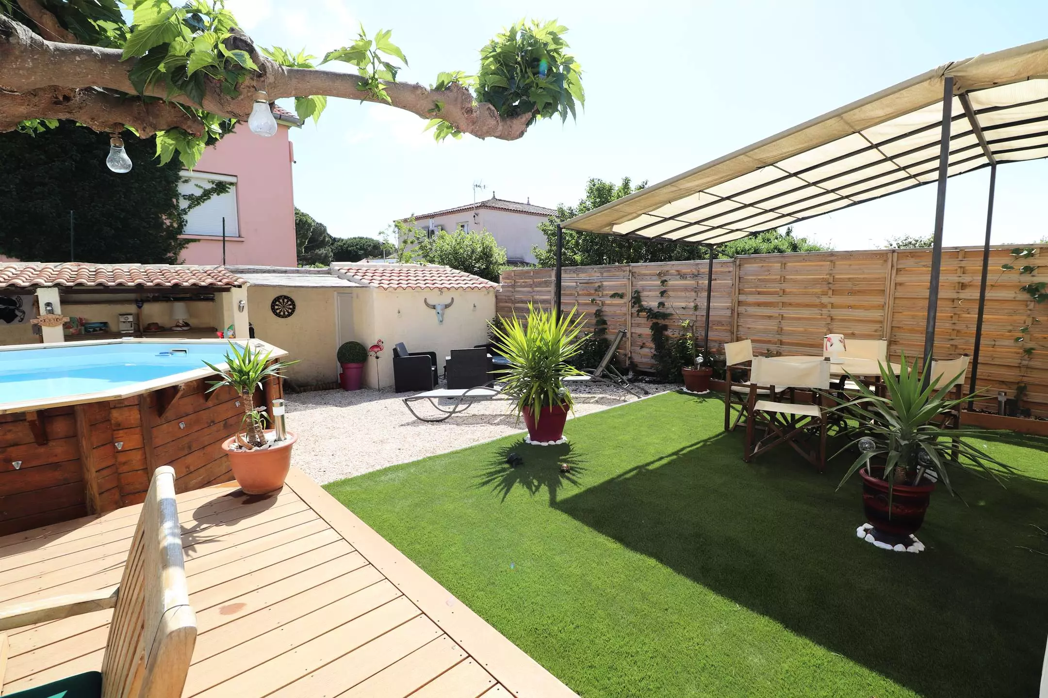 The living room opens onto a 120m² garden where you can relax by the private swimming pool, on the garden furniture or in the cabin area equipped with a summer kitchen and plancha to enjoy your grilled food in the sun.
