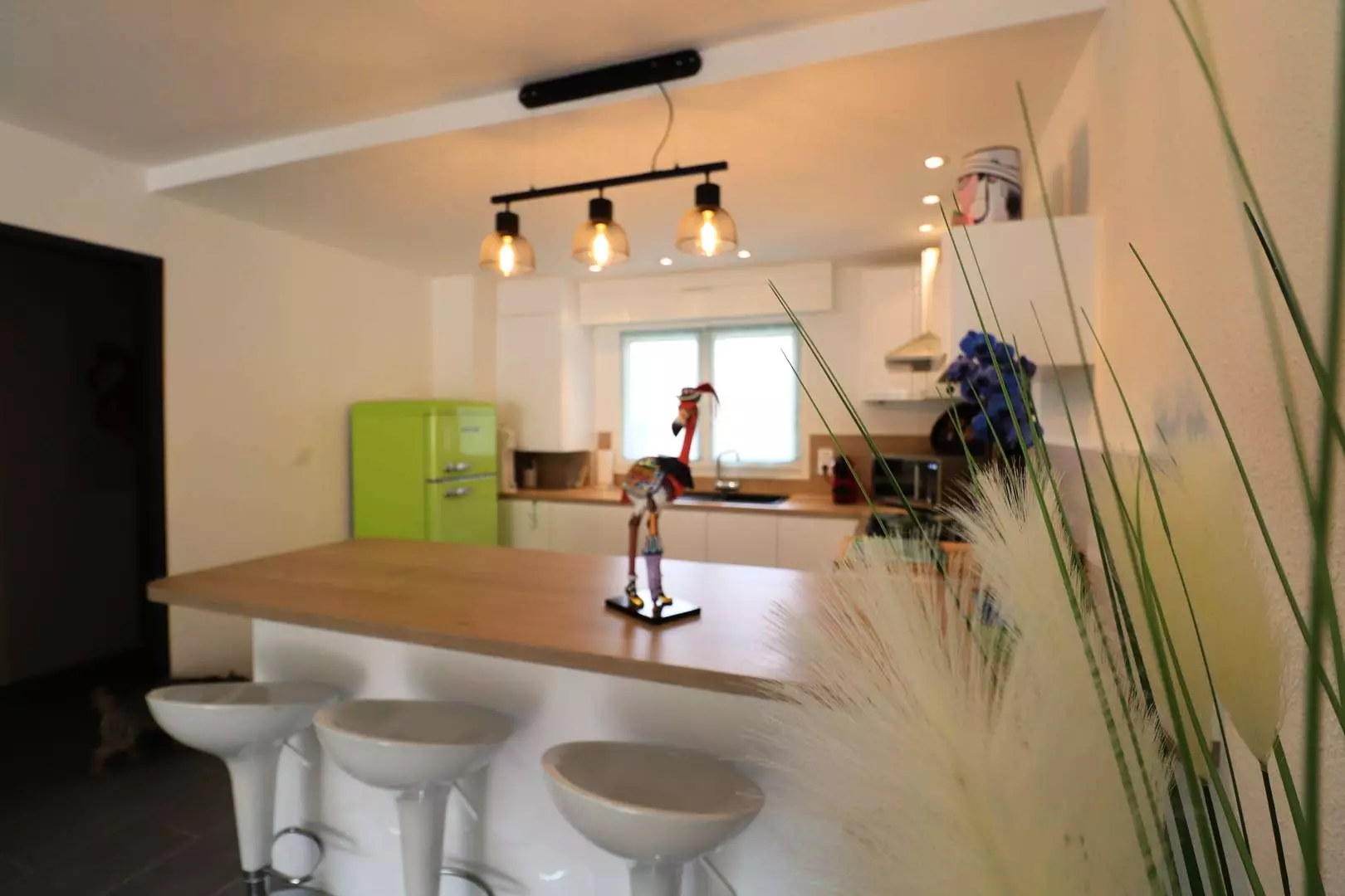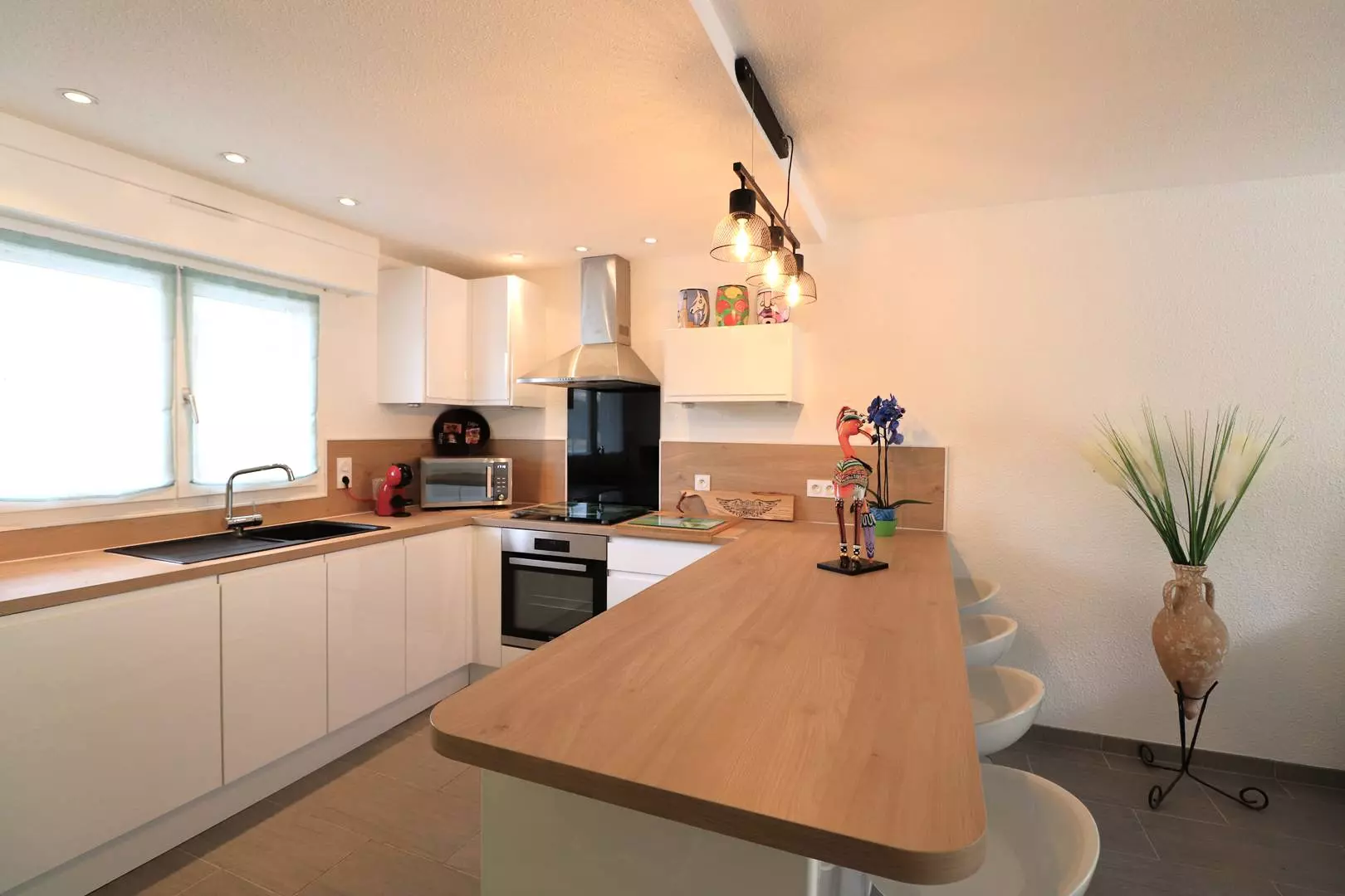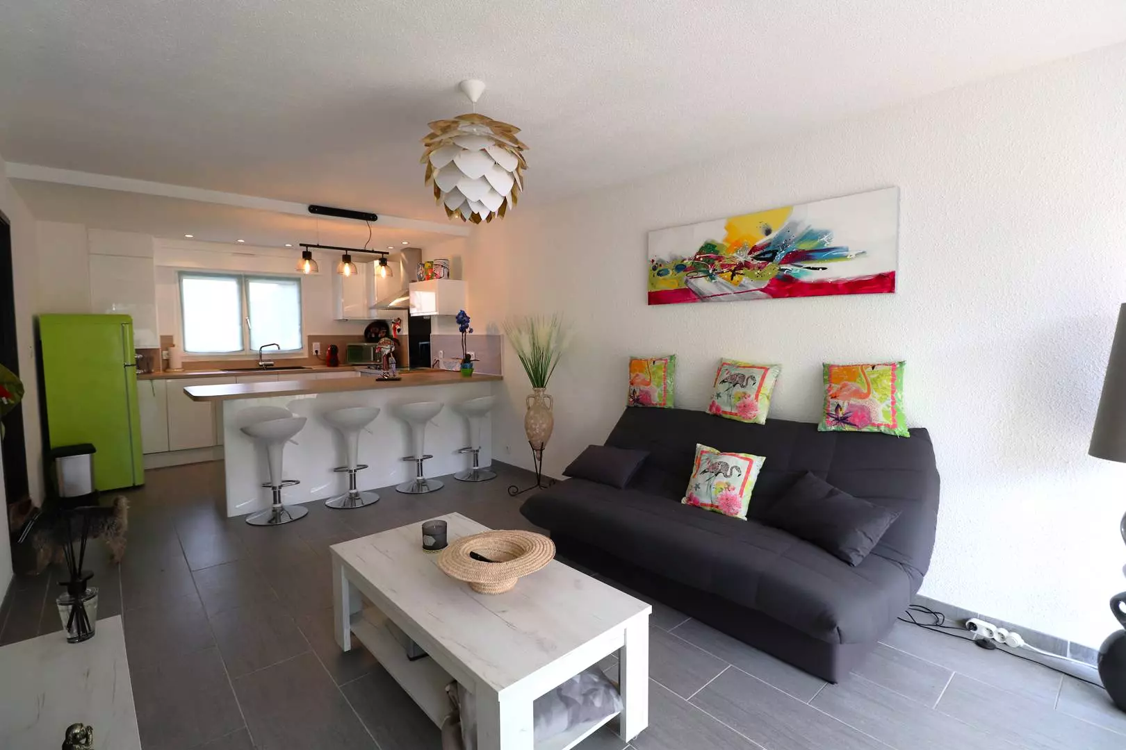The living room opens onto a 120m² garden where you can relax by the private swimming pool, on the garden furniture or in the cabin area equipped with a summer kitchen and plancha to enjoy your grilled food in the sun.