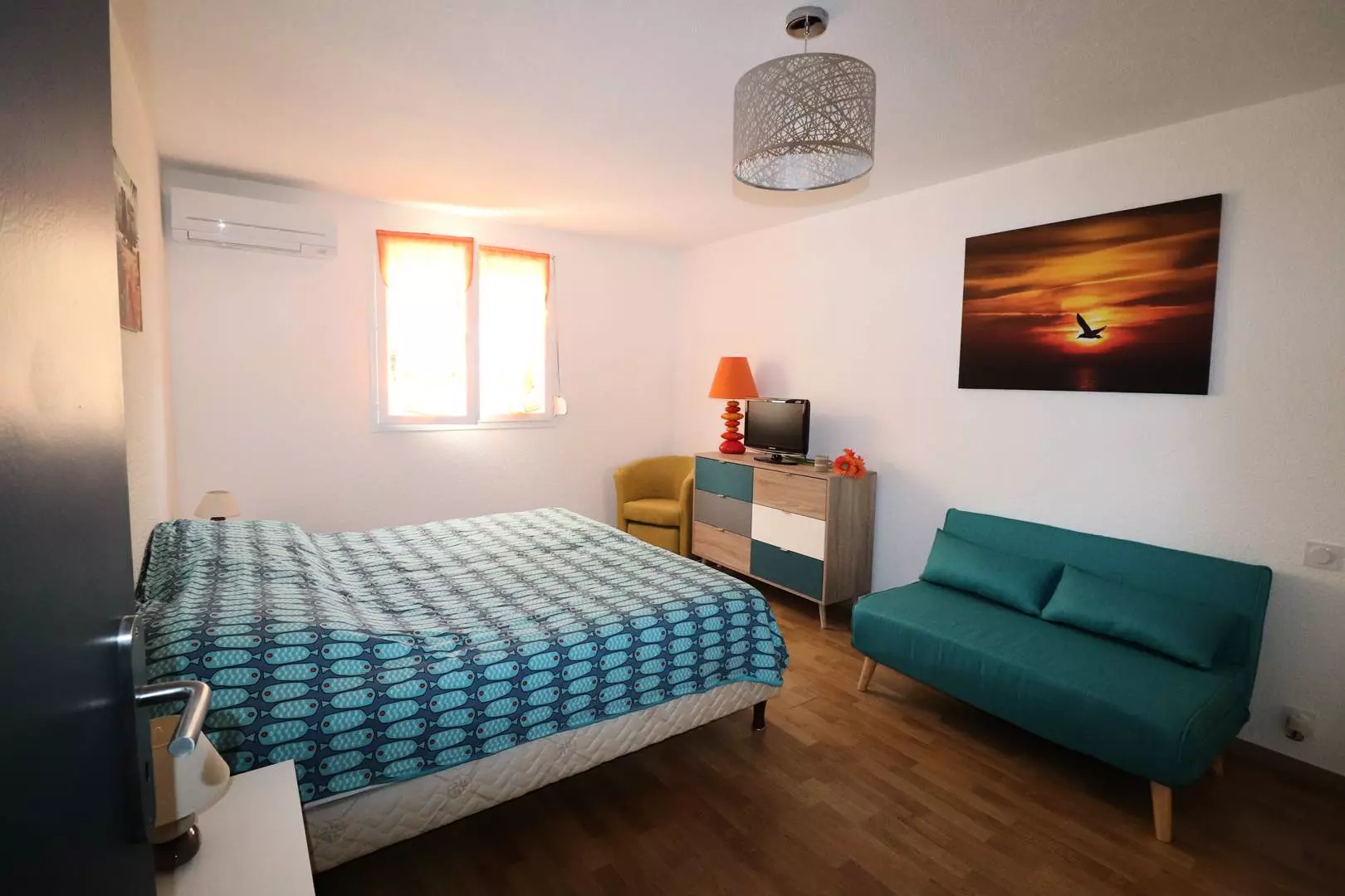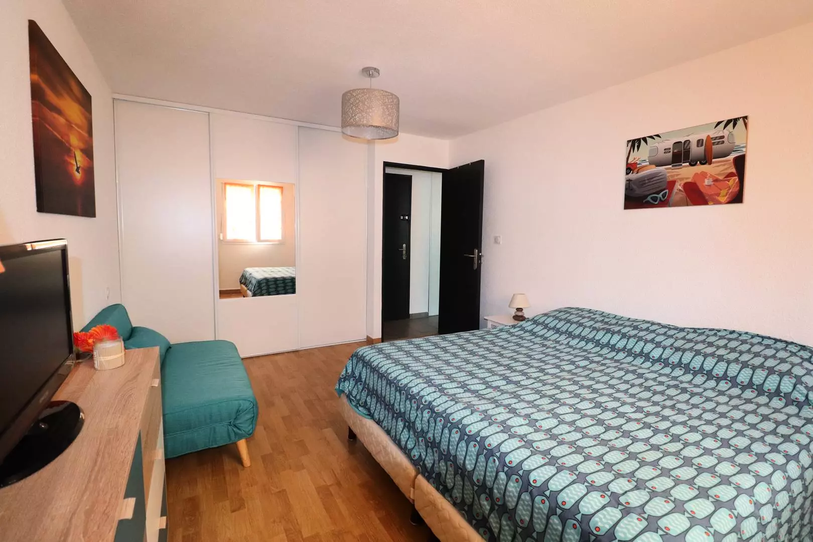 2 bedrooms with wardrobes, one with a double bed, a chest of drawers and a TV, and the other with 2 single beds that can be put together, a chest of drawers and a TV. All rooms have air conditioning.