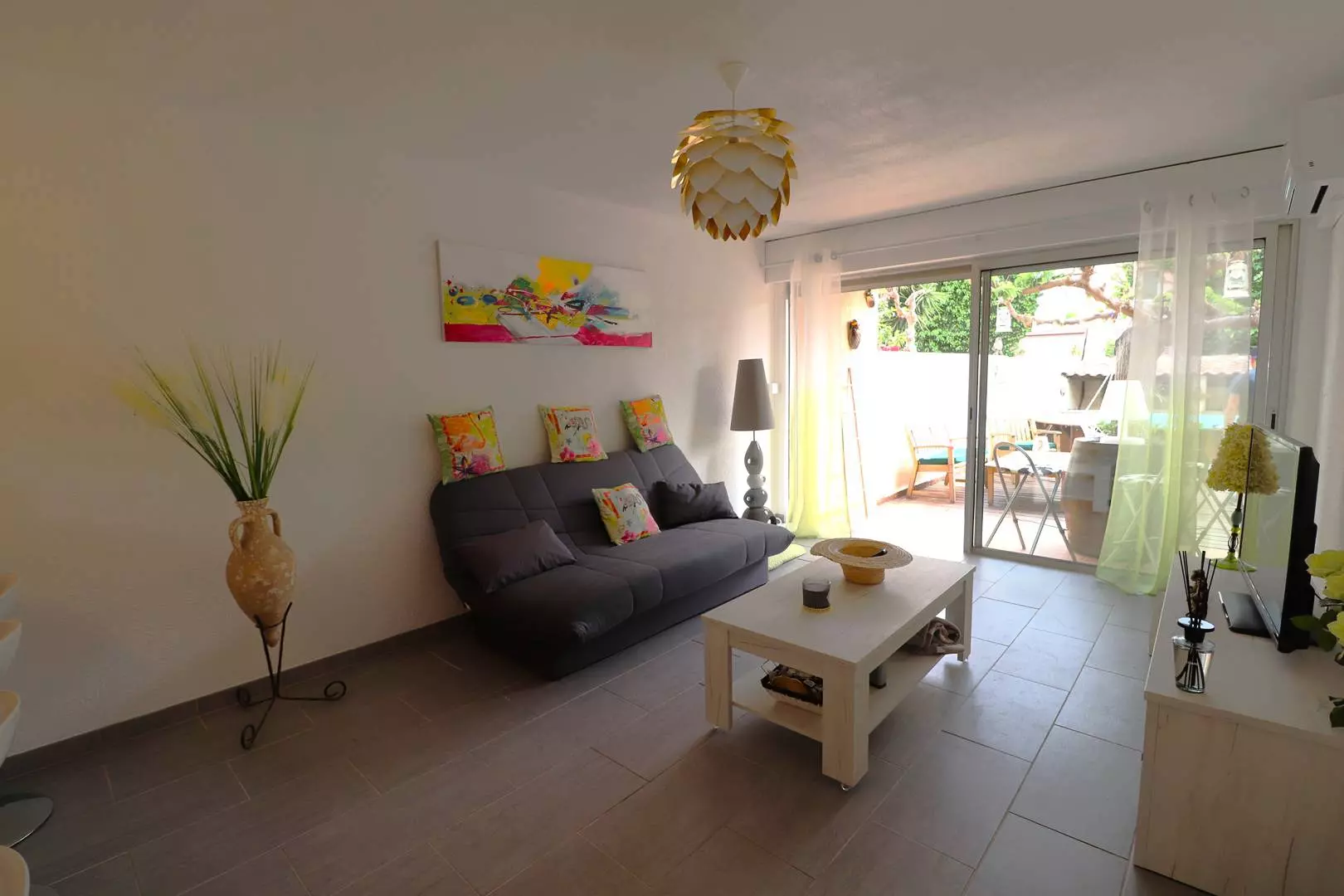 Rated 3 stars; this 3-room apartment for 6 people on the garden level located on the right bank of the Grau du Roi in the Boucanet district, consists of a large living room including a 2-person sofa bed, a very well-equipped open kitchen.