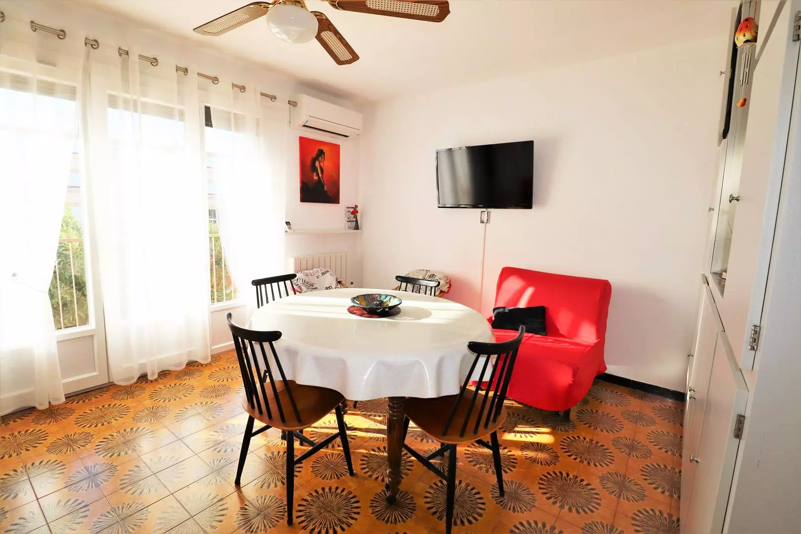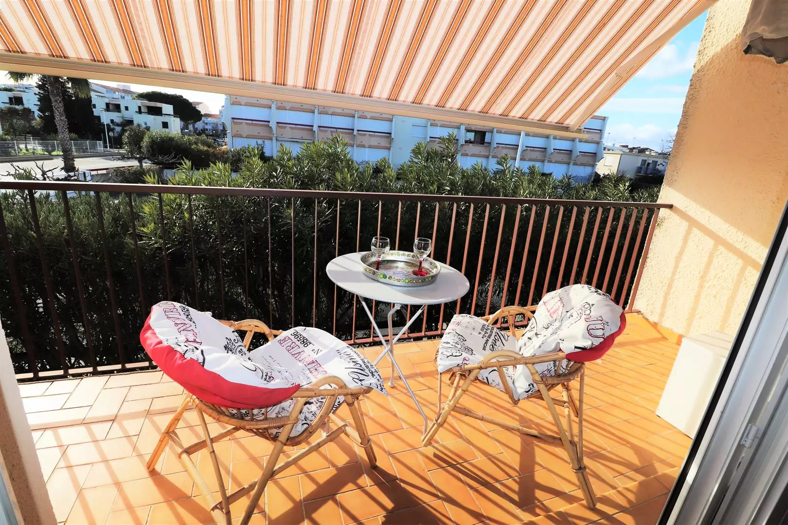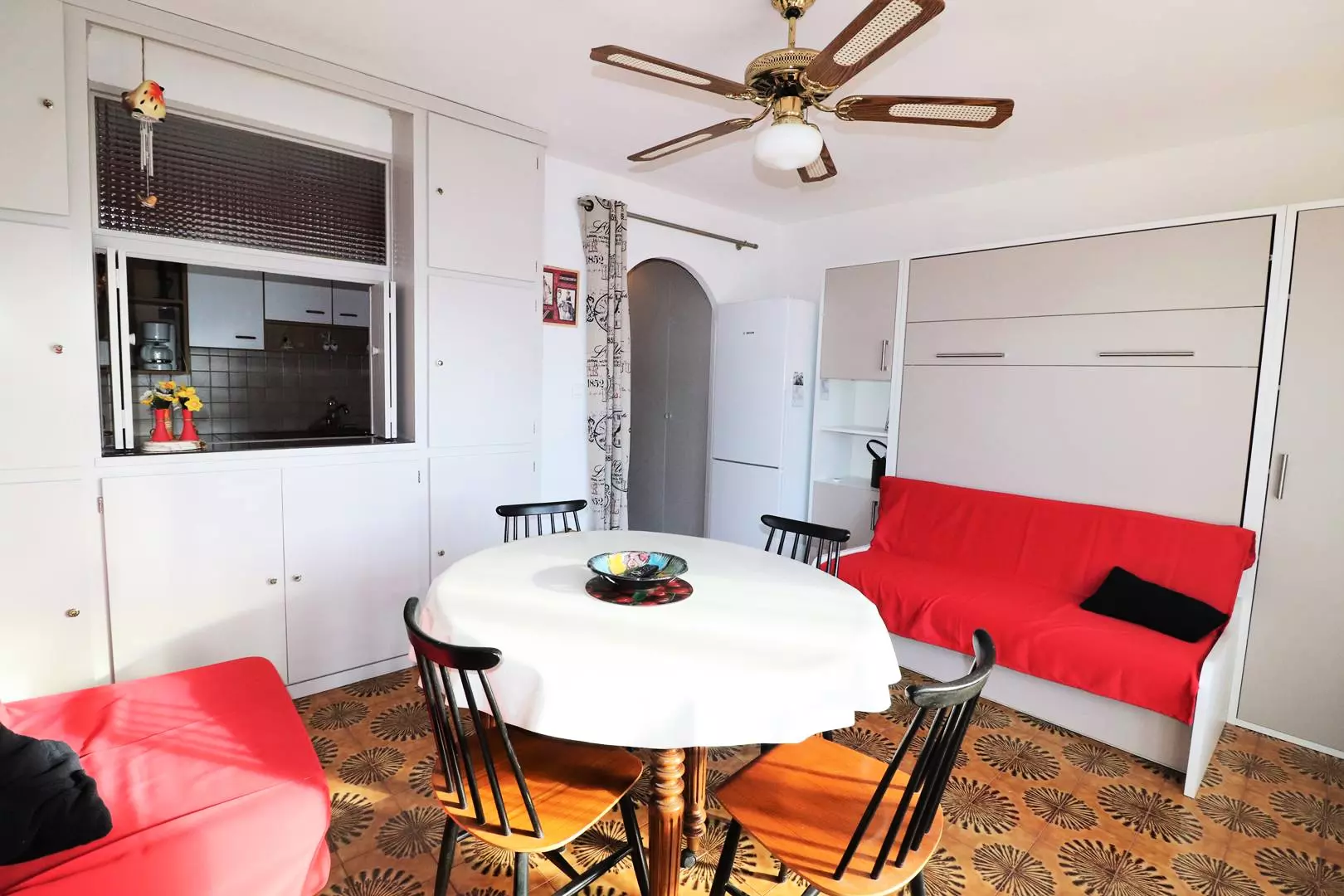 At the entrance, a newly renovated shower room and separate toilet, large storage cupboard, kitchen opening onto the living room with serving hatch, air conditioning, fold-away bed, sofa bed + a fireside chair for 4 people. Terrace with garden furniture facing west.