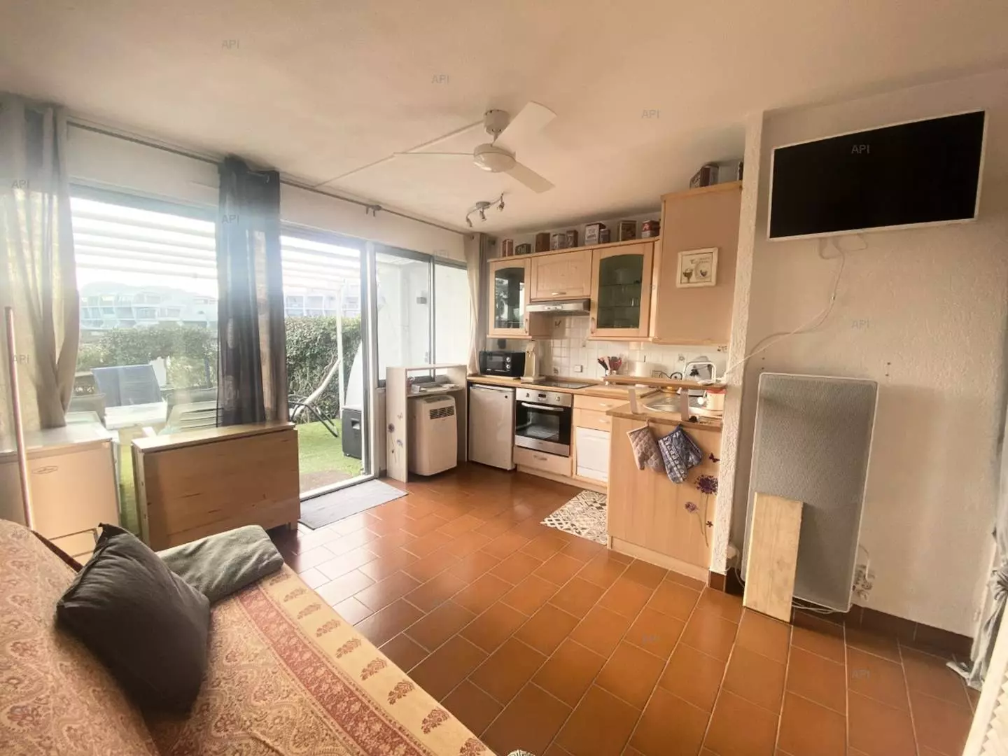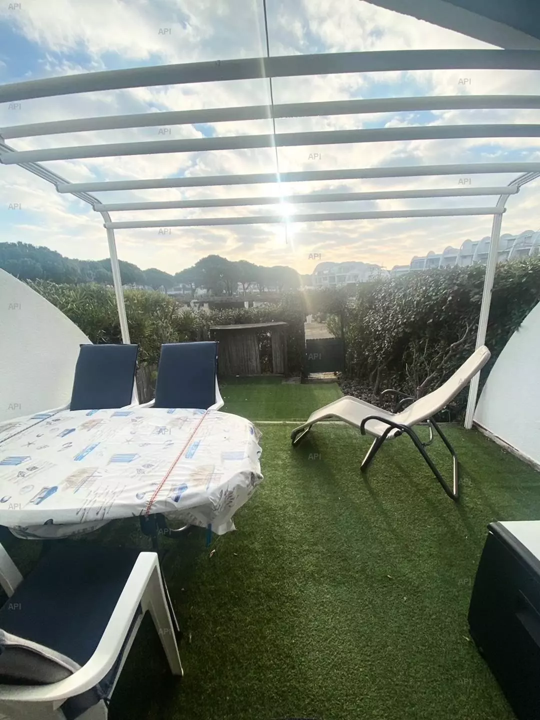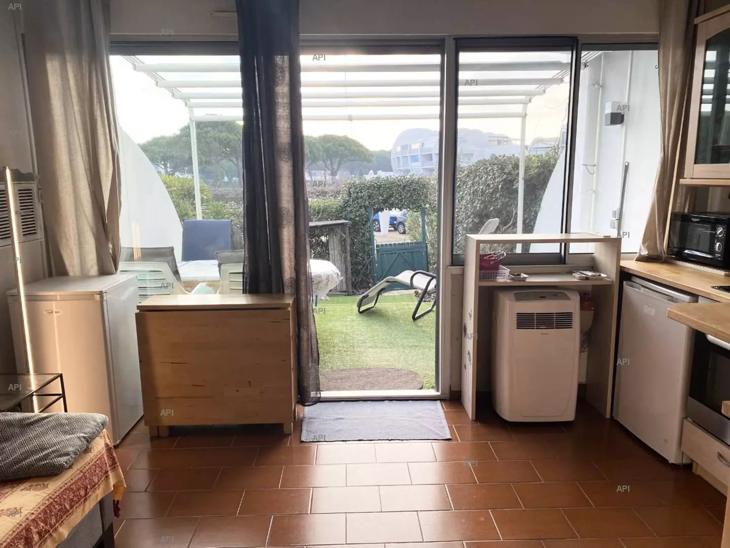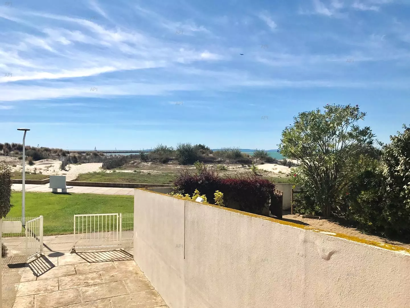 PORT CAMARGUE - SOUTH BEACH - Direct access to the beach. Luxury residence Studio cabin of 25 m² on the ground floor. Composed of an air-conditioned living room (Mobile air conditioning) with a 140 cm sofa bed, a TV and Wi-Fi, opening onto a terrace with its furniture and a small garden, a fully equipped kitchen (Microwave, oven, dishwasher, top fridge, hob), a cabin at the entrance with 2 single beds 90 cm, a bathroom with washing machine and a separate toilet. Secure shared parking. Close to shopping center, restaurants, nautical activities and public transport. Furnished and equipped for 4 people. Pets are not allowed.