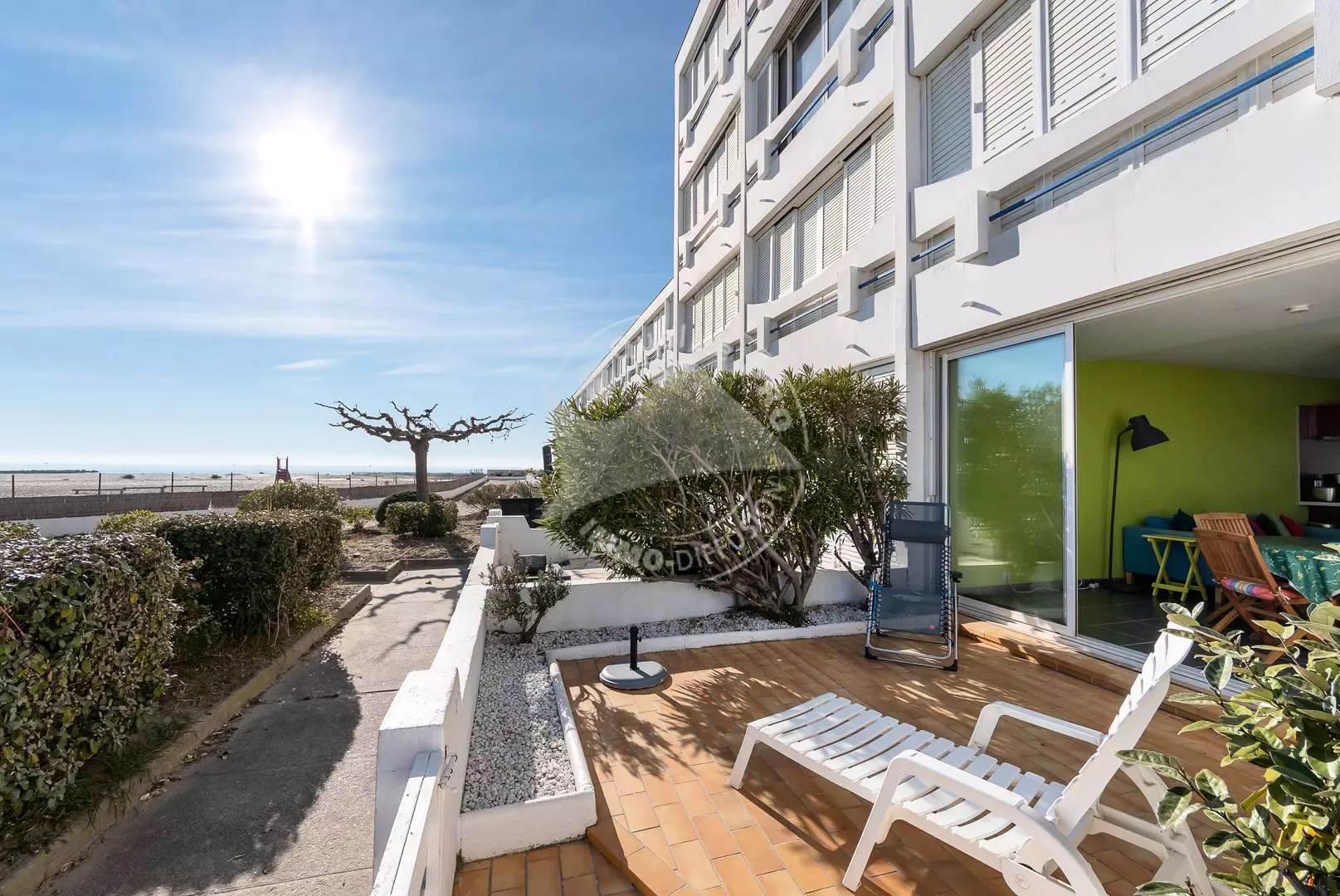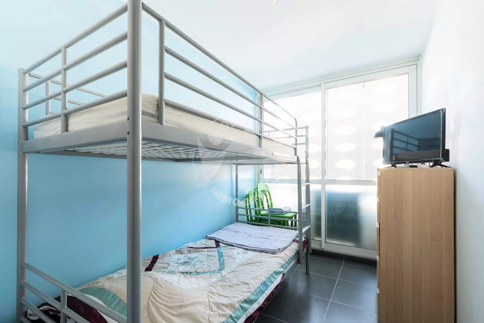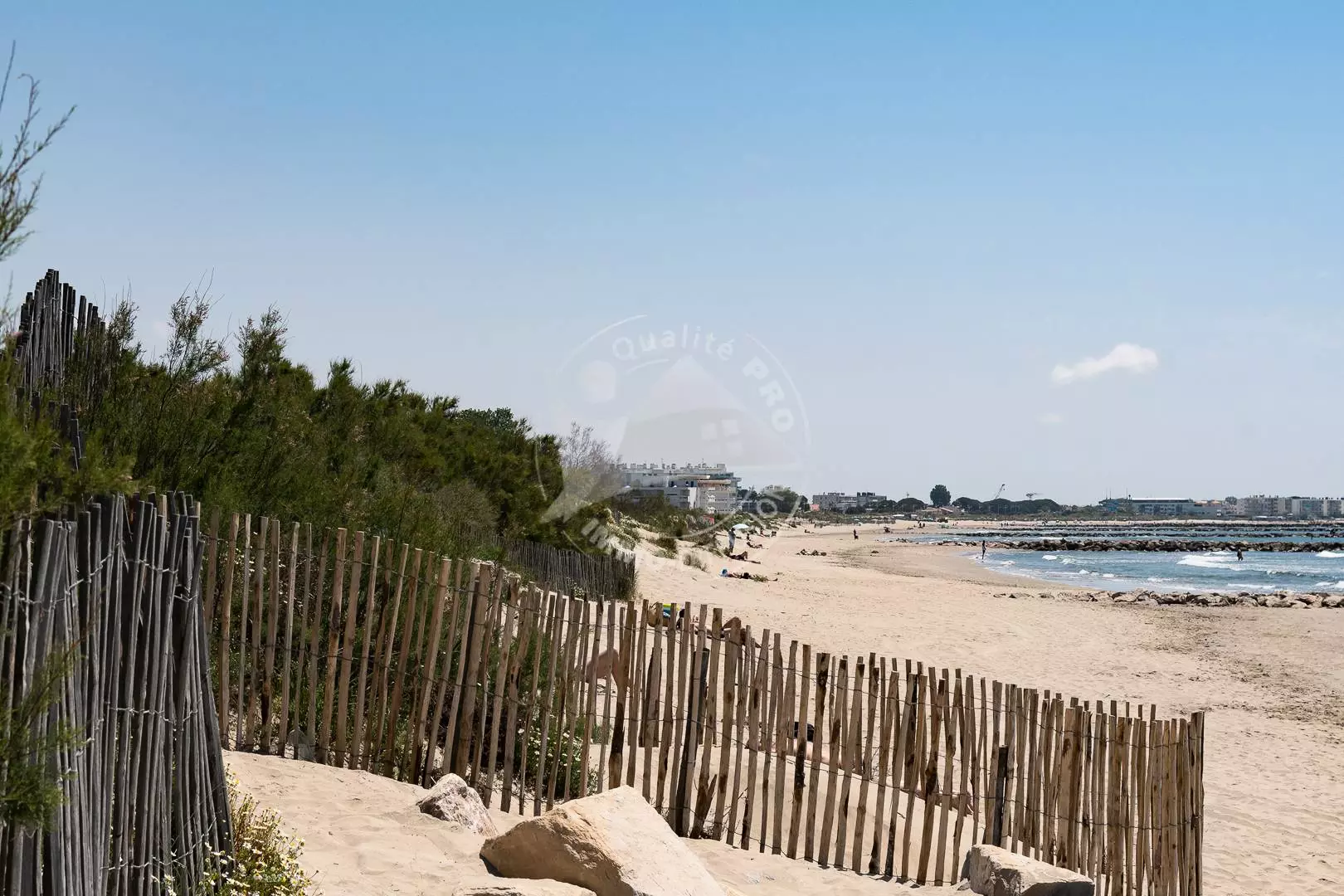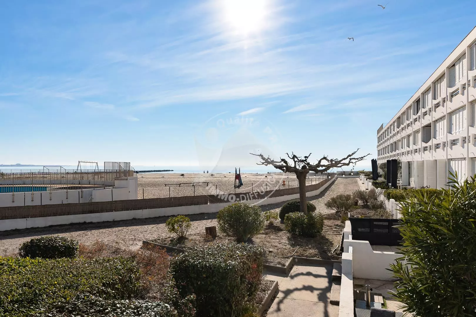 BOUCANET - In a luxury residence directly on the beach with swimming pool. P3 of approximately 55m², on the ground floor with a view of the swimming pool and the sea, composed of a bright living room with a 140 cm sofa bed, television, air conditioning and fiber wifi. A fully equipped kitchen (microwave, fridge/freezer, dishwasher, washing machine, oven), a bedroom with a 140 cm bed and air conditioning, a bedroom in a row with a 90 cm bunk bed (2 beds), air conditioning and TV. A bathroom and a separate toilet. Shared and secure parking. 2 km from the city center. Furnished and equipped, sleeps 6. Pets not allowed.