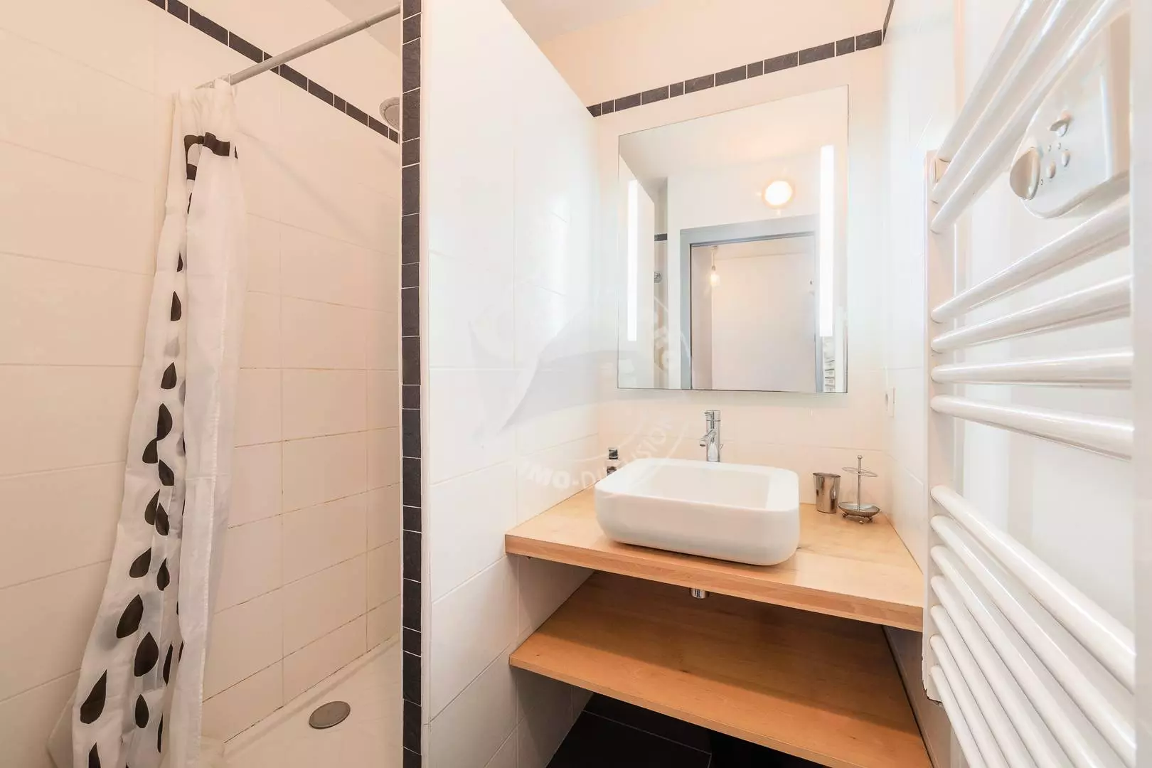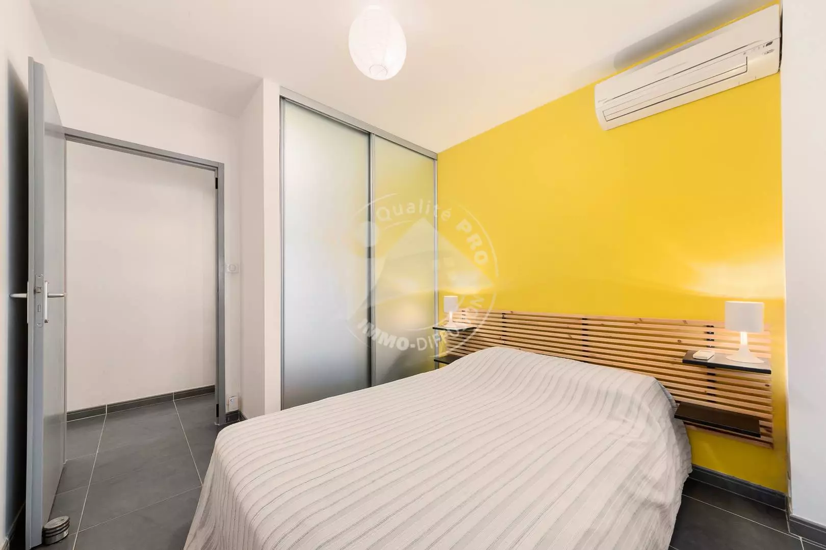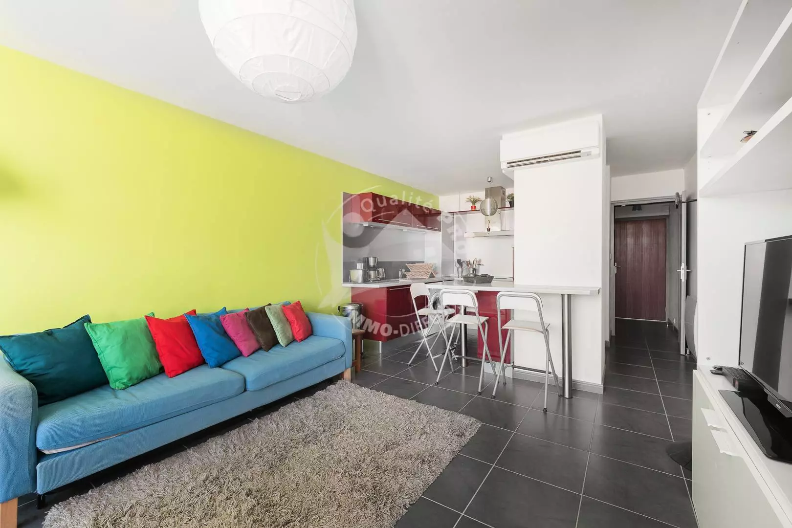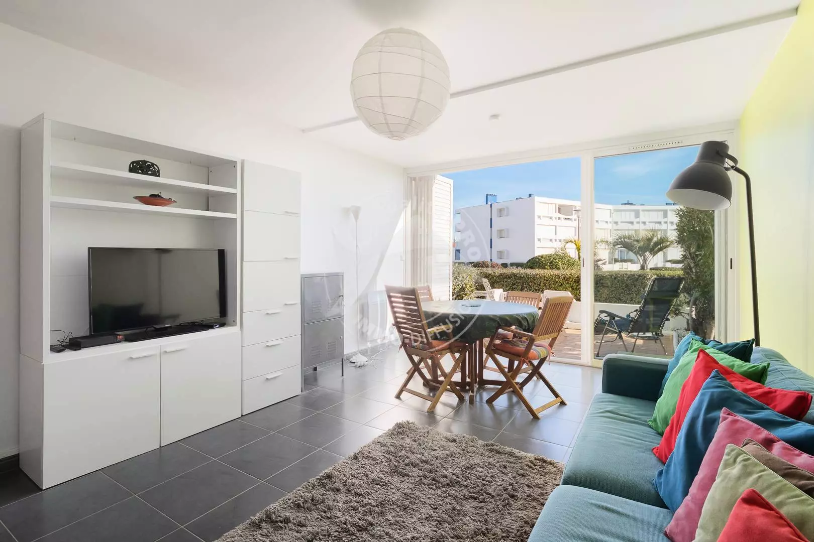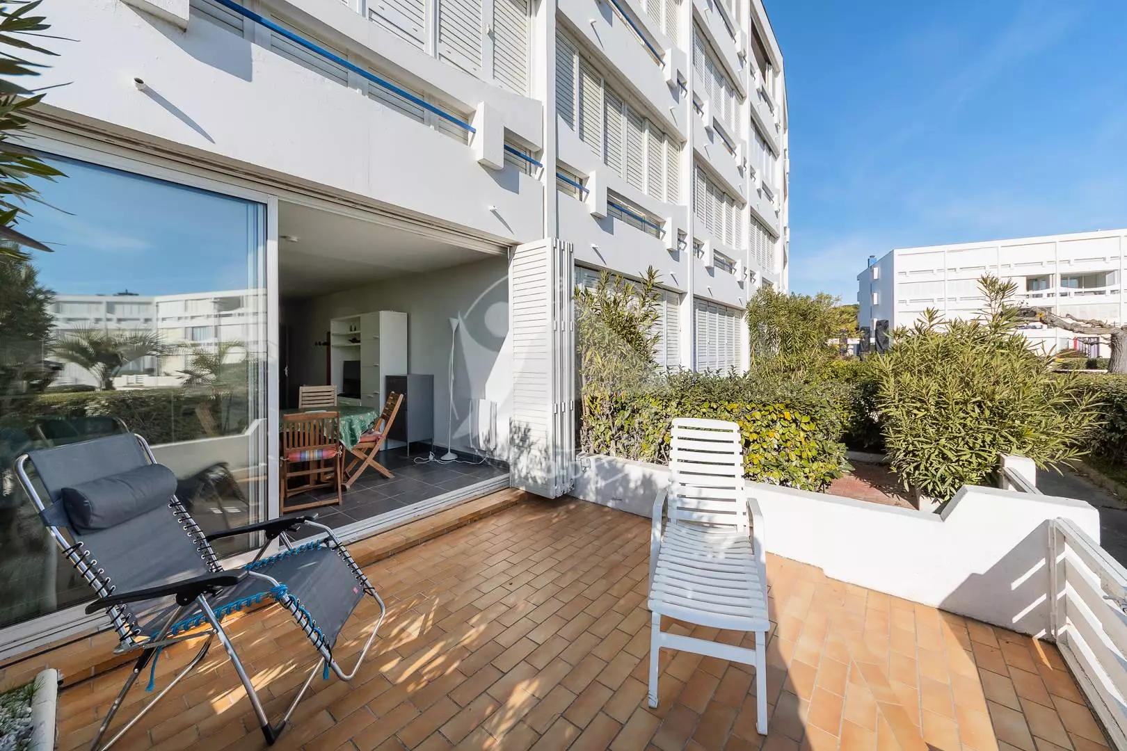 BOUCANET - In a luxury residence directly on the beach with swimming pool. P3 of approximately 55m², on the ground floor with a view of the swimming pool and the sea, composed of a bright living room with a 140 cm sofa bed, television, air conditioning and fiber wifi. A fully equipped kitchen (microwave, fridge/freezer, dishwasher, washing machine, oven), a bedroom with a 140 cm bed and air conditioning, a bedroom in a row with a 90 cm bunk bed (2 beds), air conditioning and TV. A bathroom and a separate toilet. Shared and secure parking. 2 km from the city center. Furnished and equipped, sleeps 6. Pets not allowed.