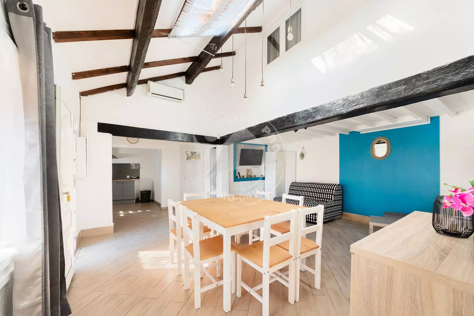 LEFT BANK - In a detached house. P2 of 60m² completely renovated on the ground floor composed of a living room with 2 sofa beds convertible into 140 cm, television, wifi and air conditioning. A fully equipped kitchen (microwave, fridge/freezer, oven, ceramic hob, dishwasher, washing machine). A bathroom with a toilet. On the 1st floor an attic bedroom with air conditioning and a double bed in 140 cm. A terrace of 12m² facing South/East with table and chairs and a shared garden with access serving the 2nd apartment opposite on the 1st floor. A 2