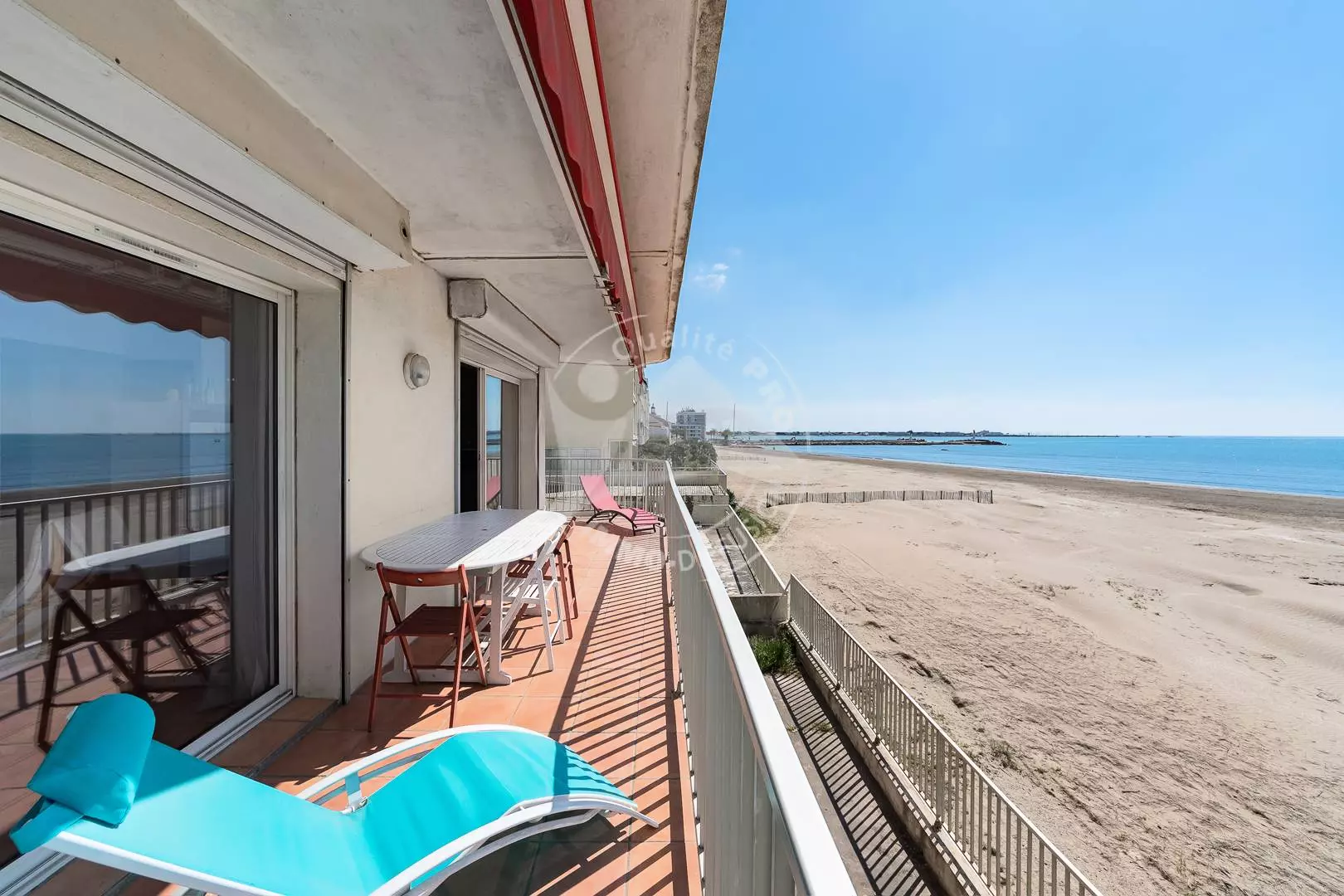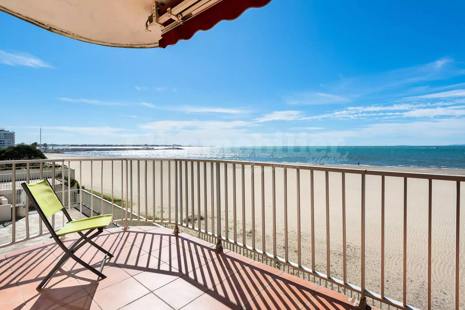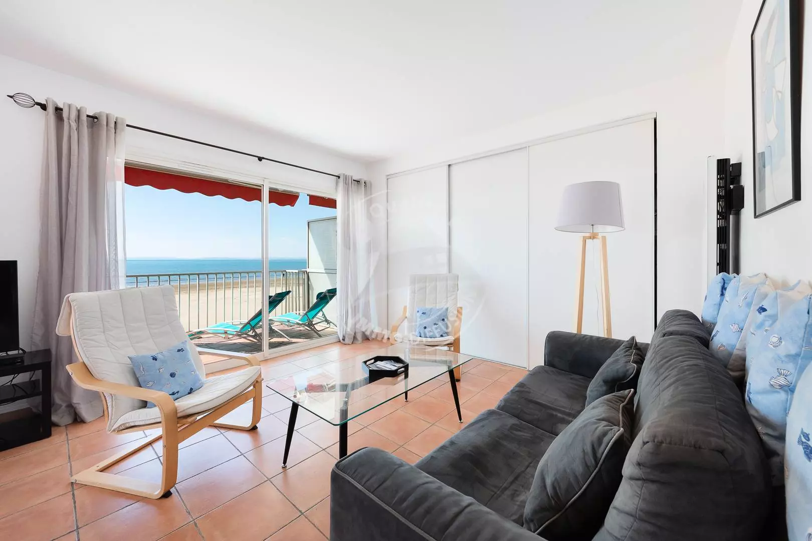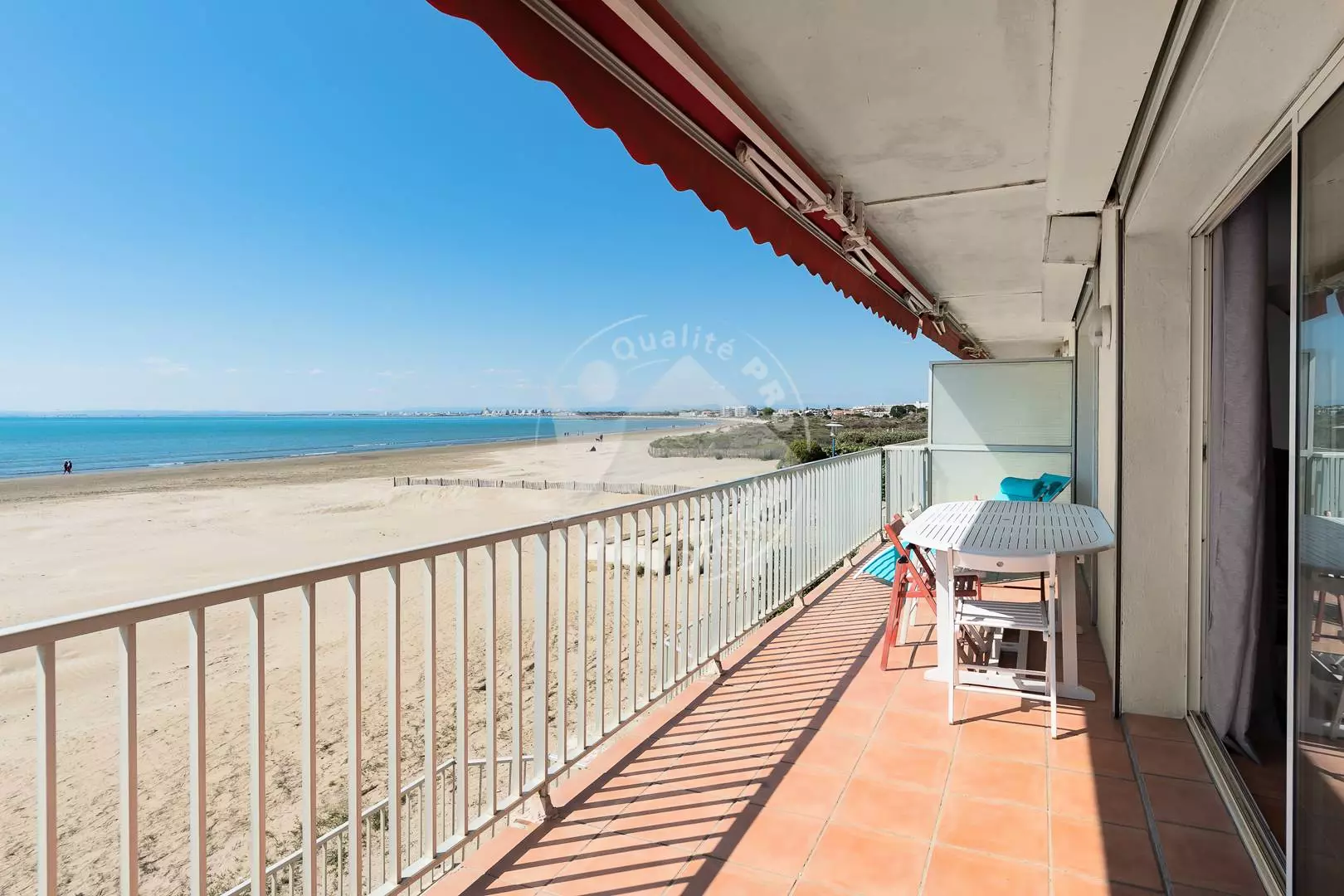 CITY CENTER - RIGHT BANK - P3 on the Beach, ideal location, facing the sea and 600 m from the city center. Composed of a living room with a magnificent sea view, sofa bed 140 cm, TV and wifi, fan, open equipped kitchen (oven, fridge/freezer, dishwasher, washing machine, microwave, coffee maker). Bedroom 1 with a double bed 160 cm. Bedroom 2 with a double bed 140 cm, a shower room and a separate toilet. Large corner terrace of 21m² with electric awning. Secure residence. 1st floor. Furnished and equipped for 6 people. Possibility to rent a garage in the basement nearby at an additional cost.