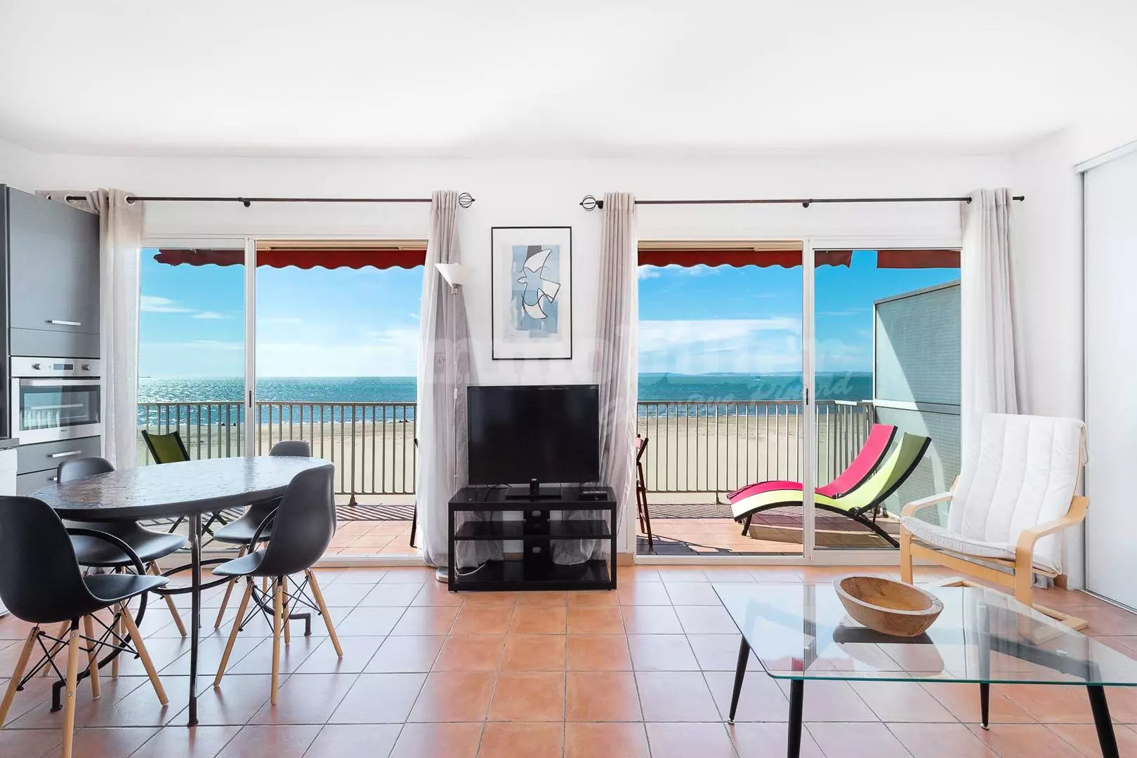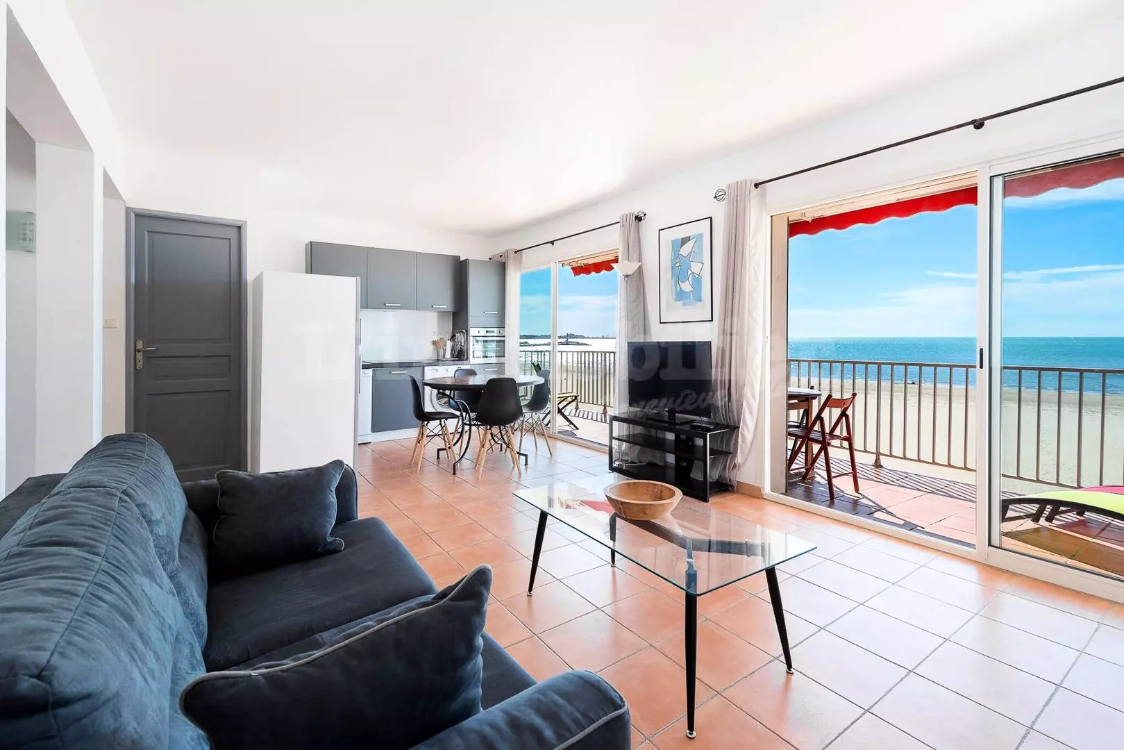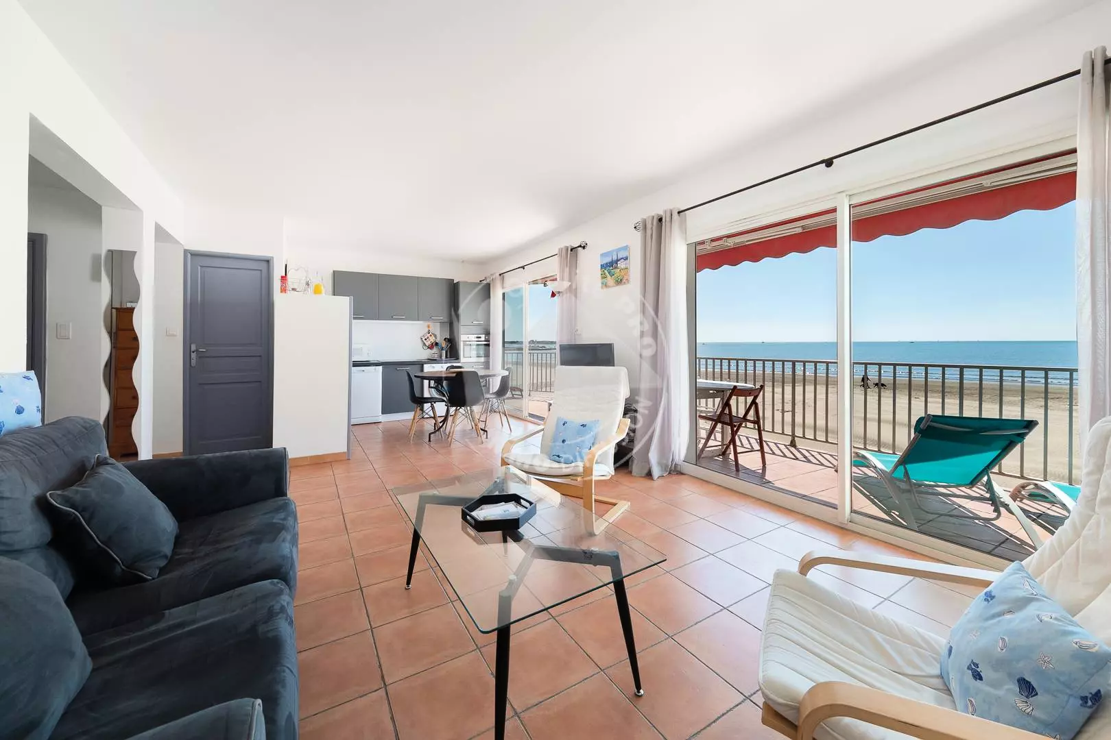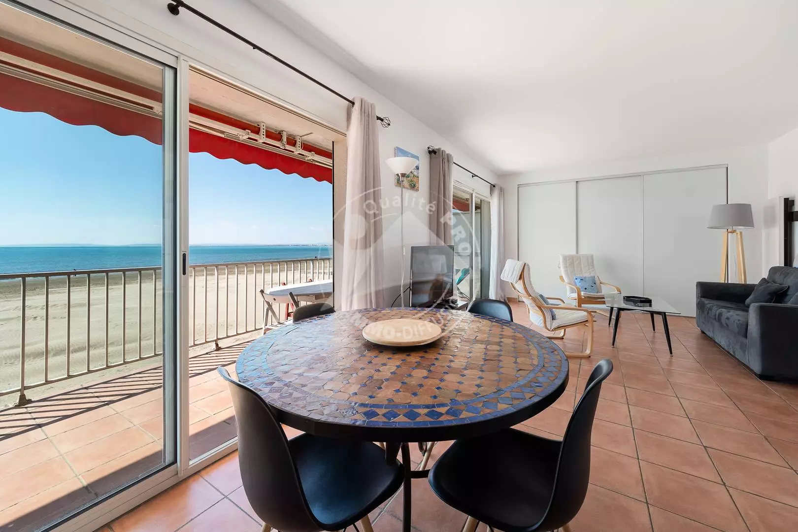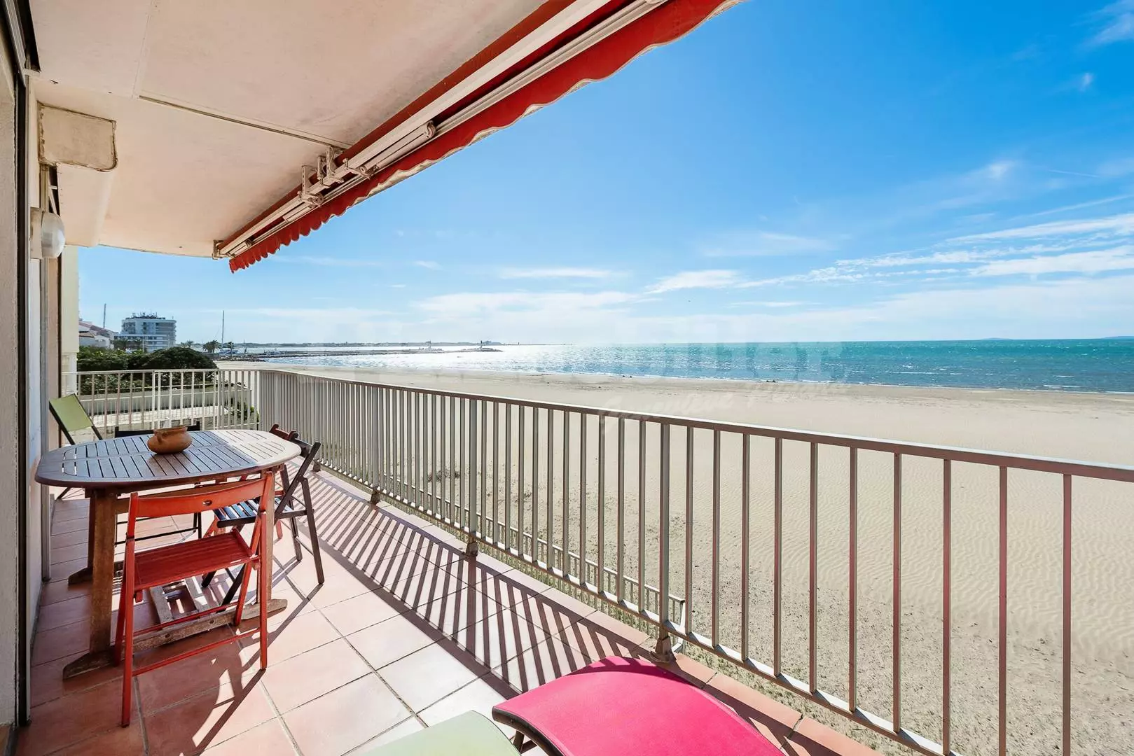 CITY CENTER - RIGHT BANK - P3 on the Beach, ideal location, facing the sea and 600 m from the city center. Composed of a living room with a magnificent sea view, sofa bed 140 cm, TV and wifi, fan, open equipped kitchen (oven, fridge/freezer, dishwasher, washing machine, microwave, coffee maker). Bedroom 1 with a double bed 160 cm. Bedroom 2 with a double bed 140 cm, a shower room and a separate toilet. Large corner terrace of 21m² with electric awning. Secure residence. 1st floor. Furnished and equipped for 6 people. Possibility to rent a garage in the basement nearby at an additional cost.