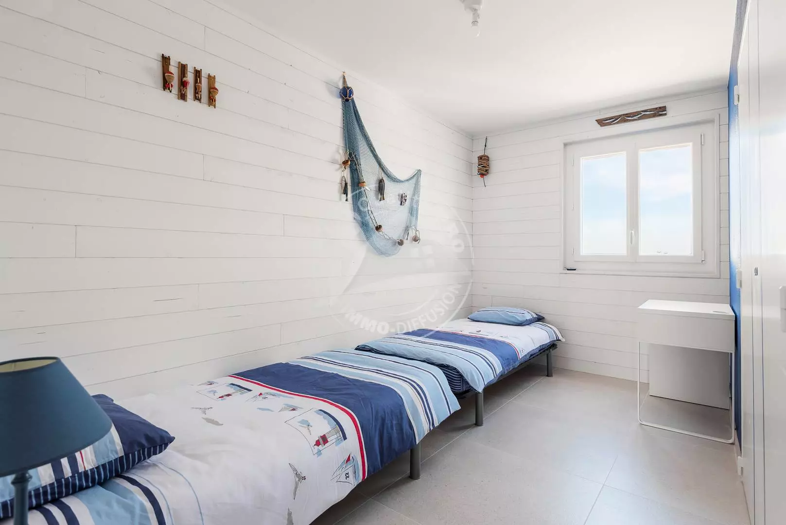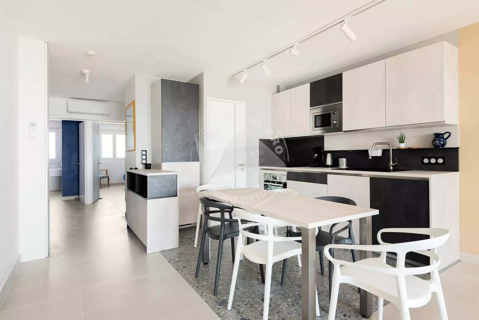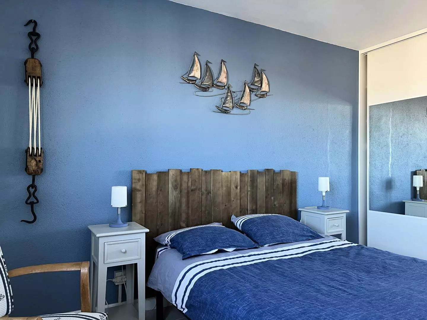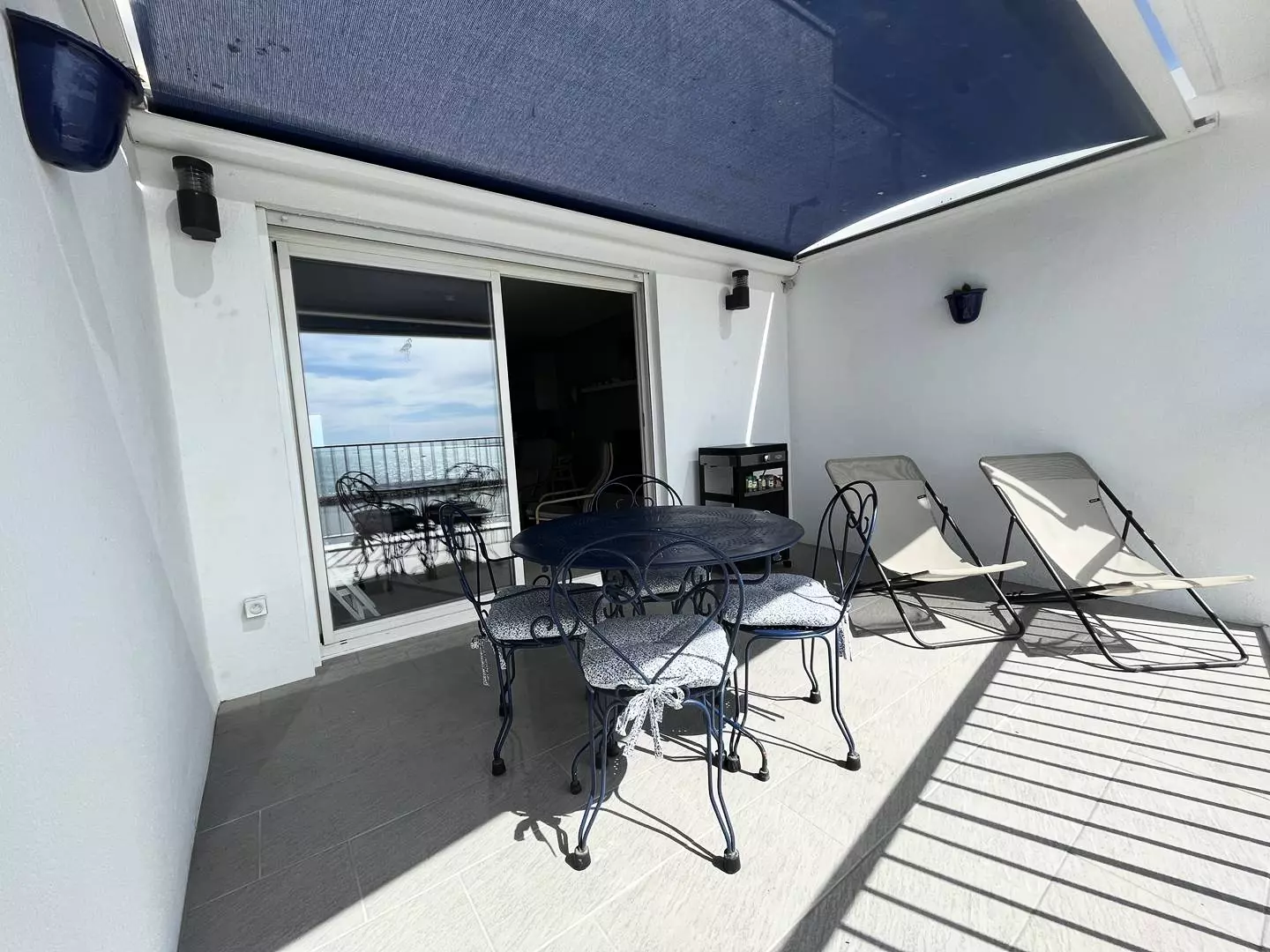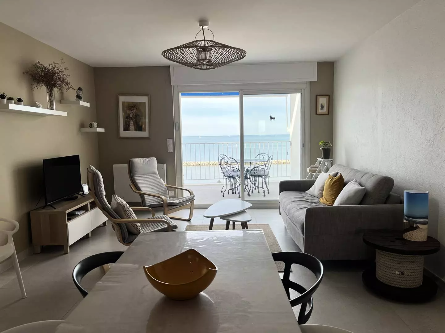 CITY CENTER - 3* Furnished tourist accommodation - Magnificent 3-room apartment of 65m² completely renovated, facing the sea in the City Center, on the 5th and last floor with elevator (Small elevator 40cm/100cm). Spacious and bright living room (TV, air conditioning, wifi) with 140cm sofa bed opening onto a 12m² terrace with furniture, electric plancha, awning and a magnificent view of the sea and the entire bay of Grau du Roi. A fully equipped kitchen (dishwasher, microwave, fridge/freezer, oven), a bedroom with a 160cm double bed, air conditioning and mosquito net, a bedroom with 2 90cm single beds, air conditioning and mosquito net. A bathroom with washing machine and a separate toilet. Come and enjoy this superb apartment in the heart of the City Center, with all the water activities and shops nearby. Municipal parking nearby. Pets are not allowed. Furnished and equipped for 6 people.