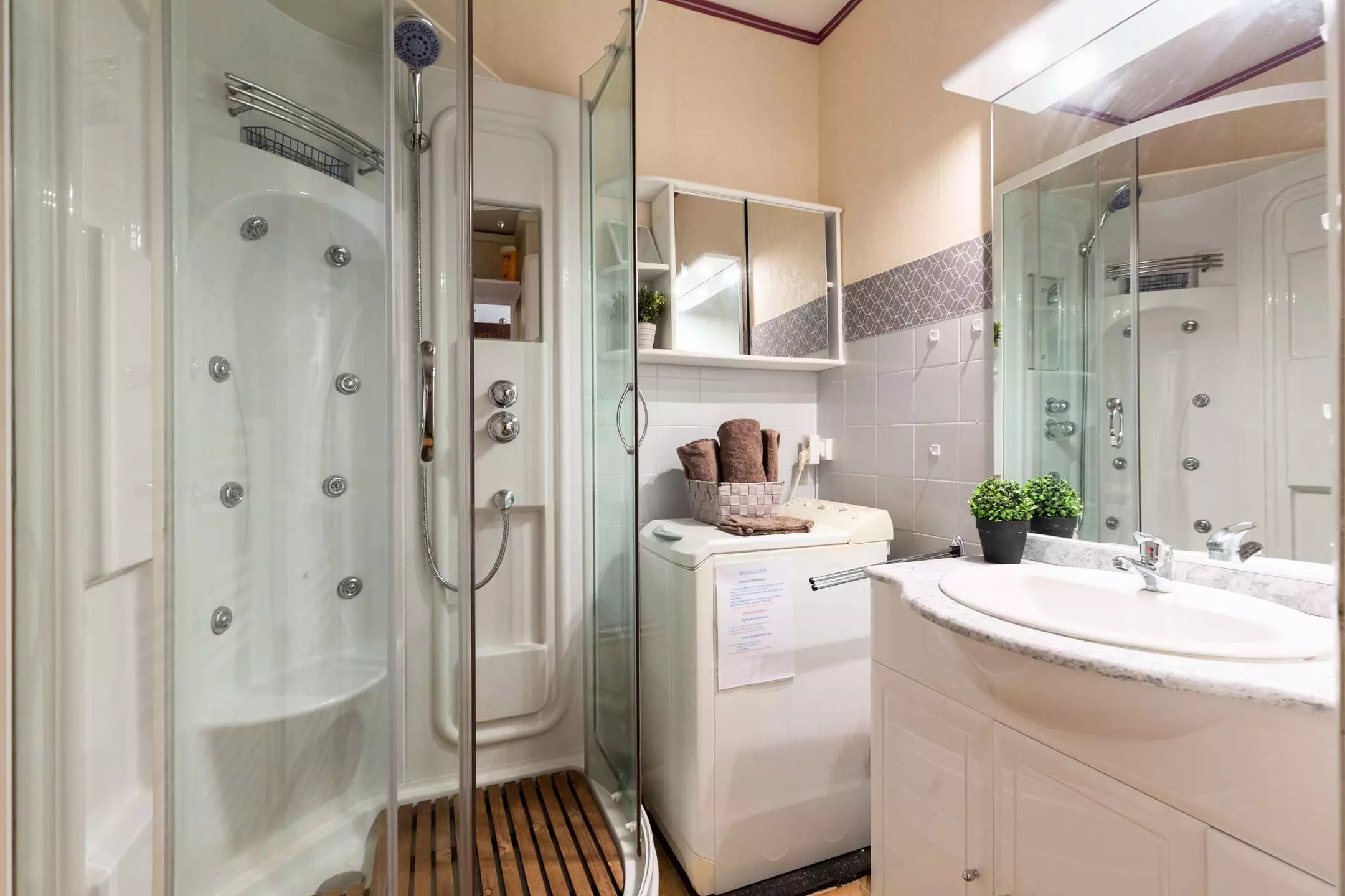 Shower room, sink, toilet, living room with double sofa bed + TV,