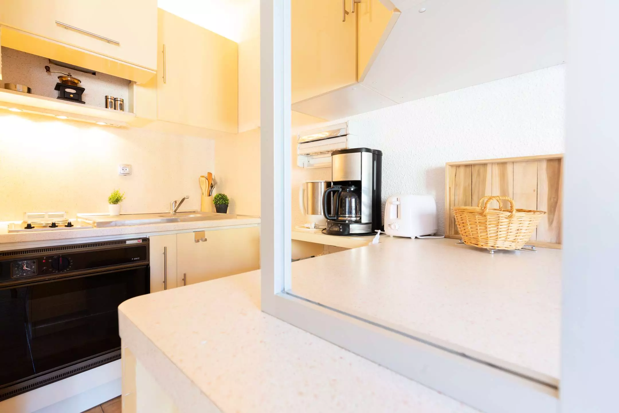 Equipped kitchenette opening onto a cozy and pleasant living room