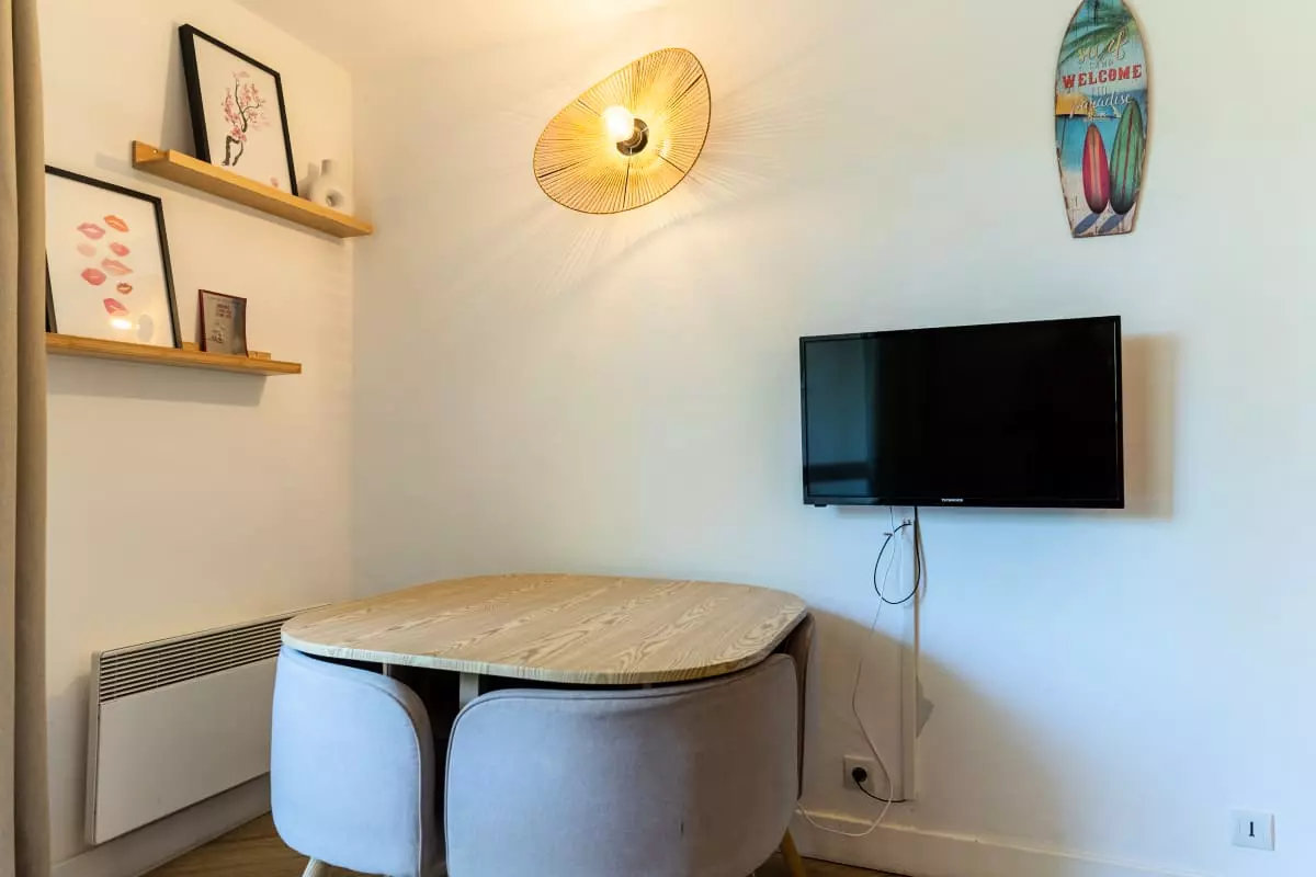 a living room with a new 1.60m sofa bed (new and very comfortable), dining area and open kitchen. Dishwasher. TV. Coffee maker with filters