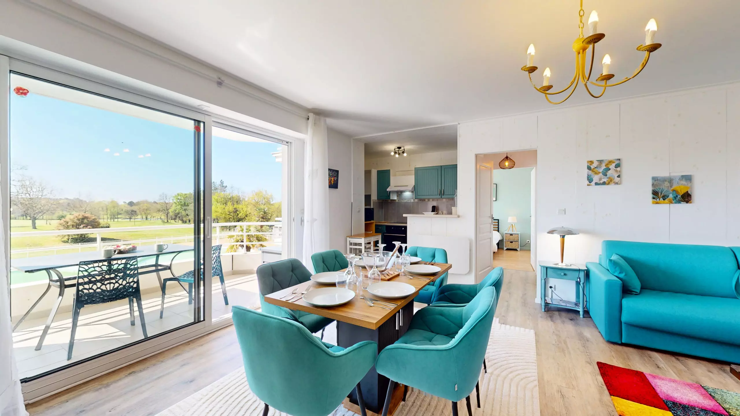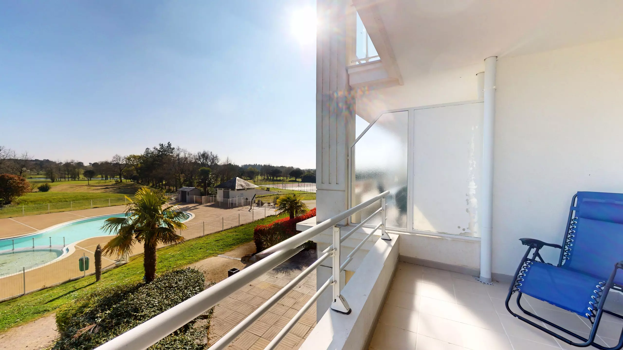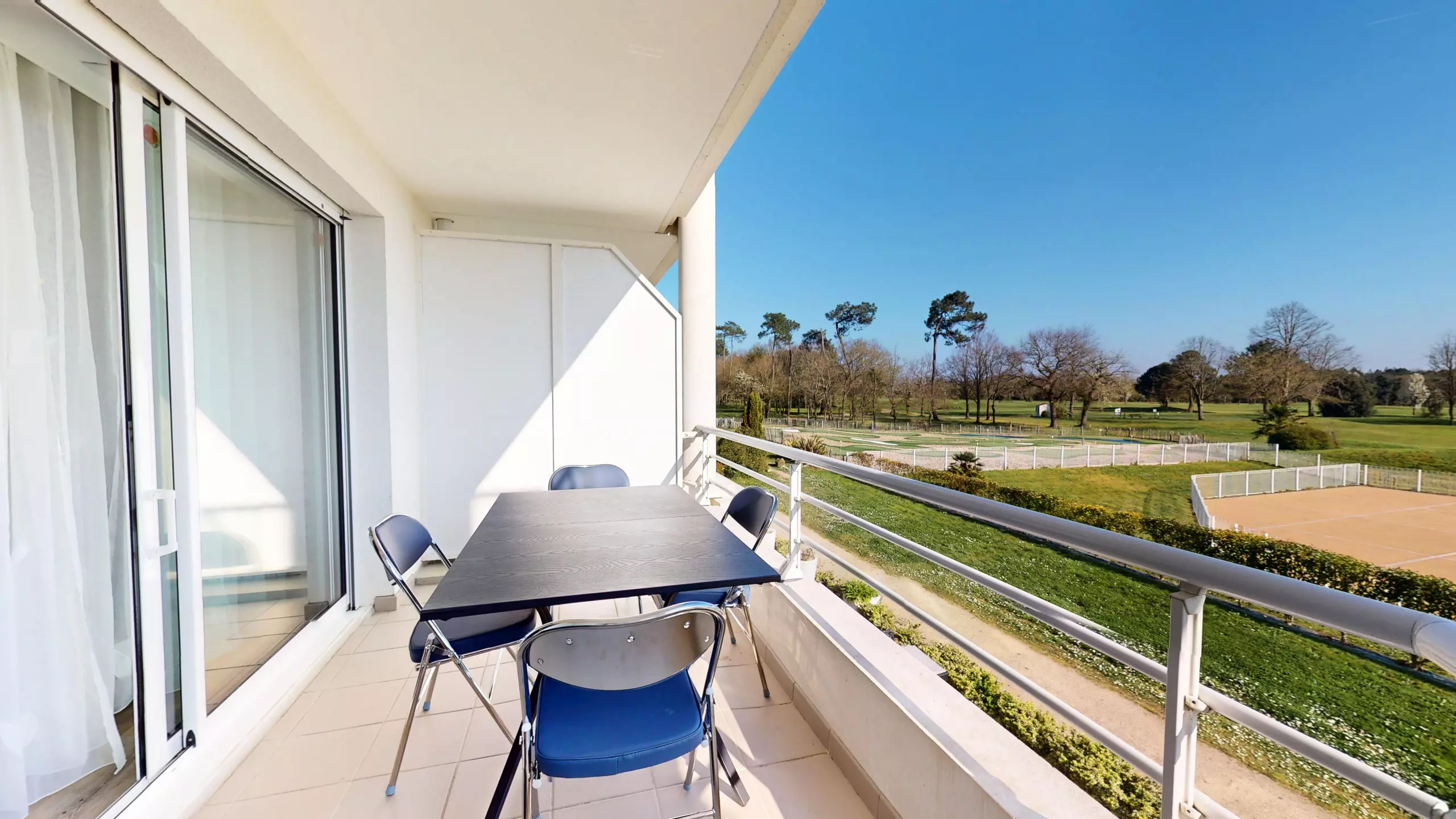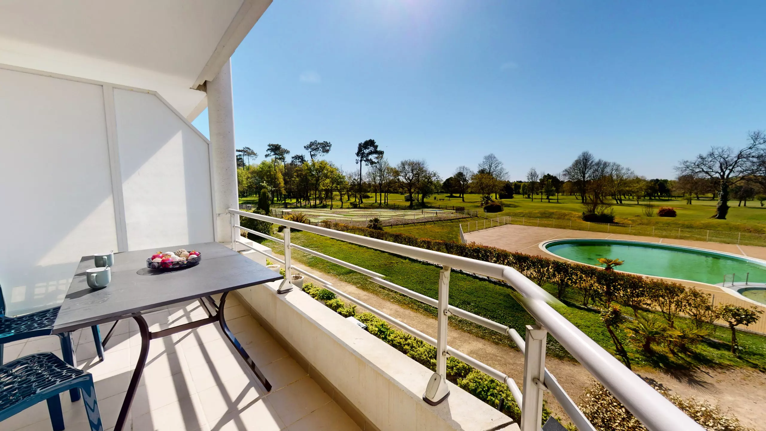 - A comfortable living room with sofa bed, opening onto a large furnished balcony facing the green and the swimming pool.