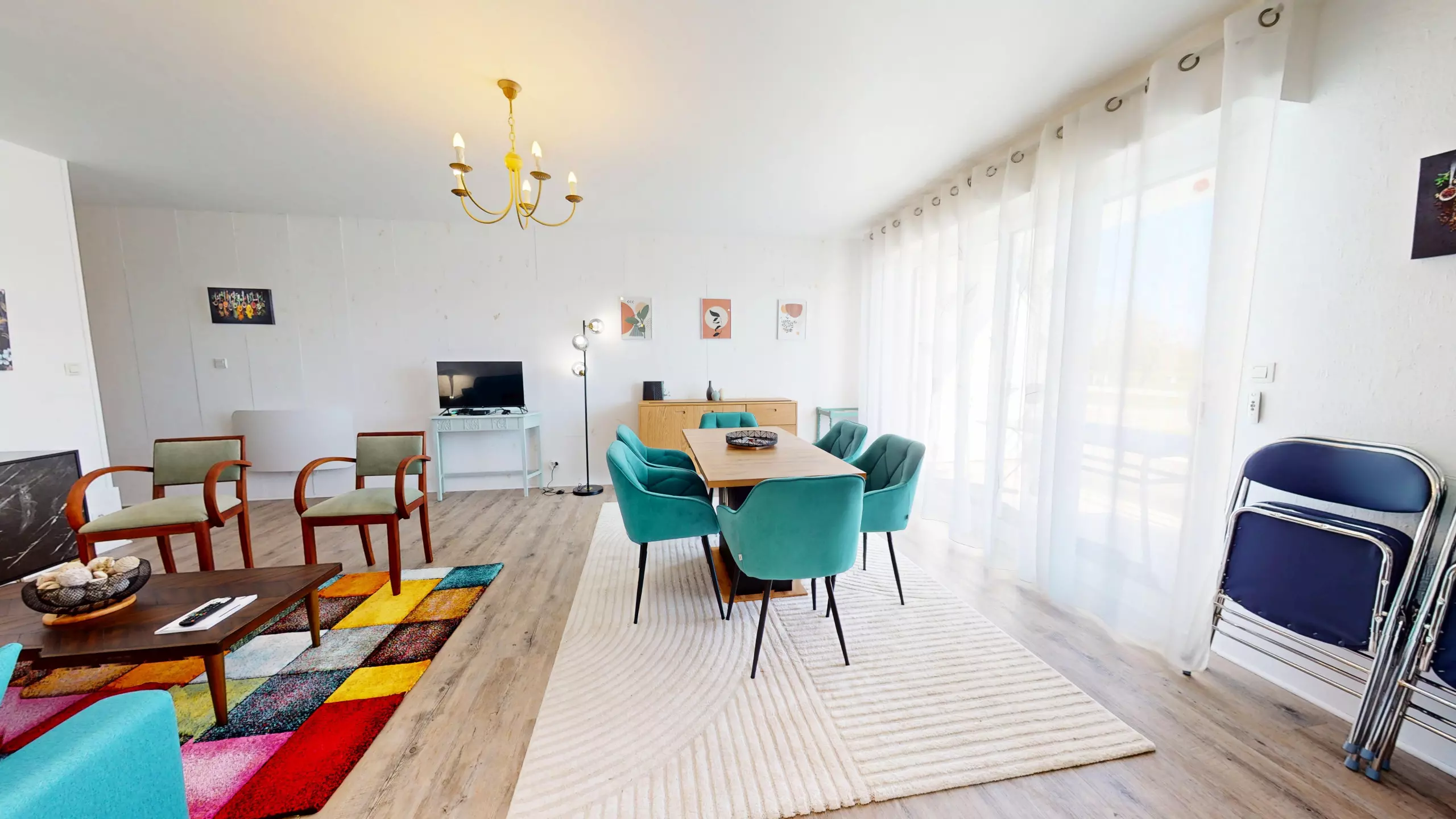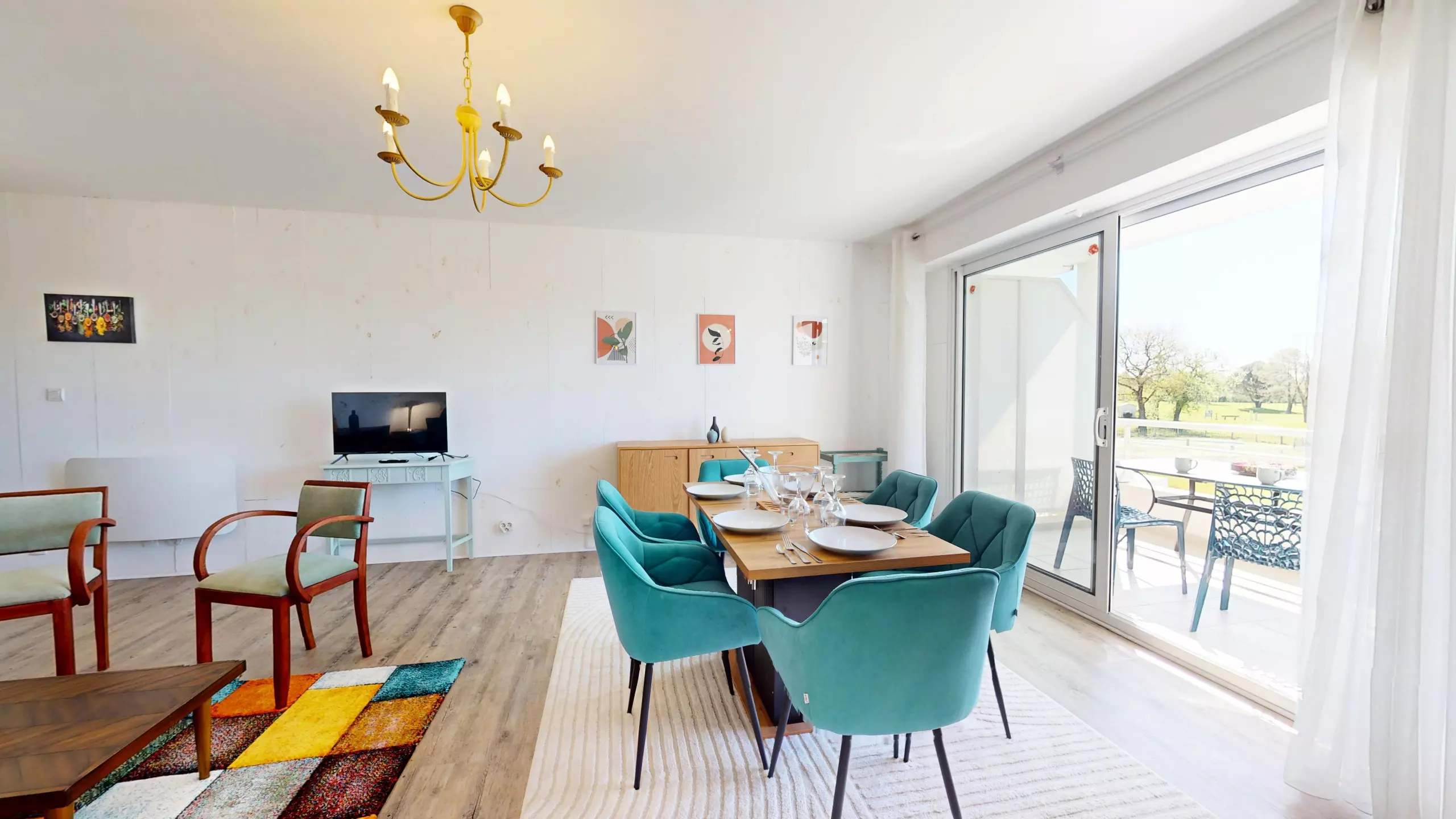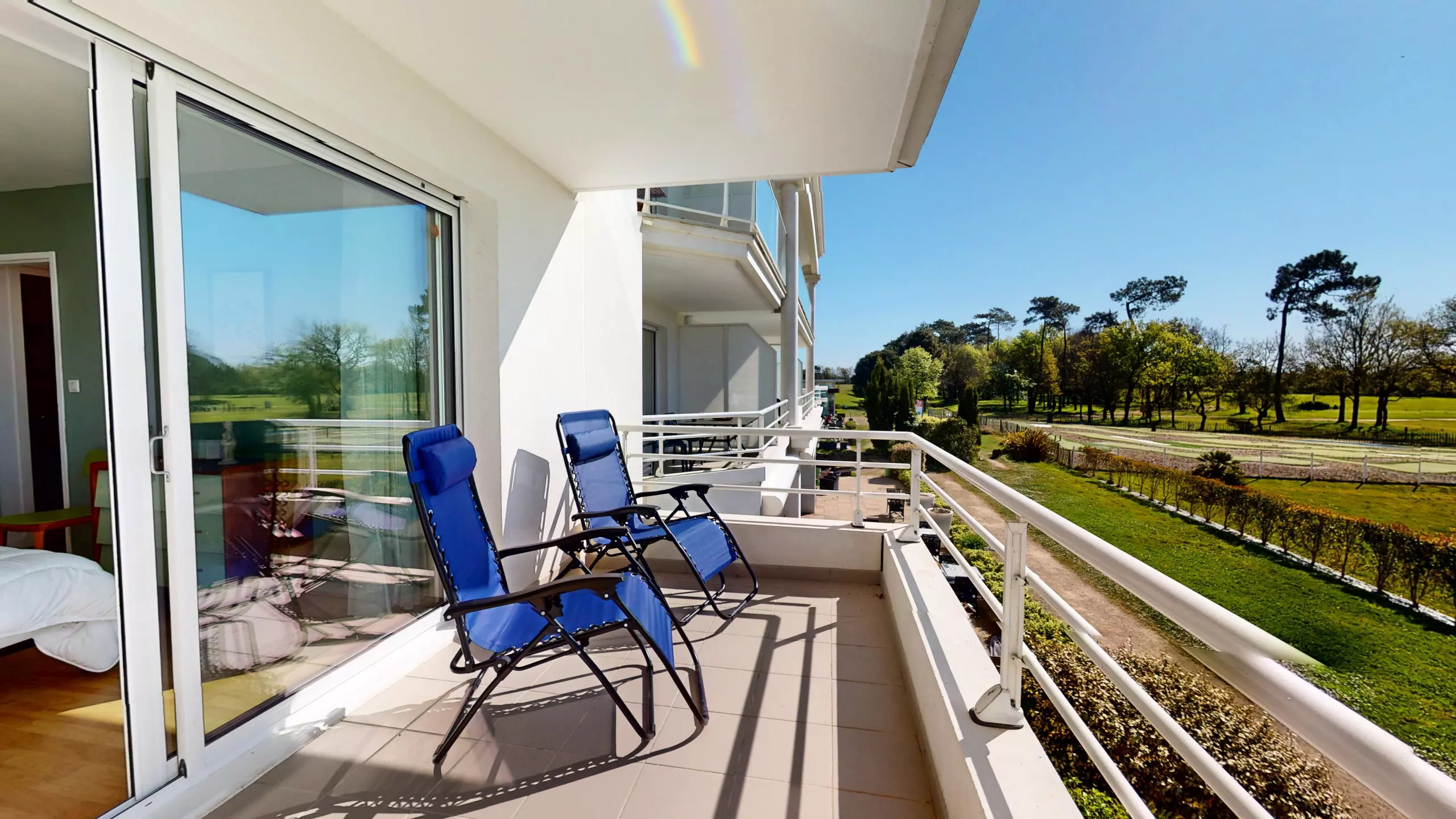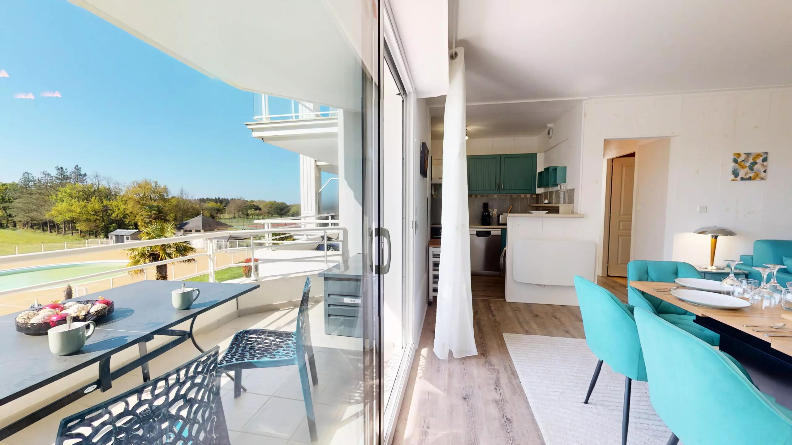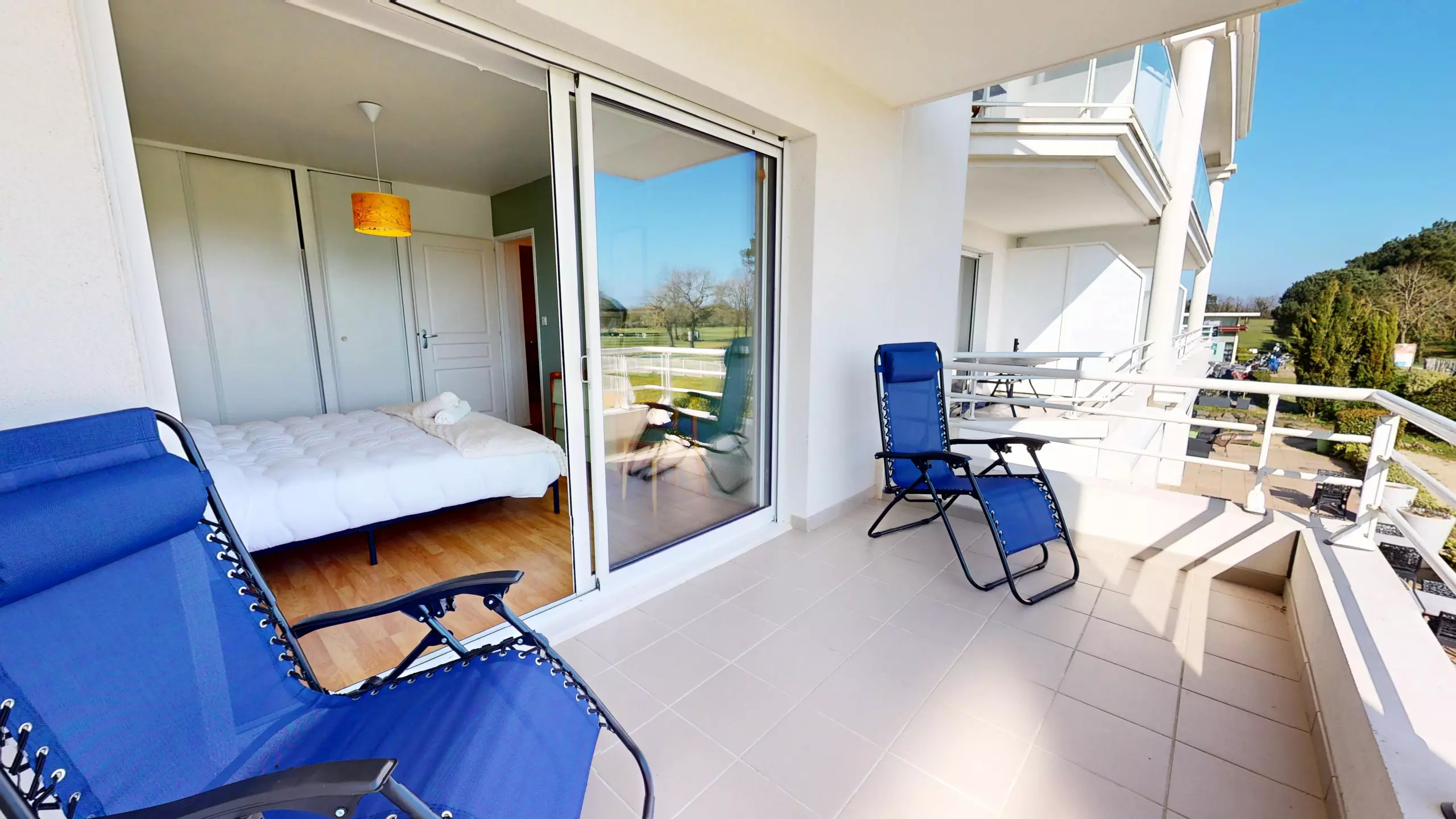 - A comfortable living room with sofa bed, opening onto a large furnished balcony facing the green and the swimming pool.